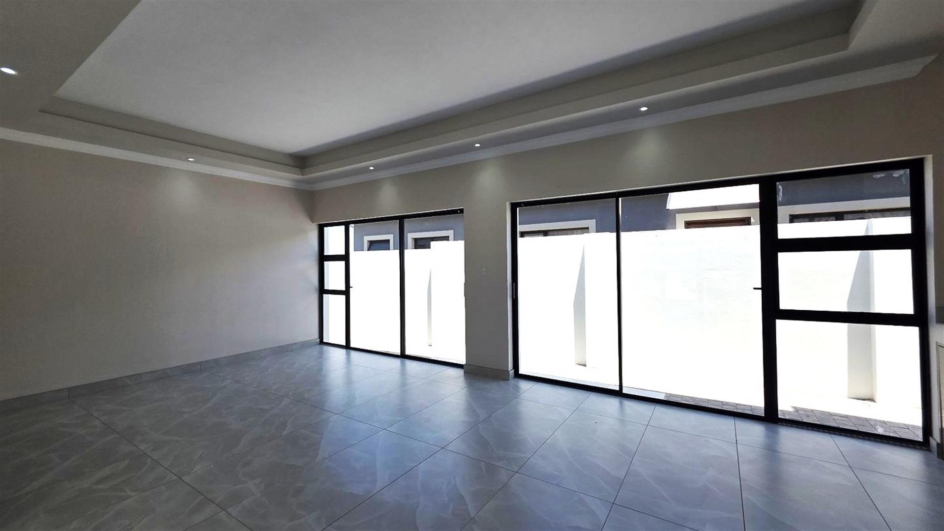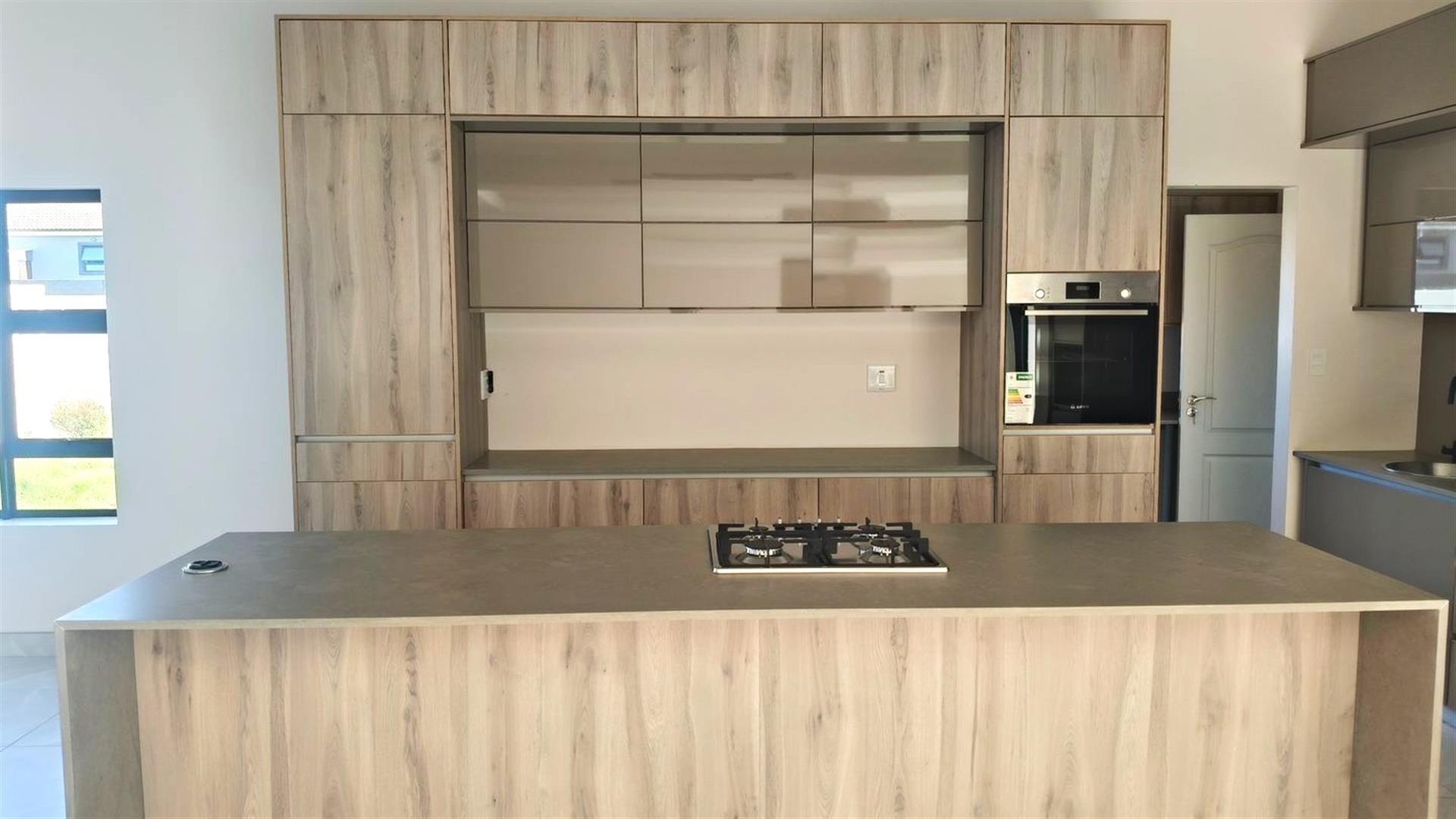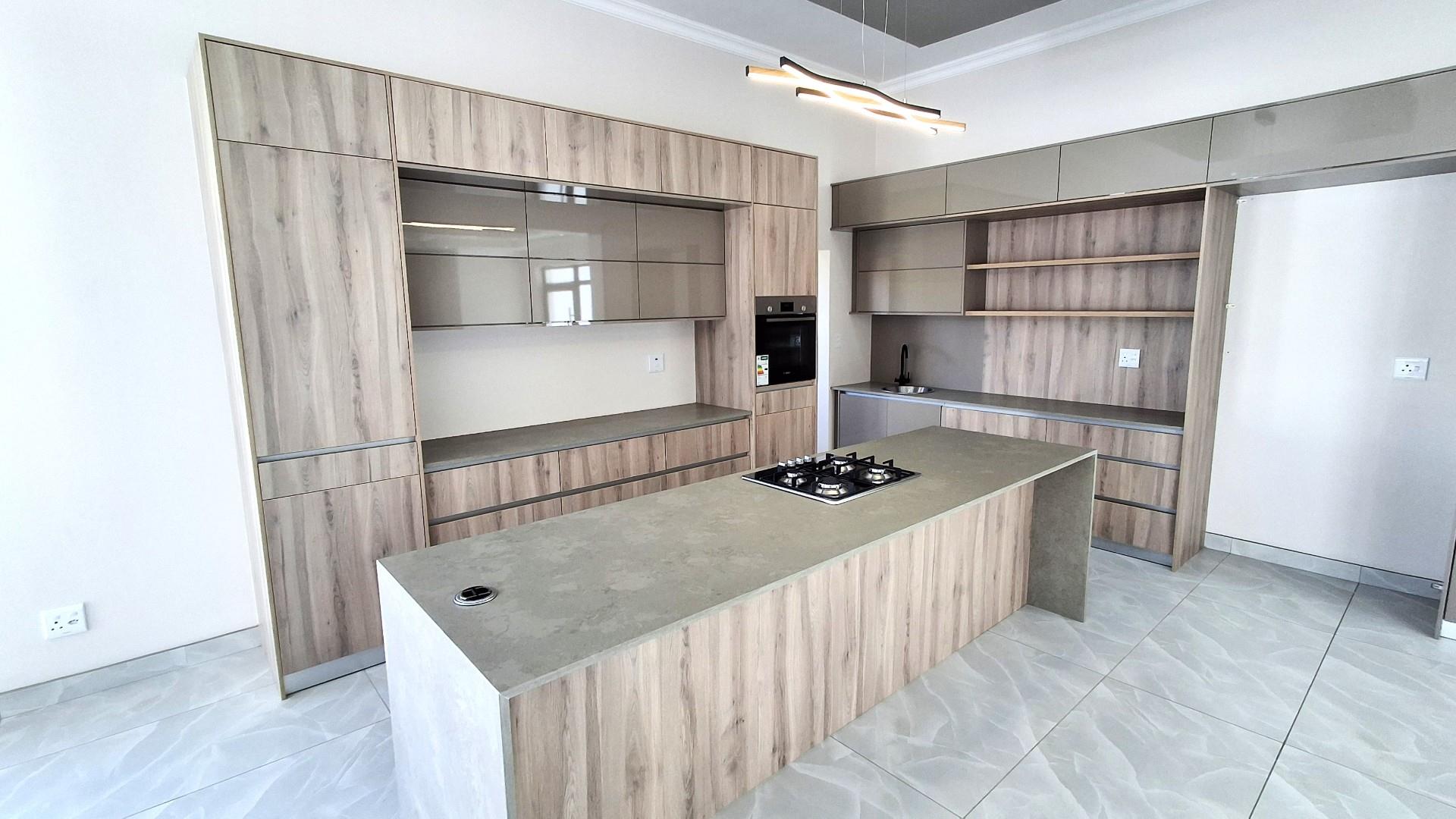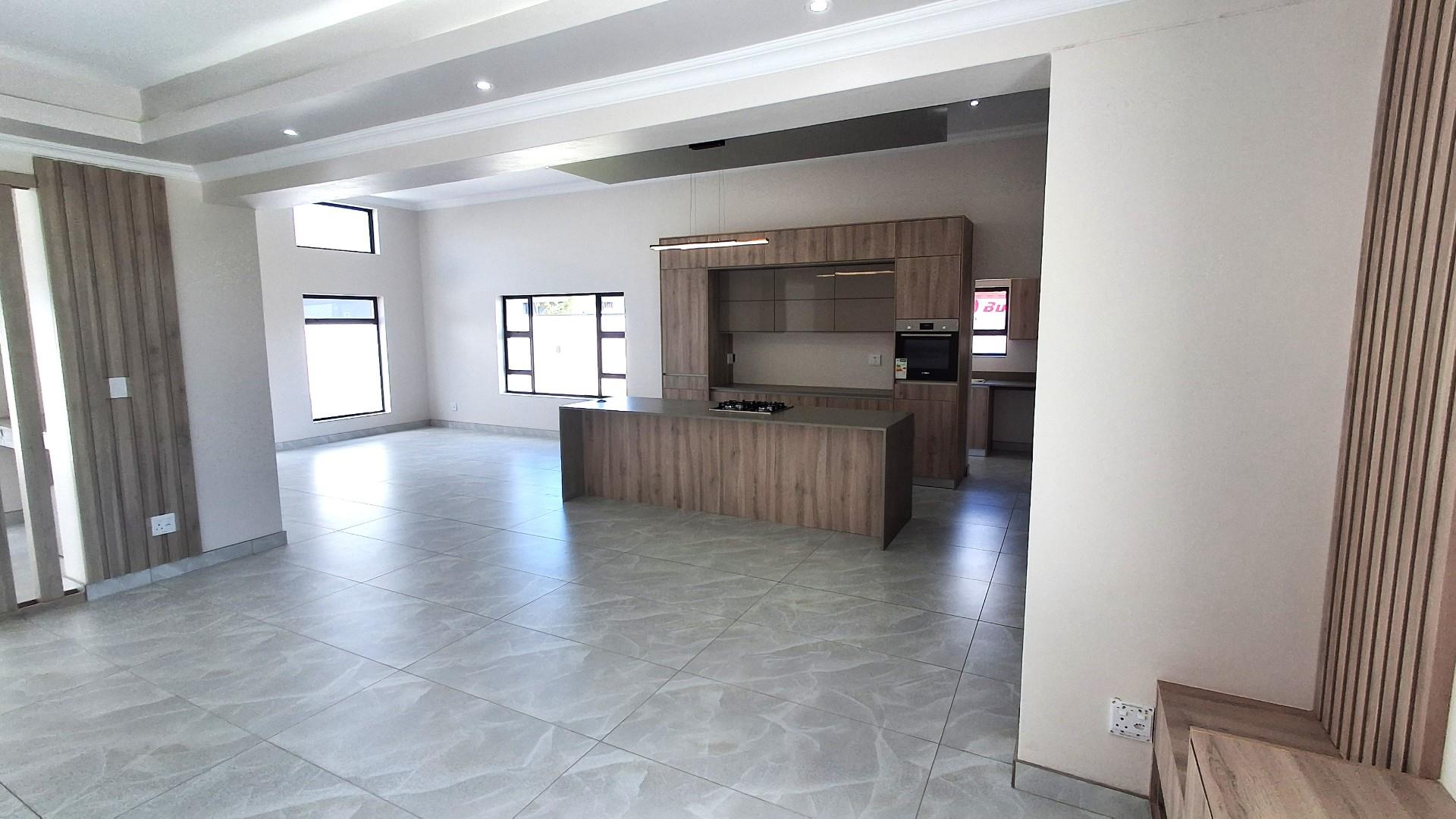 The open-plan living area flows between the lounge, dining space, and dedicated indoor braai/entertainment room, creating an inviting environment for everyday living and entertaining. The designer kitchen features soft-touch cupboards, modern finishes, a gas stove, and a separate scullery.