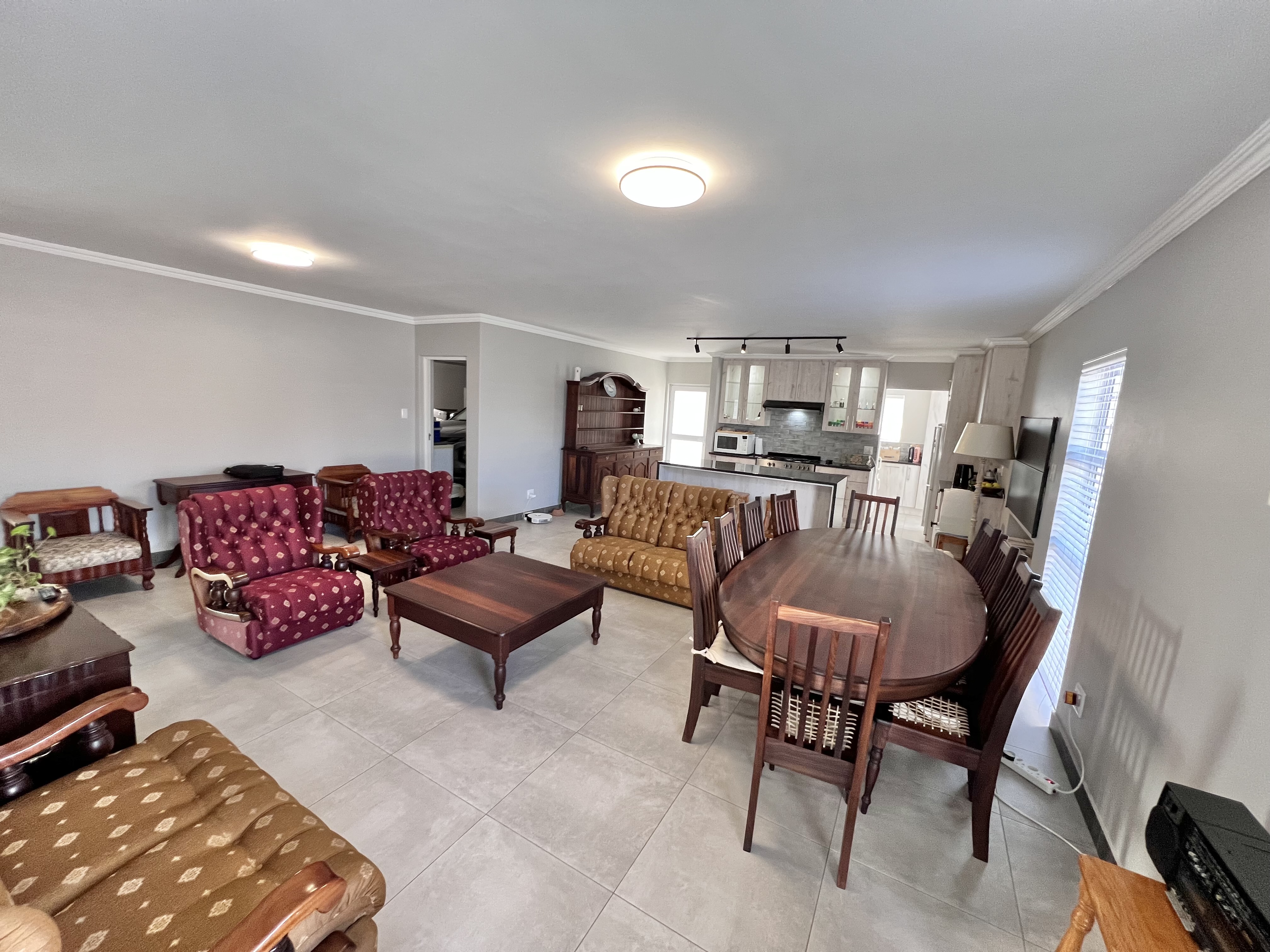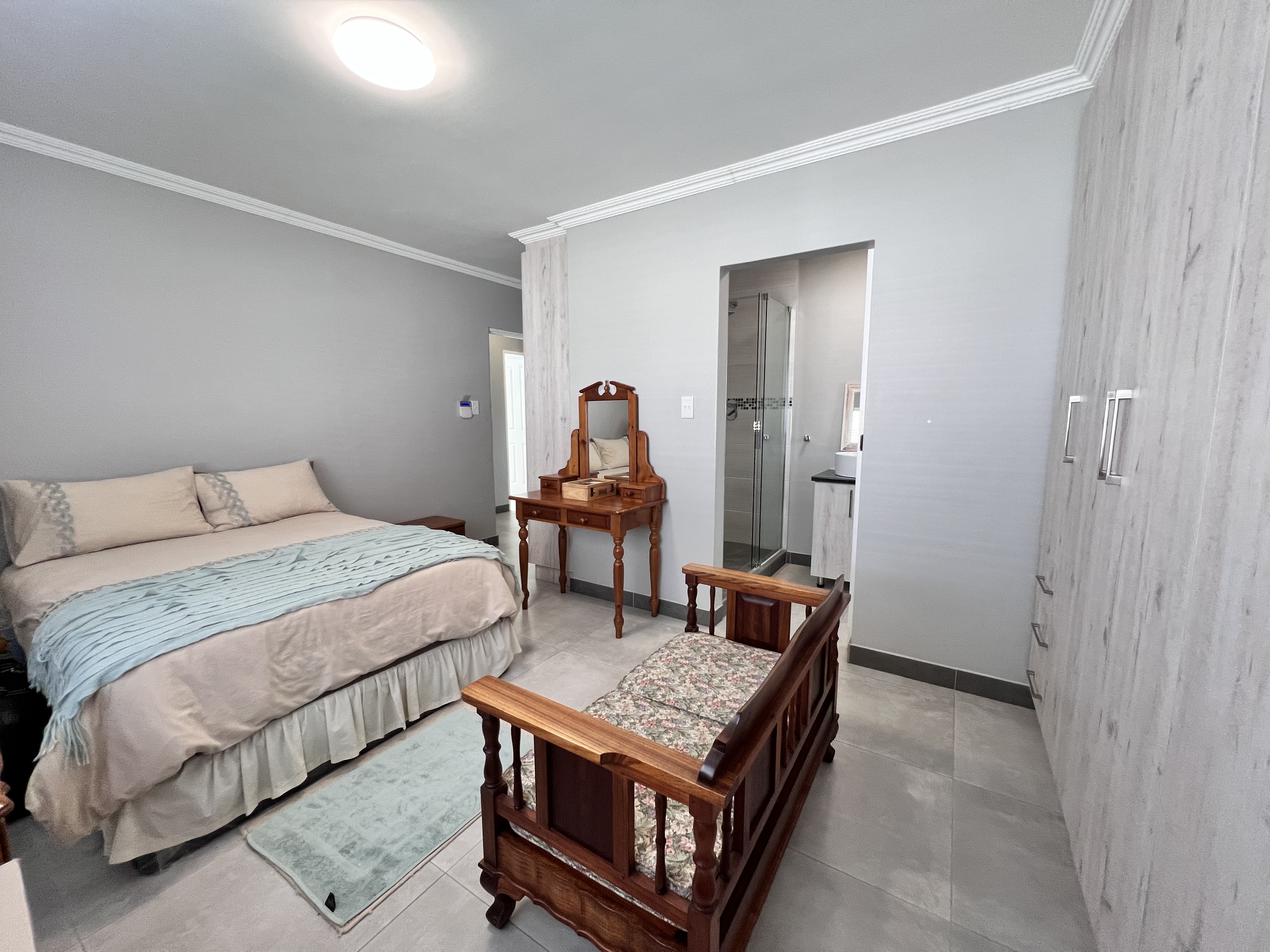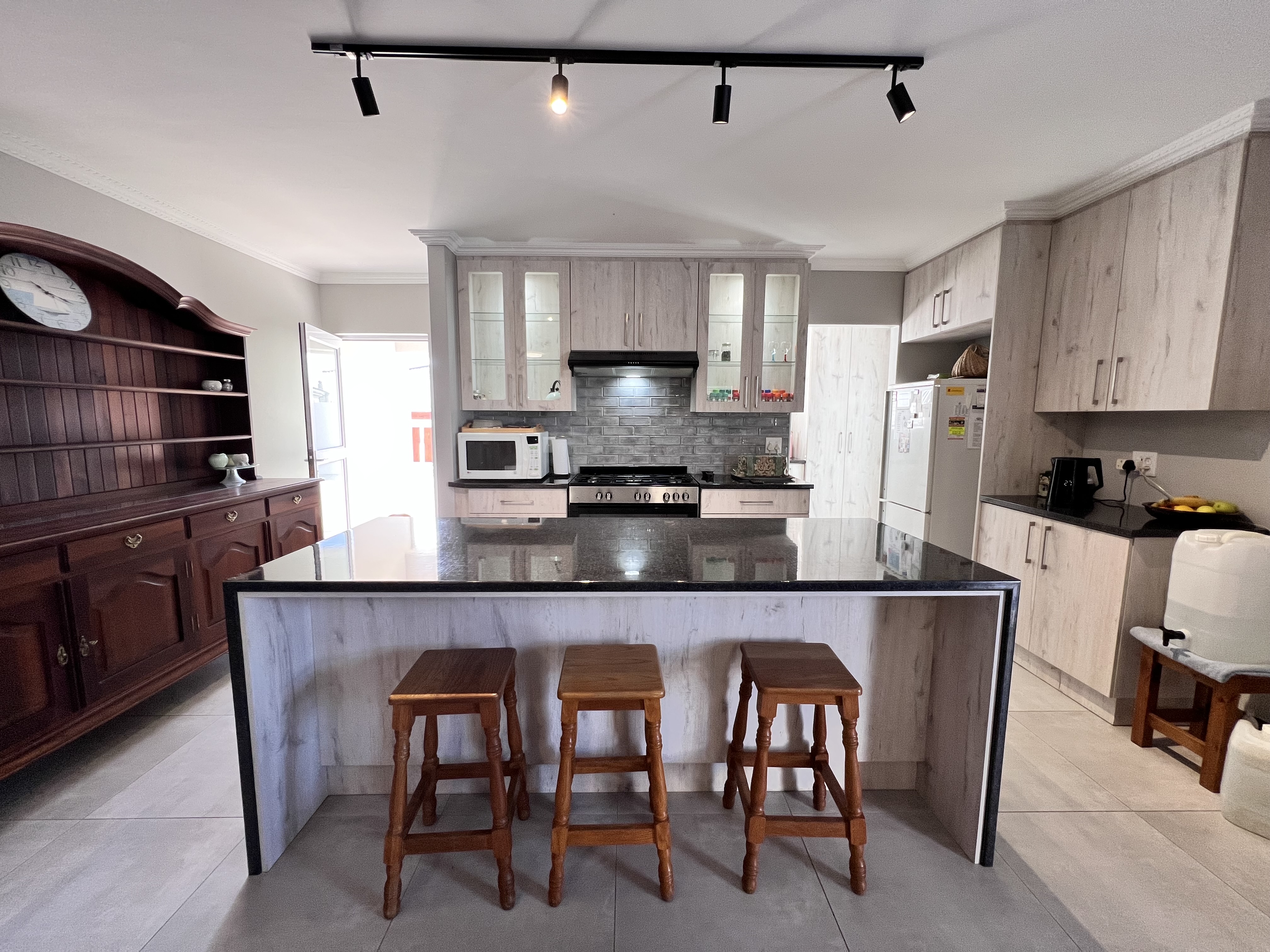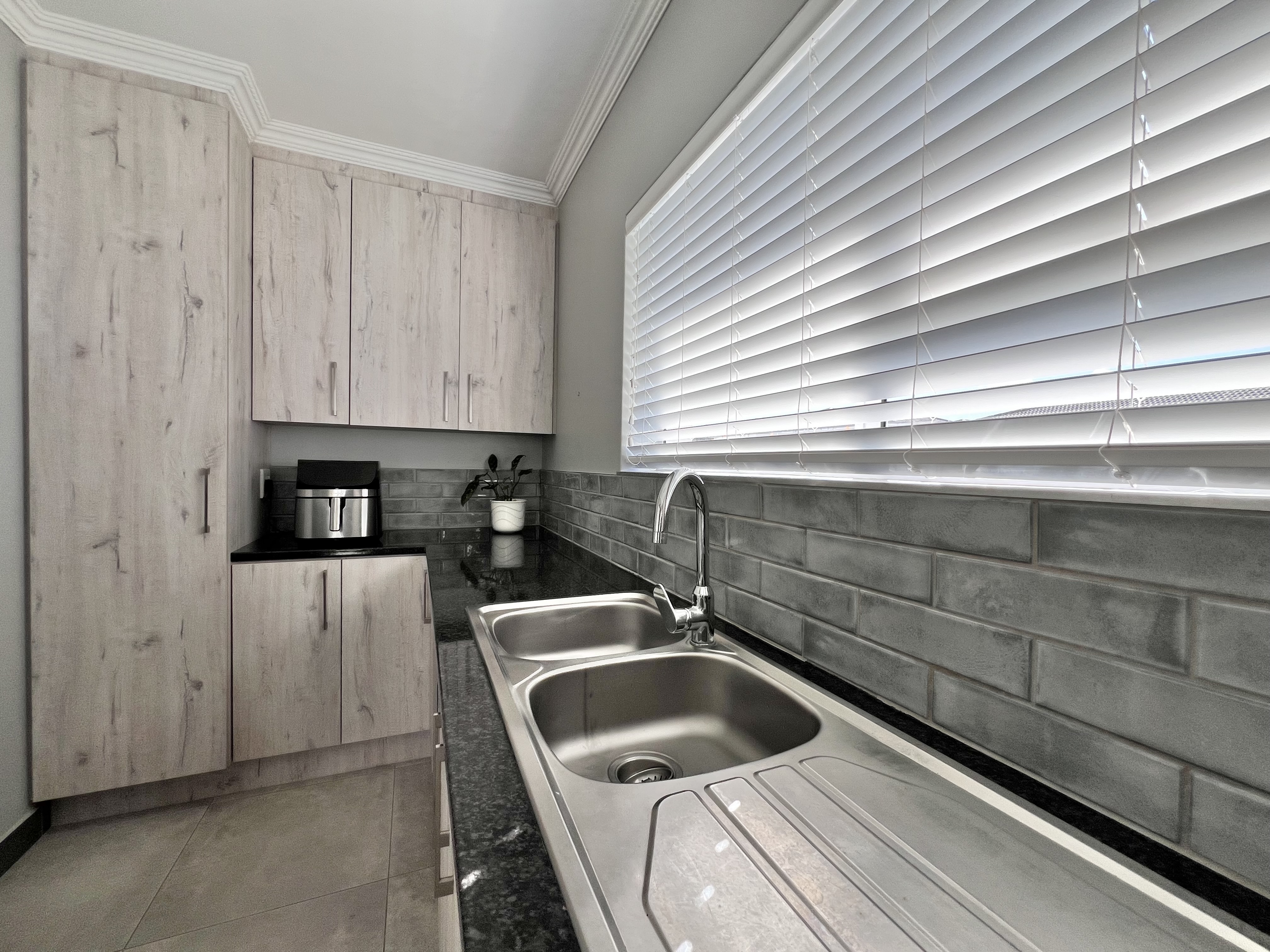 This open floor plan property is located in a popular street and offers easy access to all major routes in and out of town. The front entrance, secure with trellisdoors invites you into the open plan living space including the kitchen, dining and lounge area. A separate spacious scullery has ample built-in cupboards, double sink and door leading to outside, also fitted with trellisdoors. The kitchen is fitted with a loose standing Defy 6-plate gas burner stove (electric oven), modern back splash, centre island and a coffee or bar station nook next to the indoor braai. The bedrooms comfortably fit queen sized extra length beds with enough space for bedside tables. The master comes with an en suite shower, basin and toilet. The two guest bedrooms share a tastefully designed full bathroom. The double automated garage is tiled and is fitted with plumbing for your washing machine.
