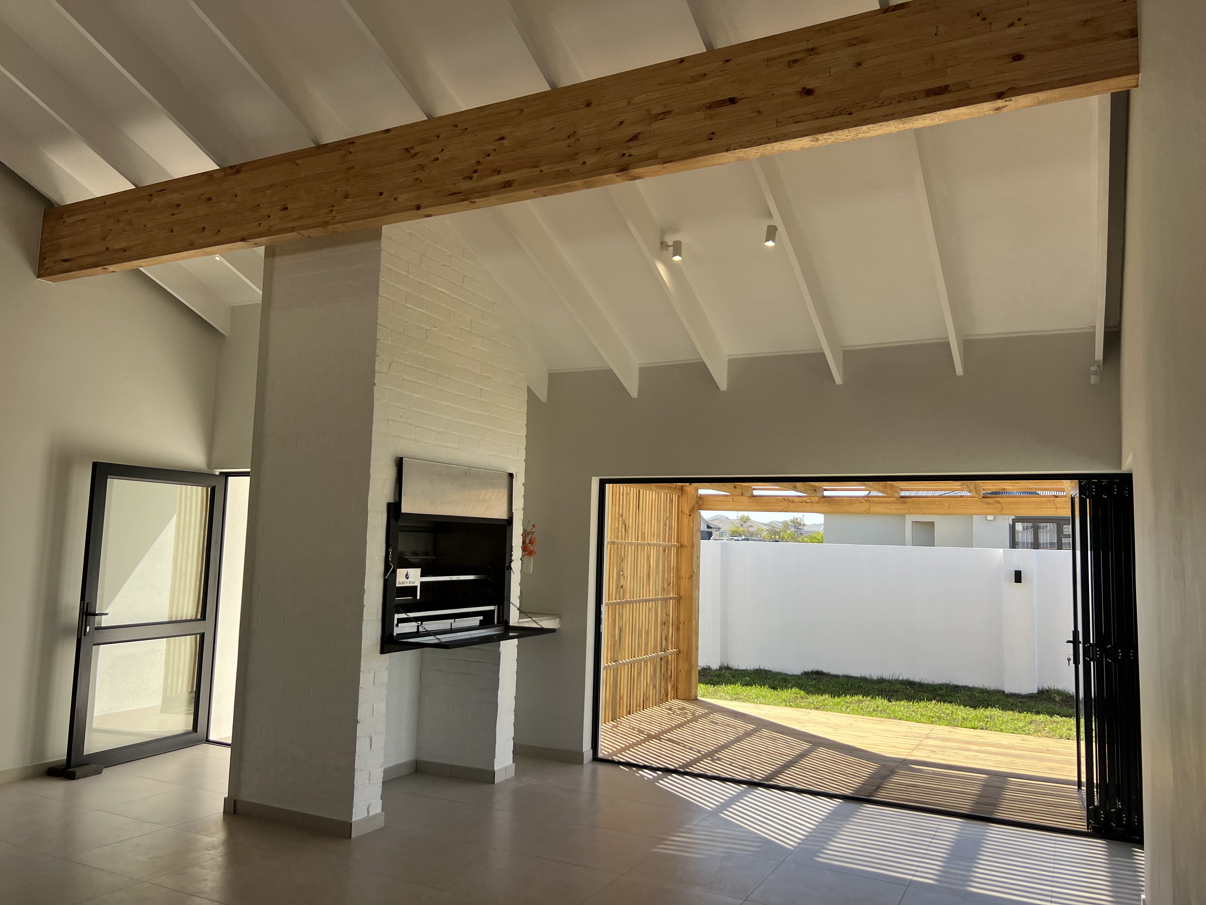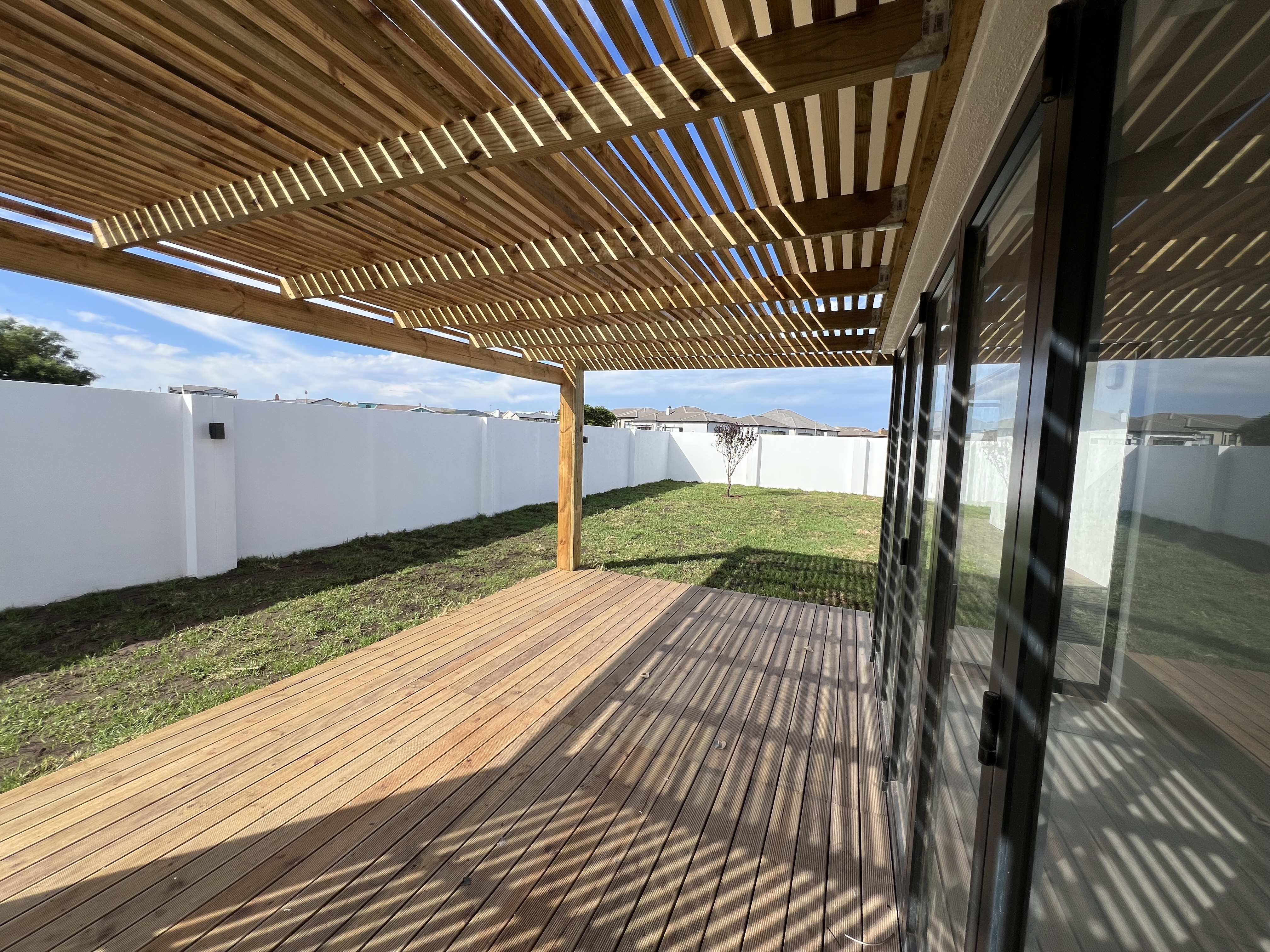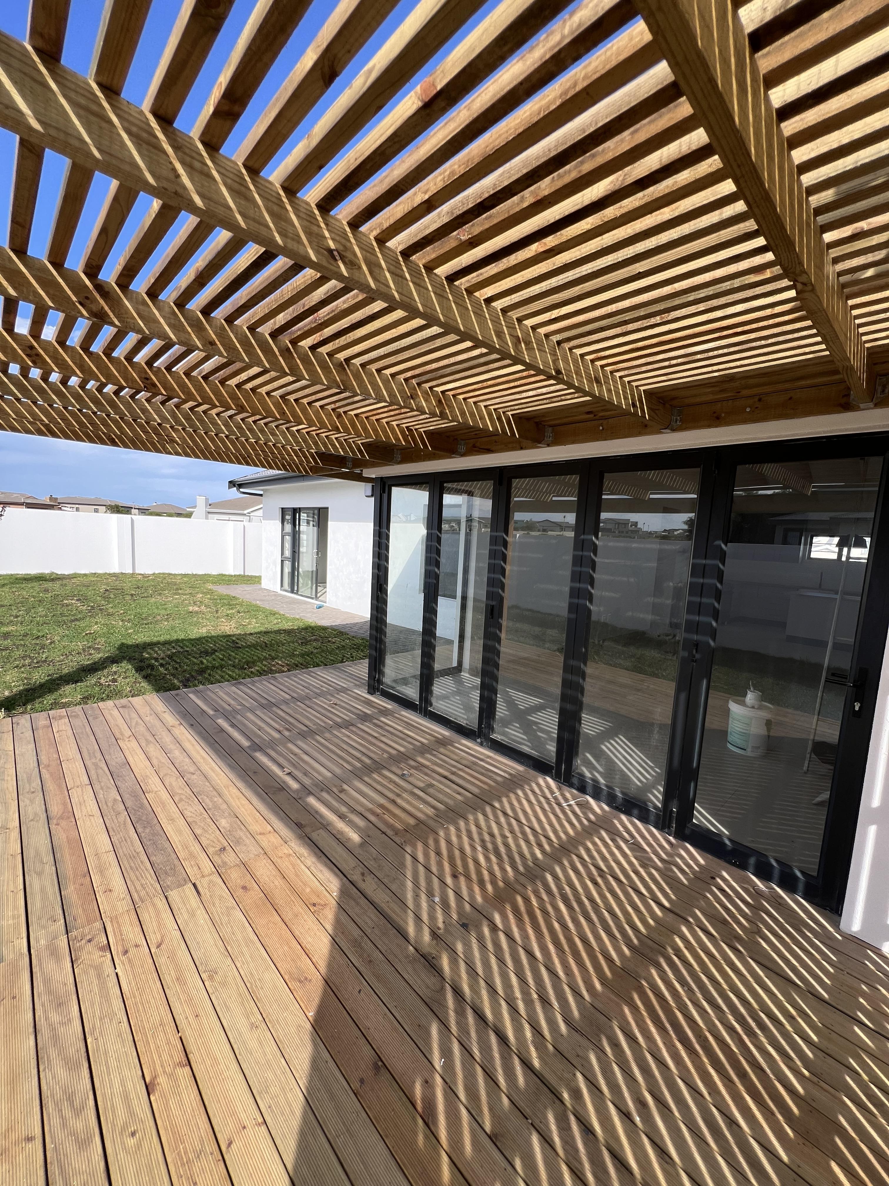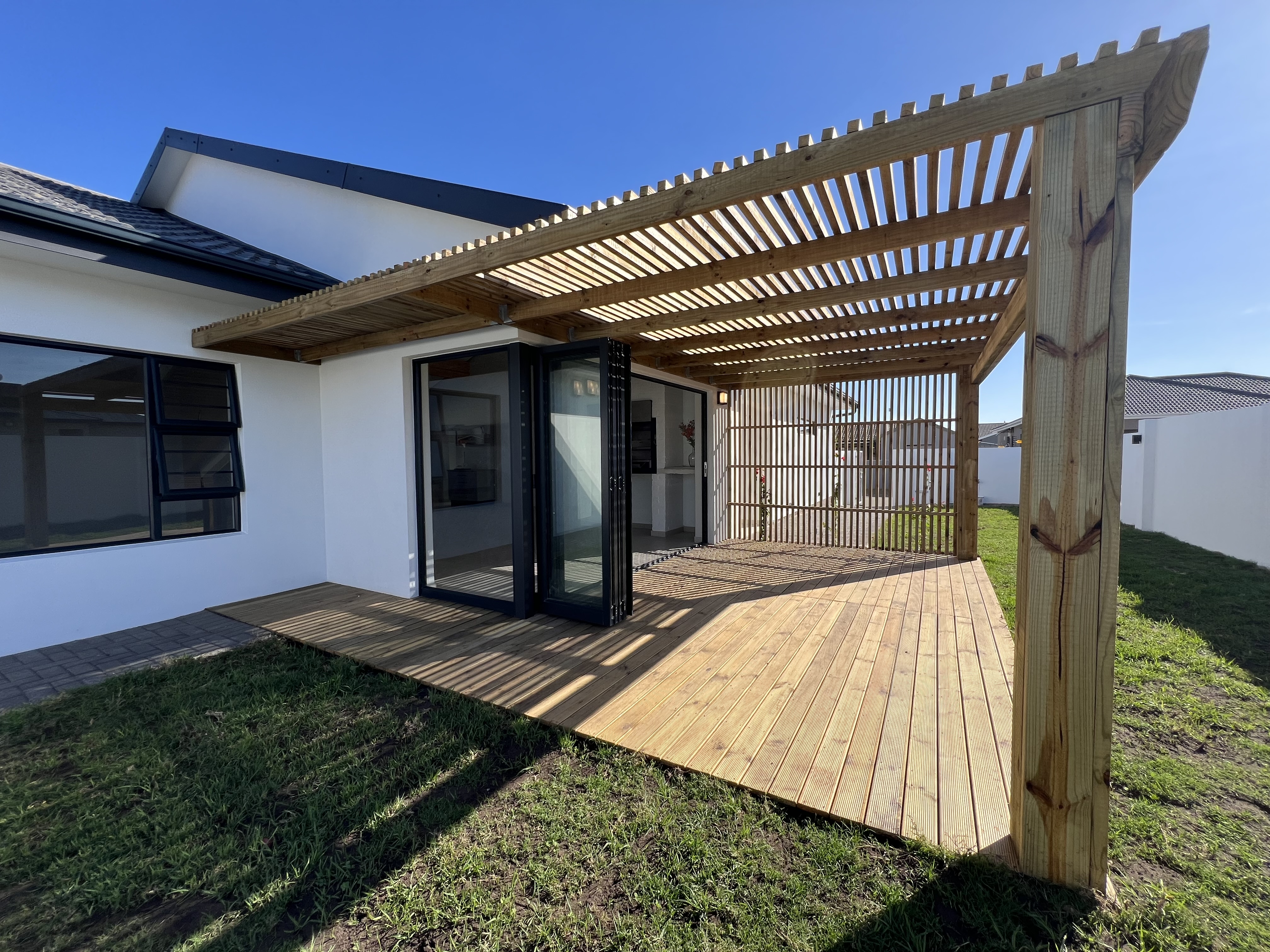 The lounge and indoor braai area feature stacking doors that open onto a wooden deck with a pergola—perfect for entertaining. Sun-filled bedrooms and beautifully designed, spacious bathrooms enhance the home’s comfort and appeal.