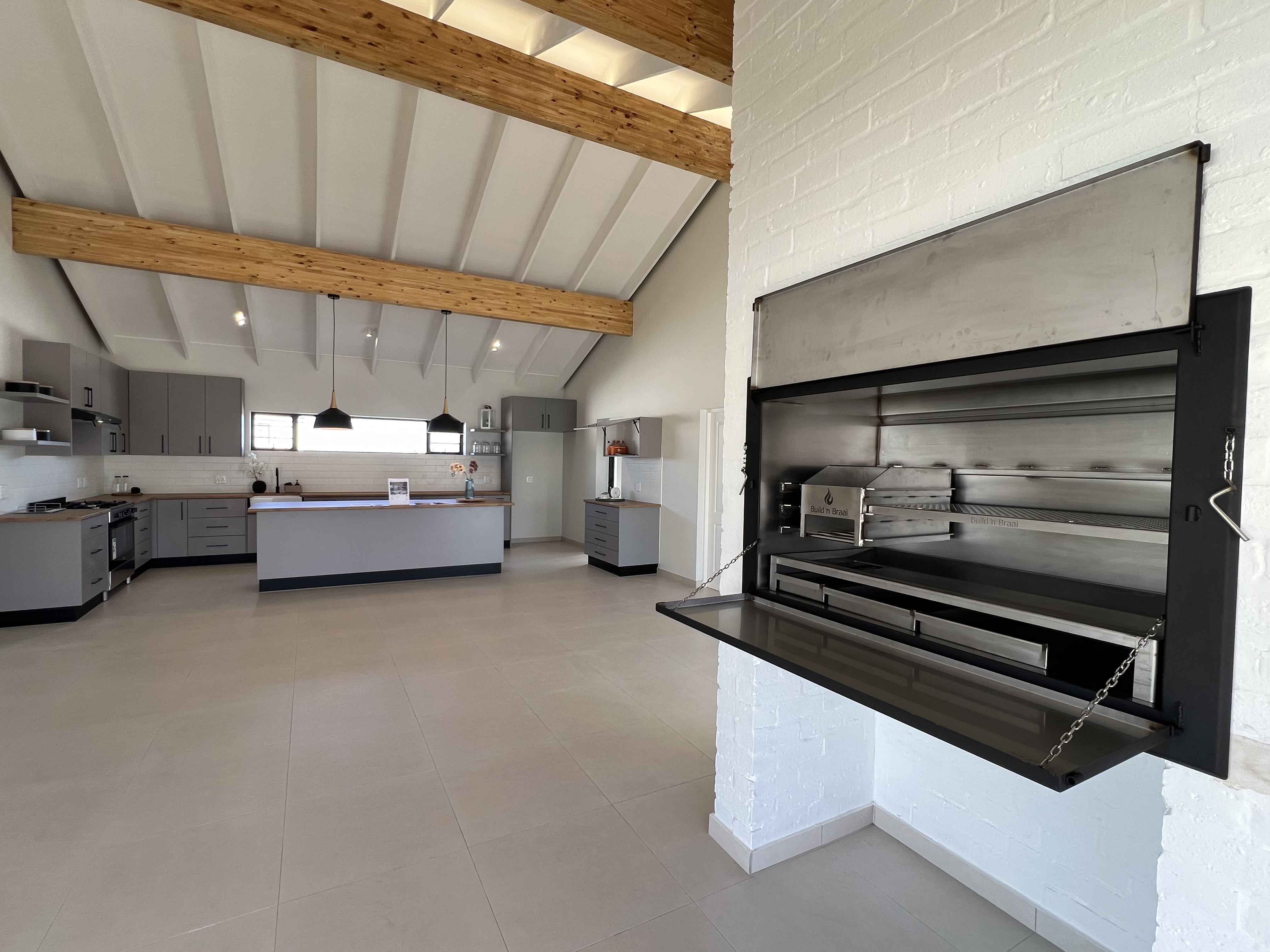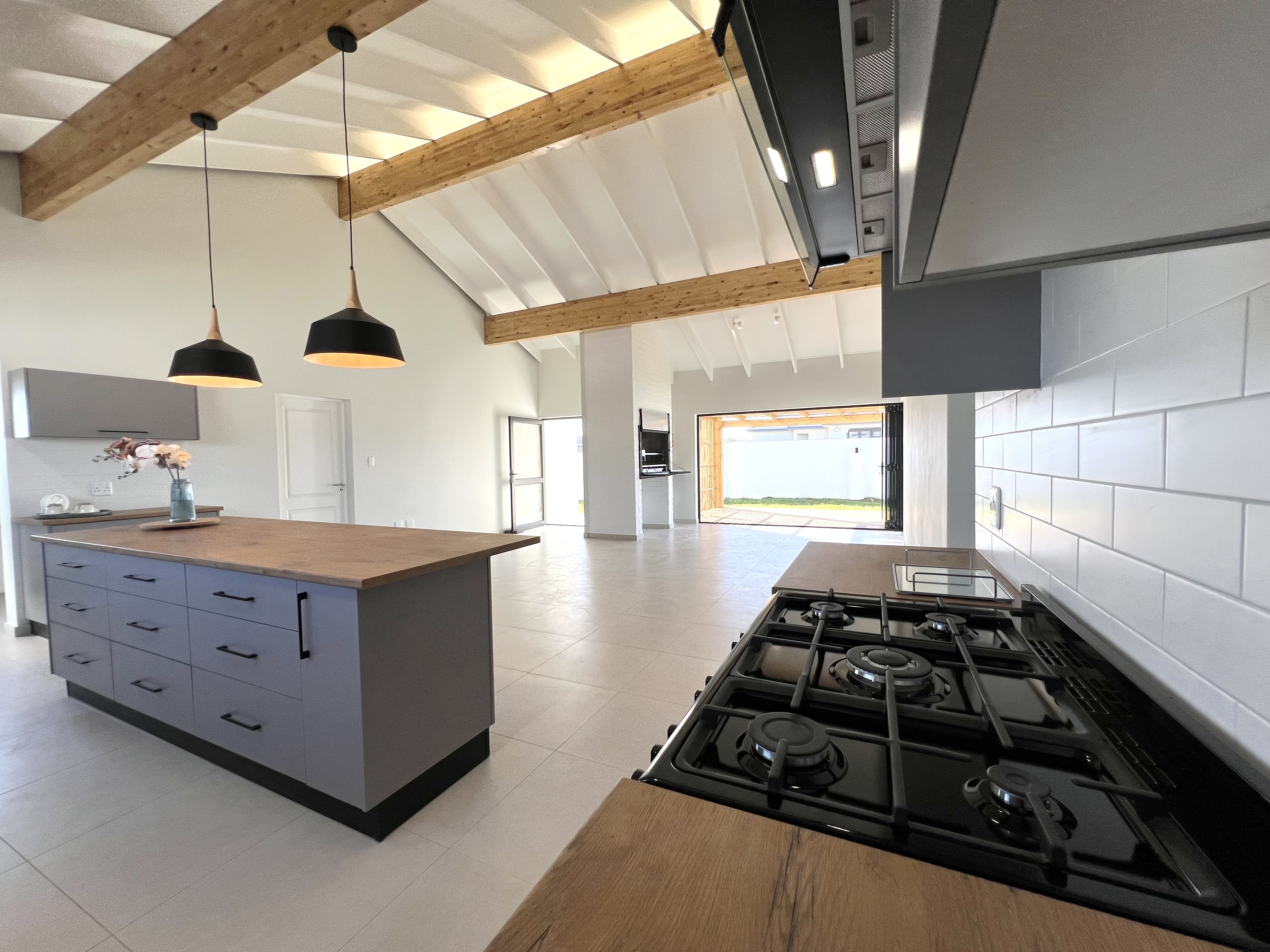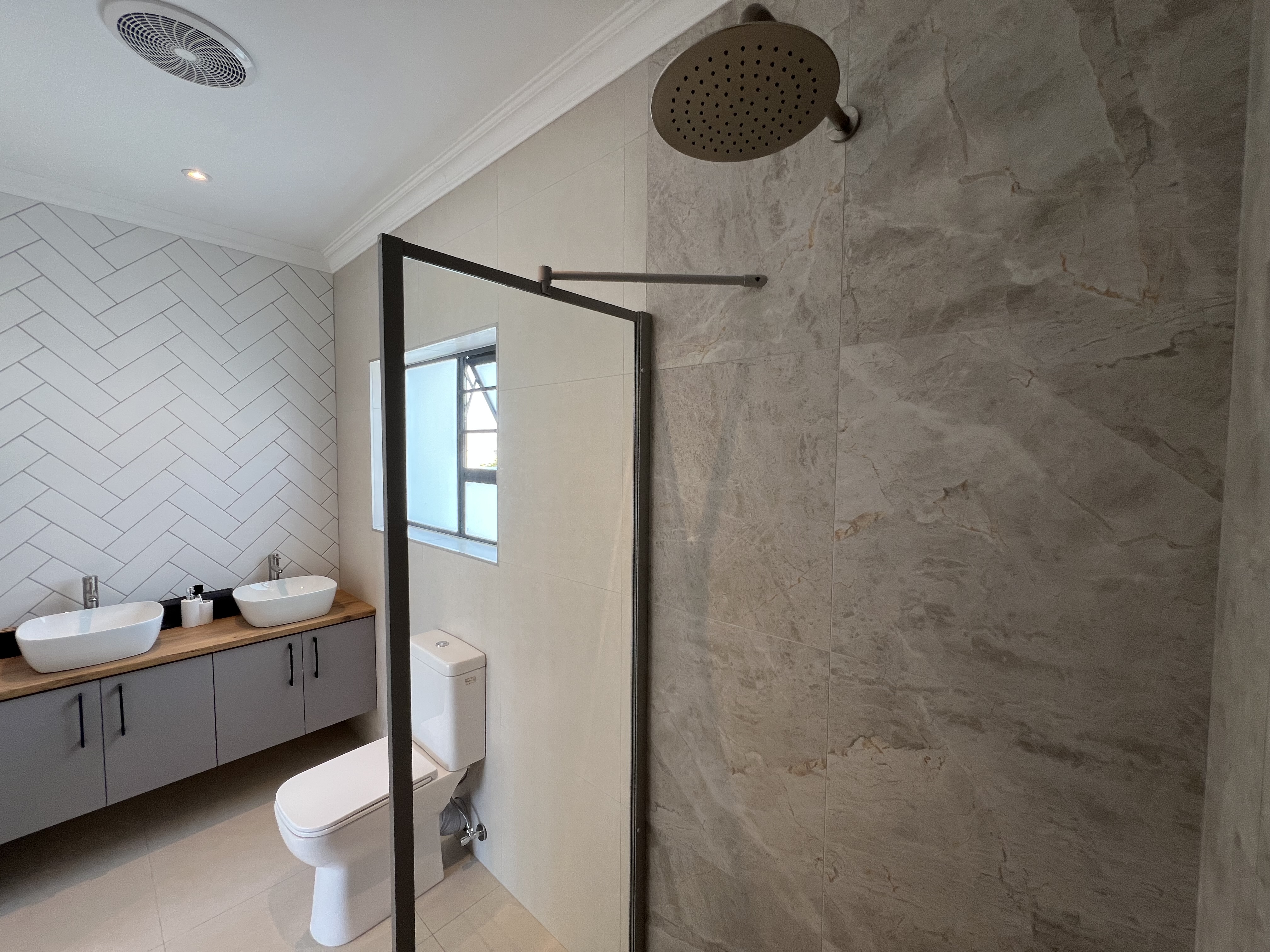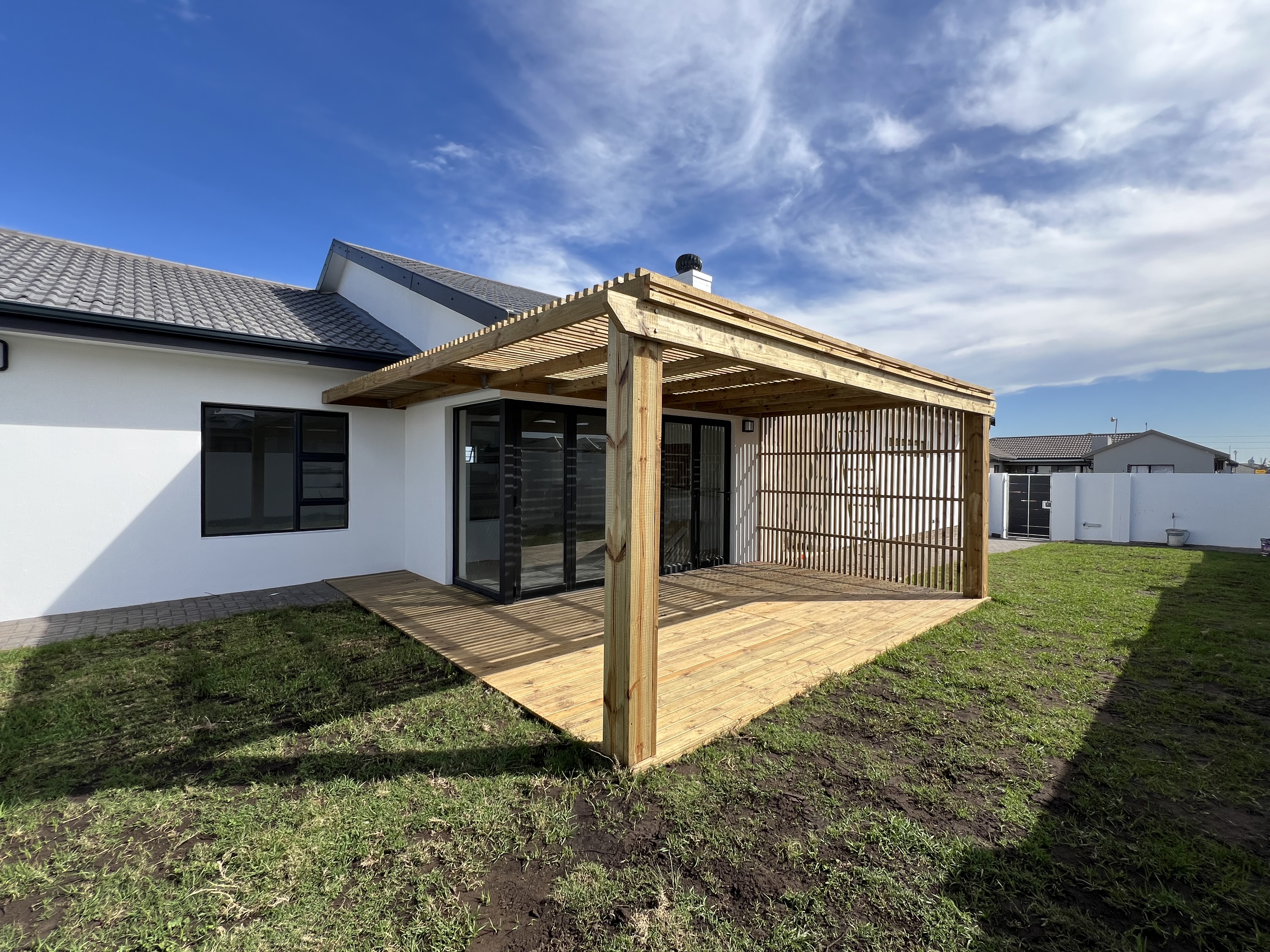 The lounge and indoor braai area feature stacking doors that open onto a wooden deck with a pergola—perfect for entertaining. Sun-filled bedrooms and beautifully designed, spacious bathrooms enhance the home’s comfort and appeal.