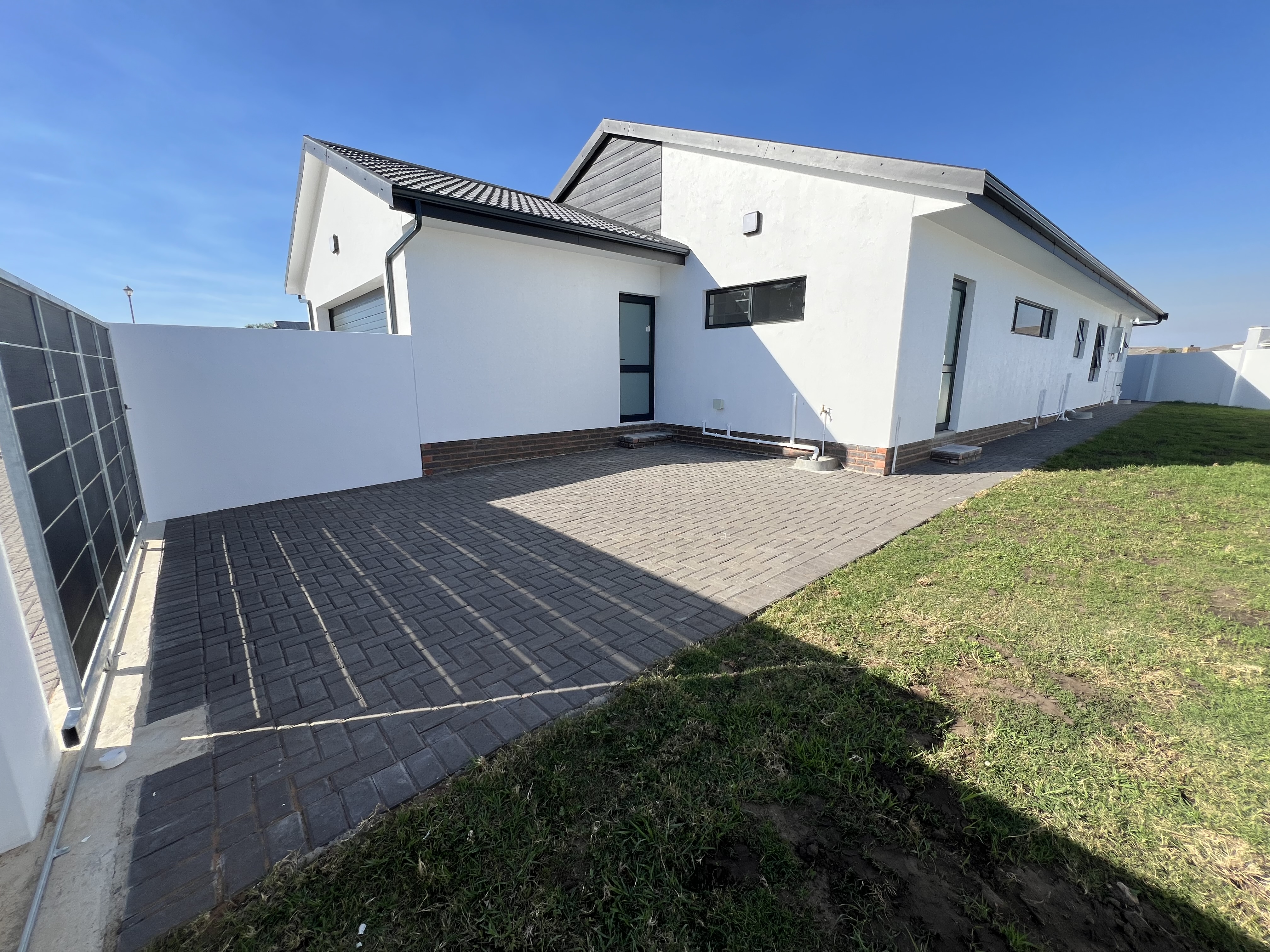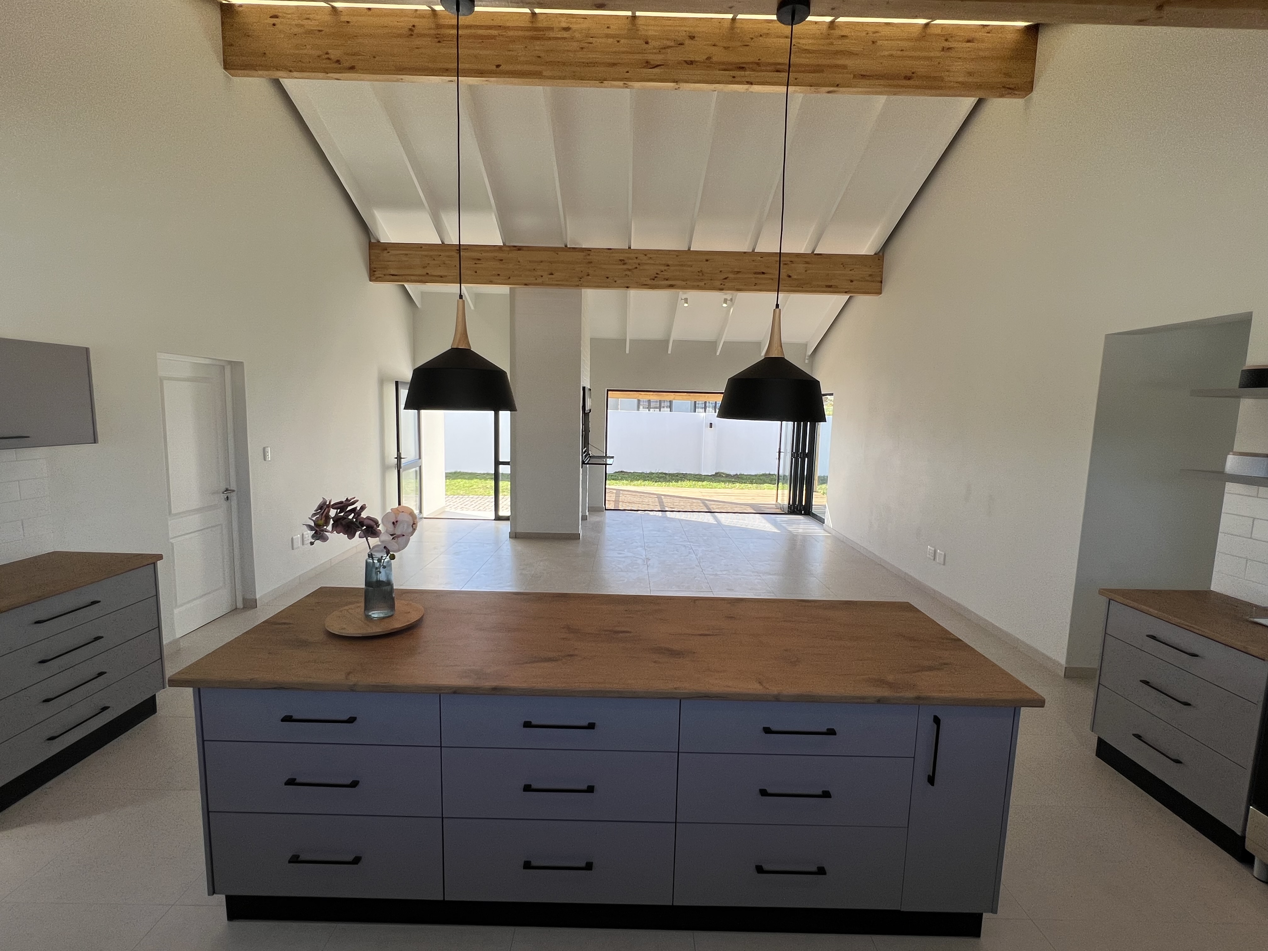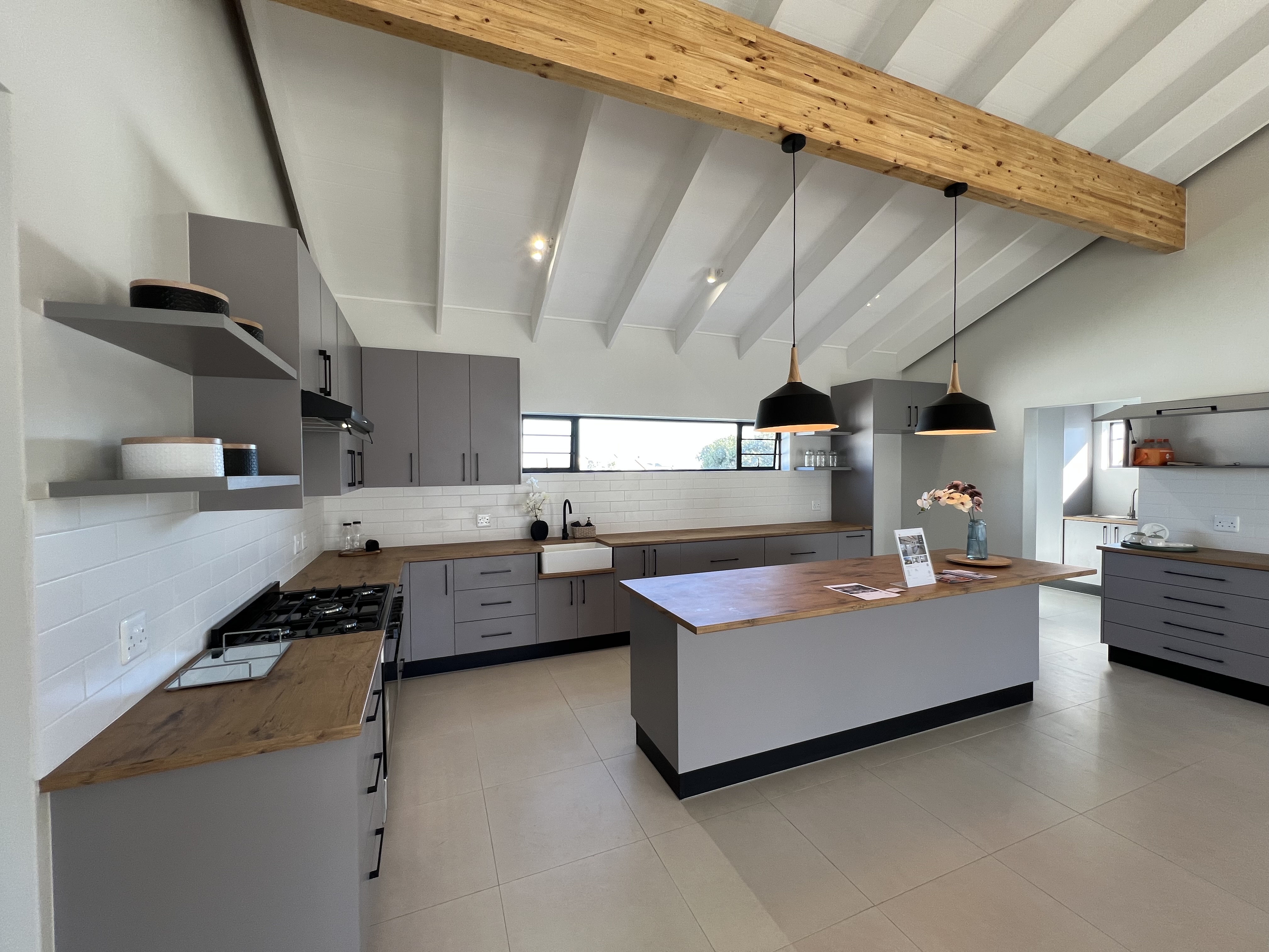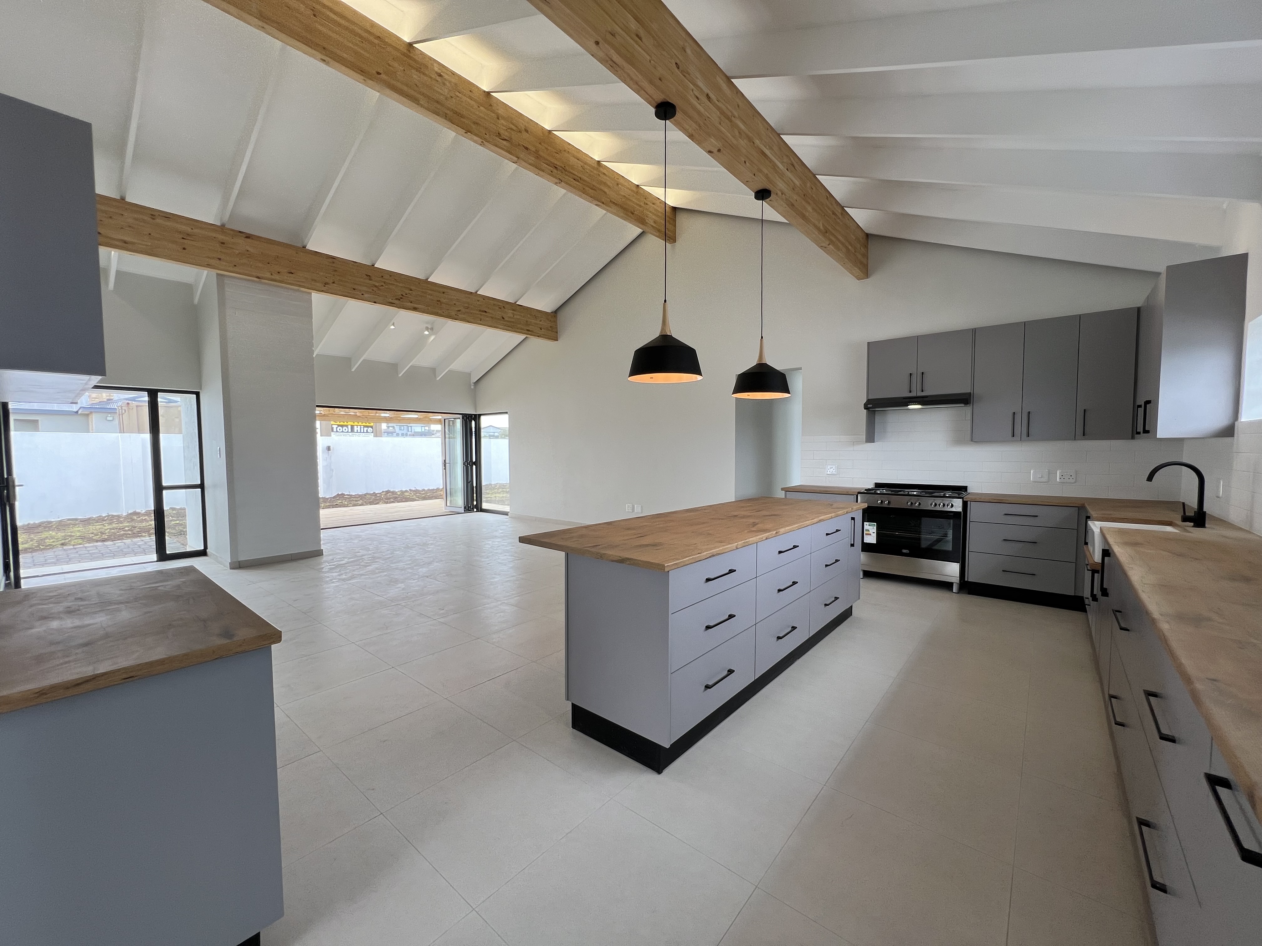 The lounge and indoor braai area feature stacking doors that open onto a wooden deck with a pergola—perfect for entertaining. Sun-filled bedrooms and beautifully designed, spacious bathrooms enhance the home’s comfort and appeal.