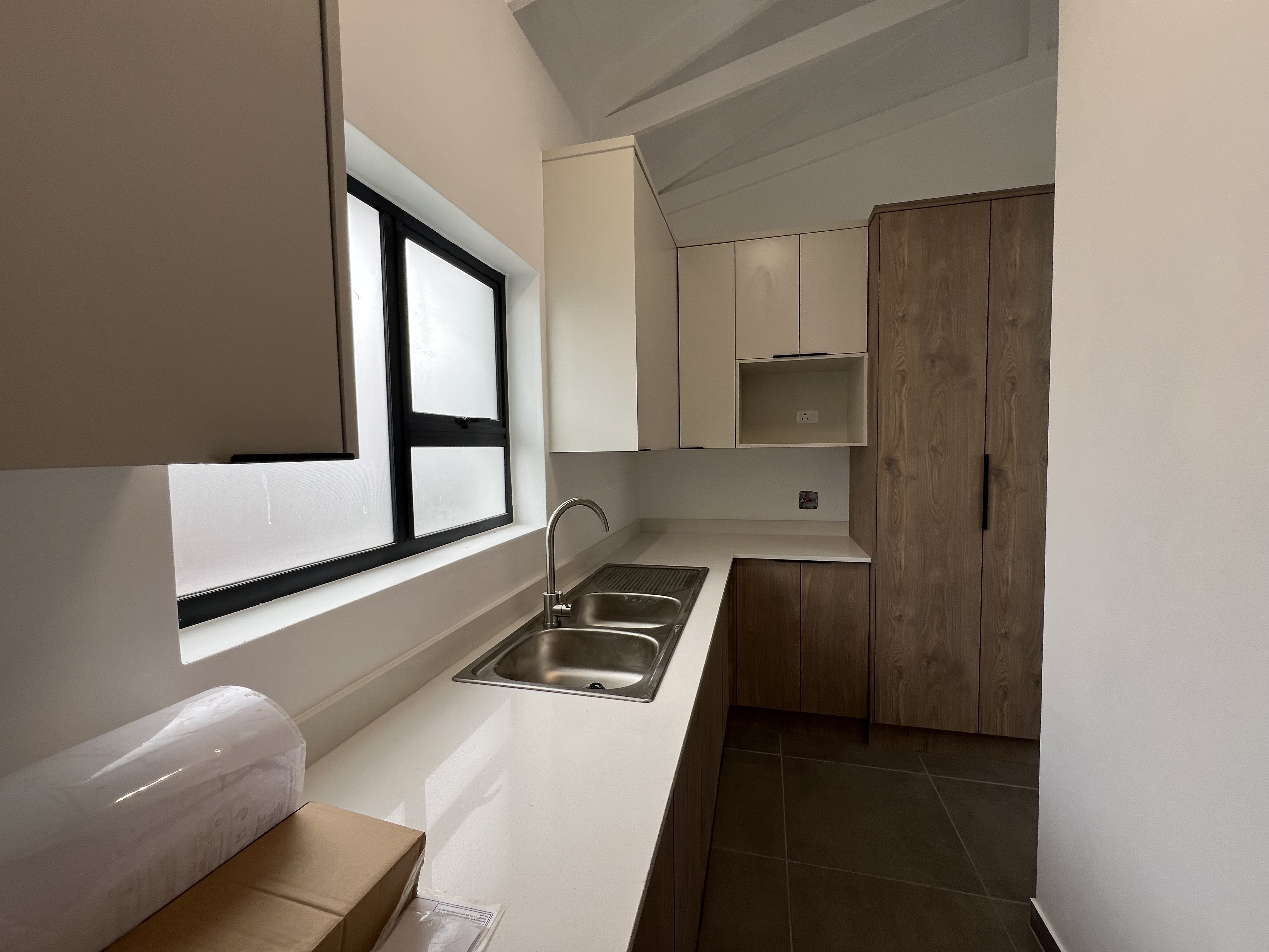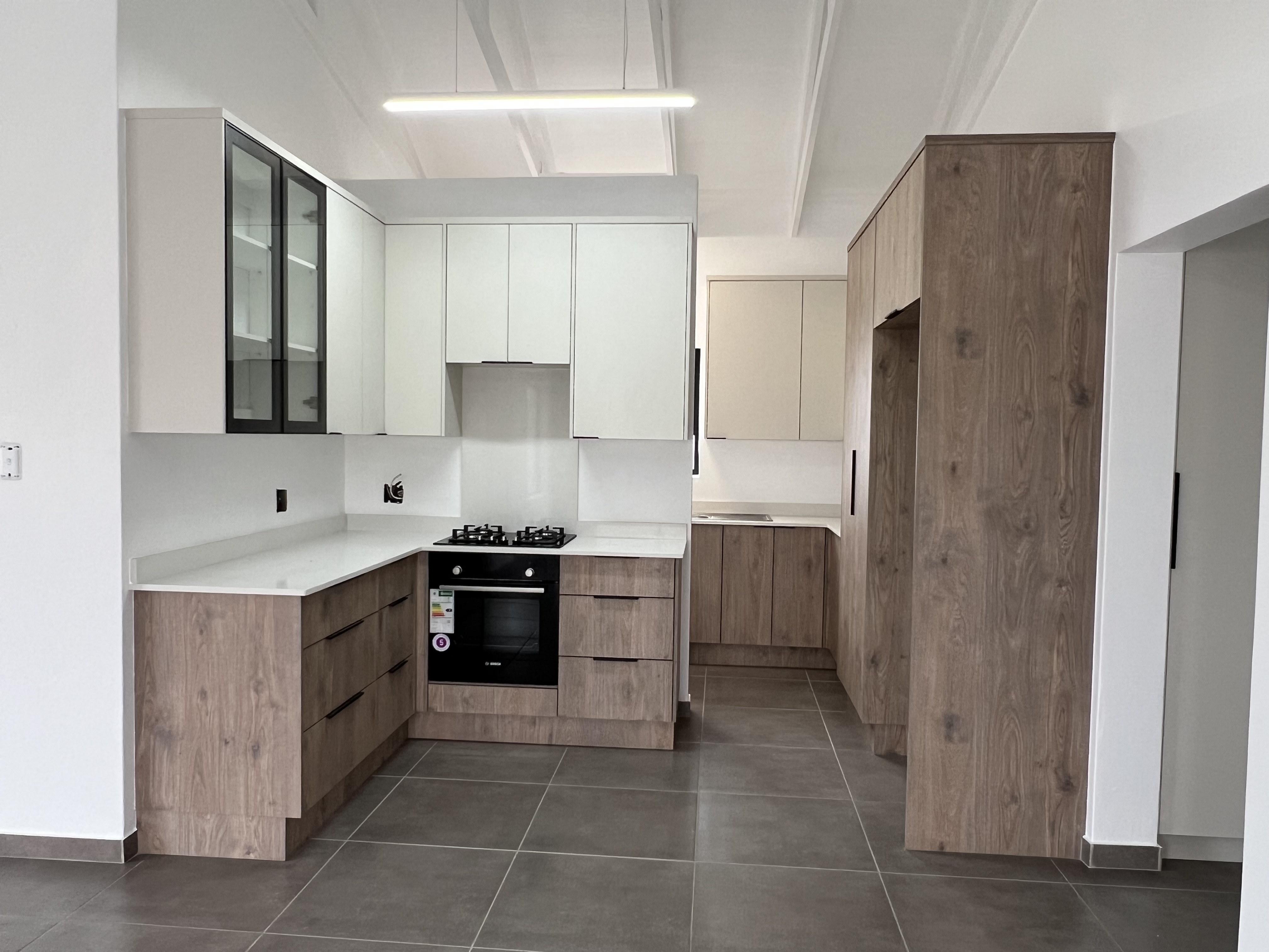 Linen cupboard in the passage. Gas hob, gas geyser.