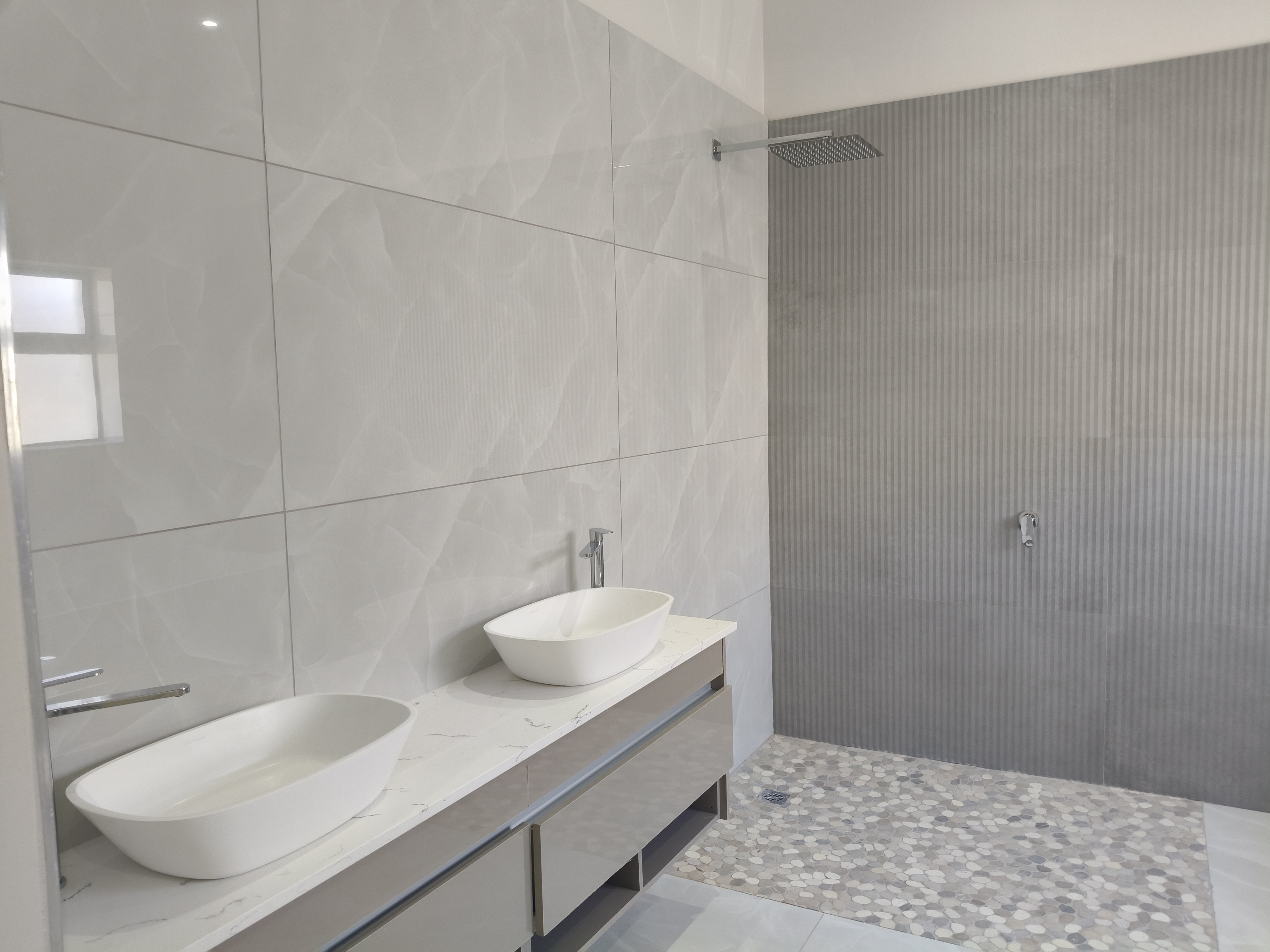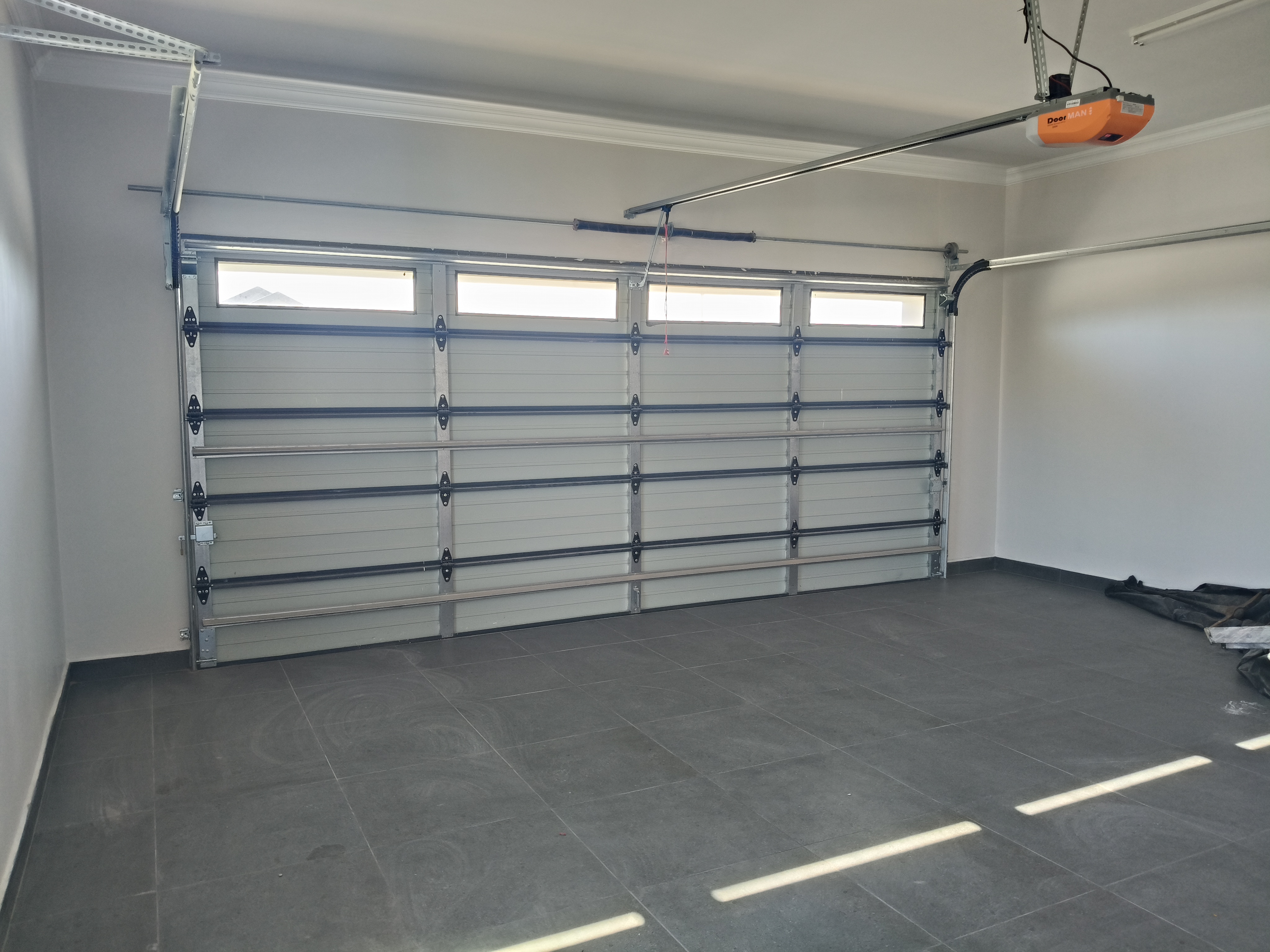 Double automated garage, tiled for a clean and premium feel