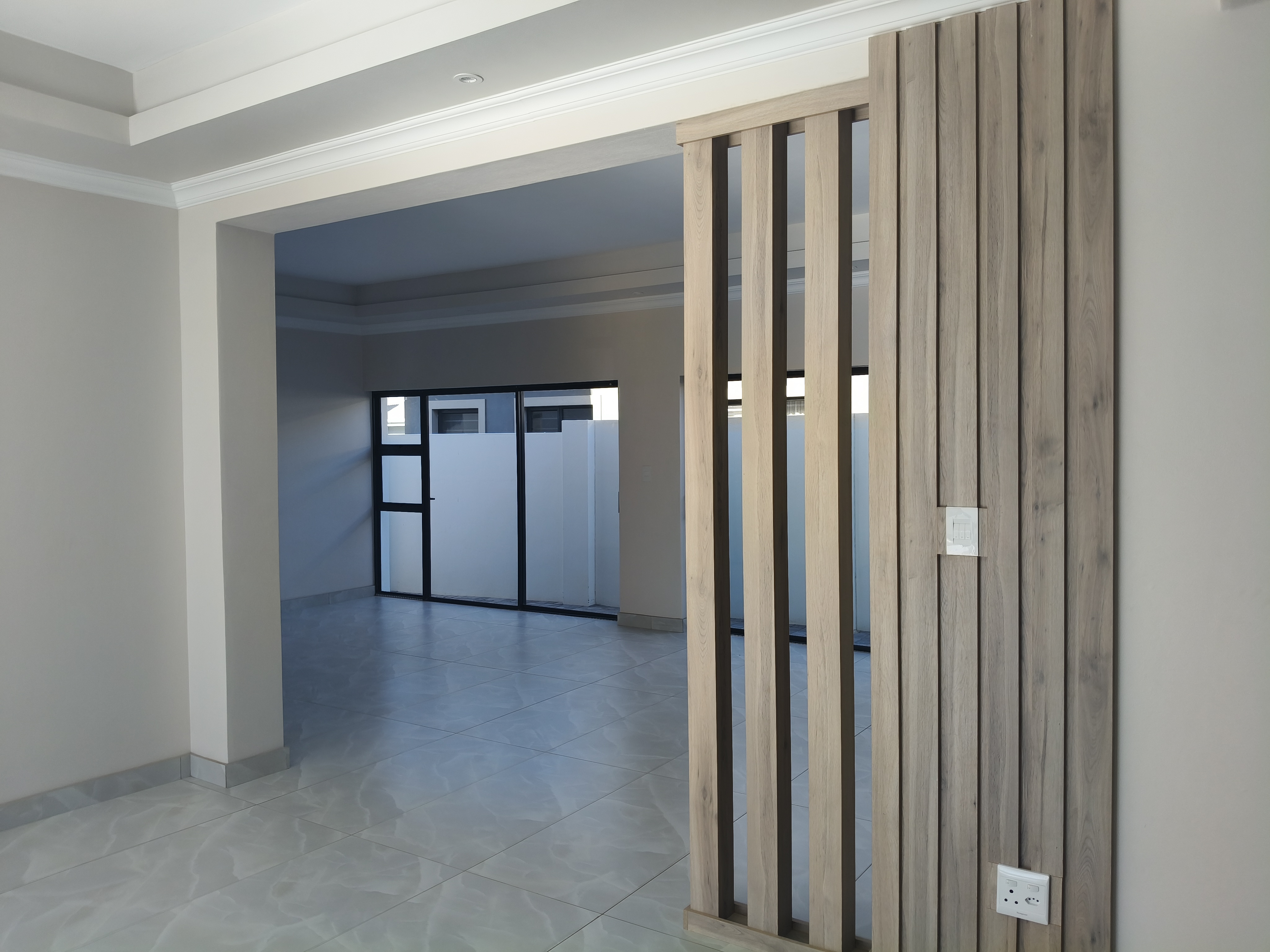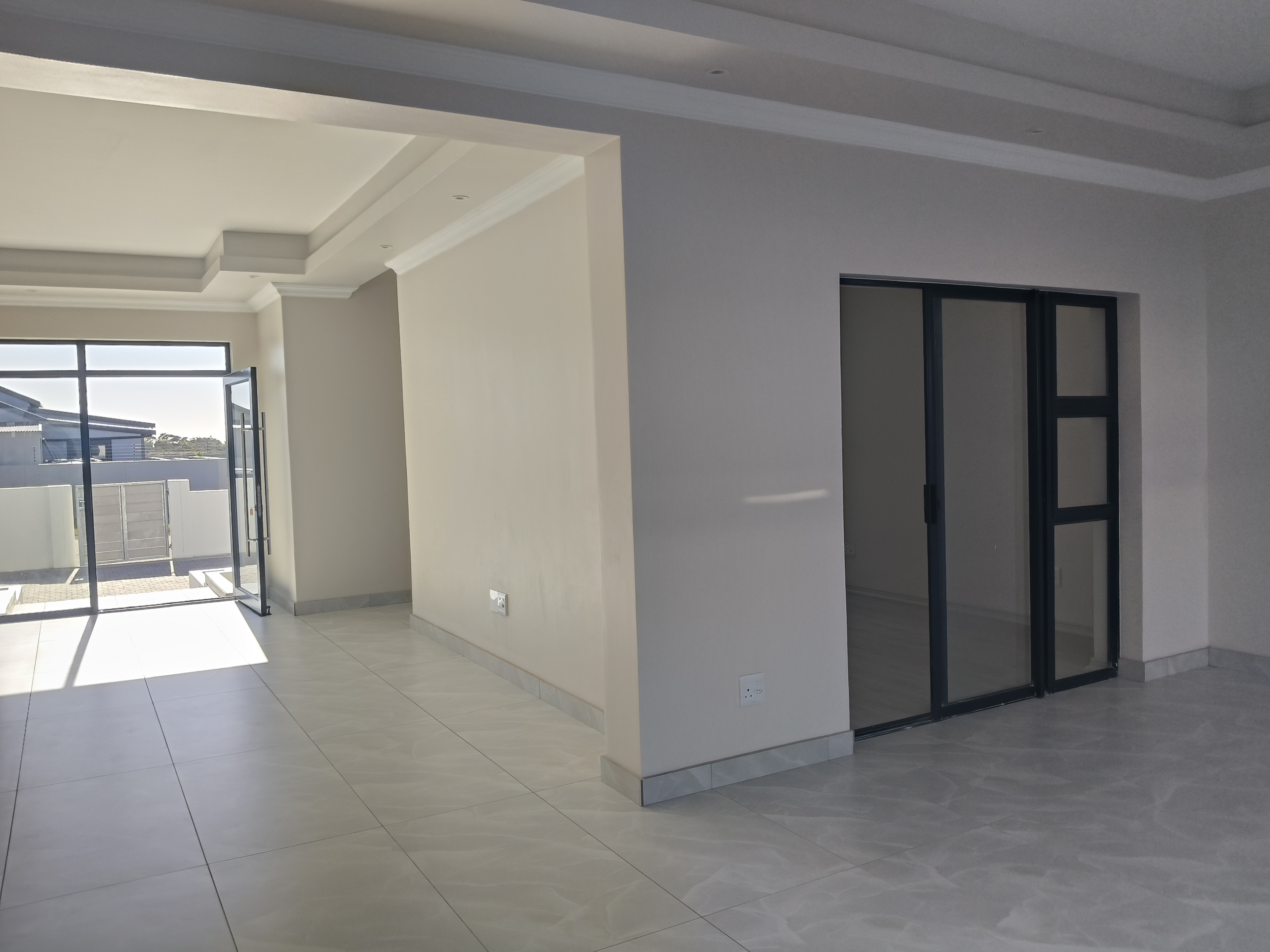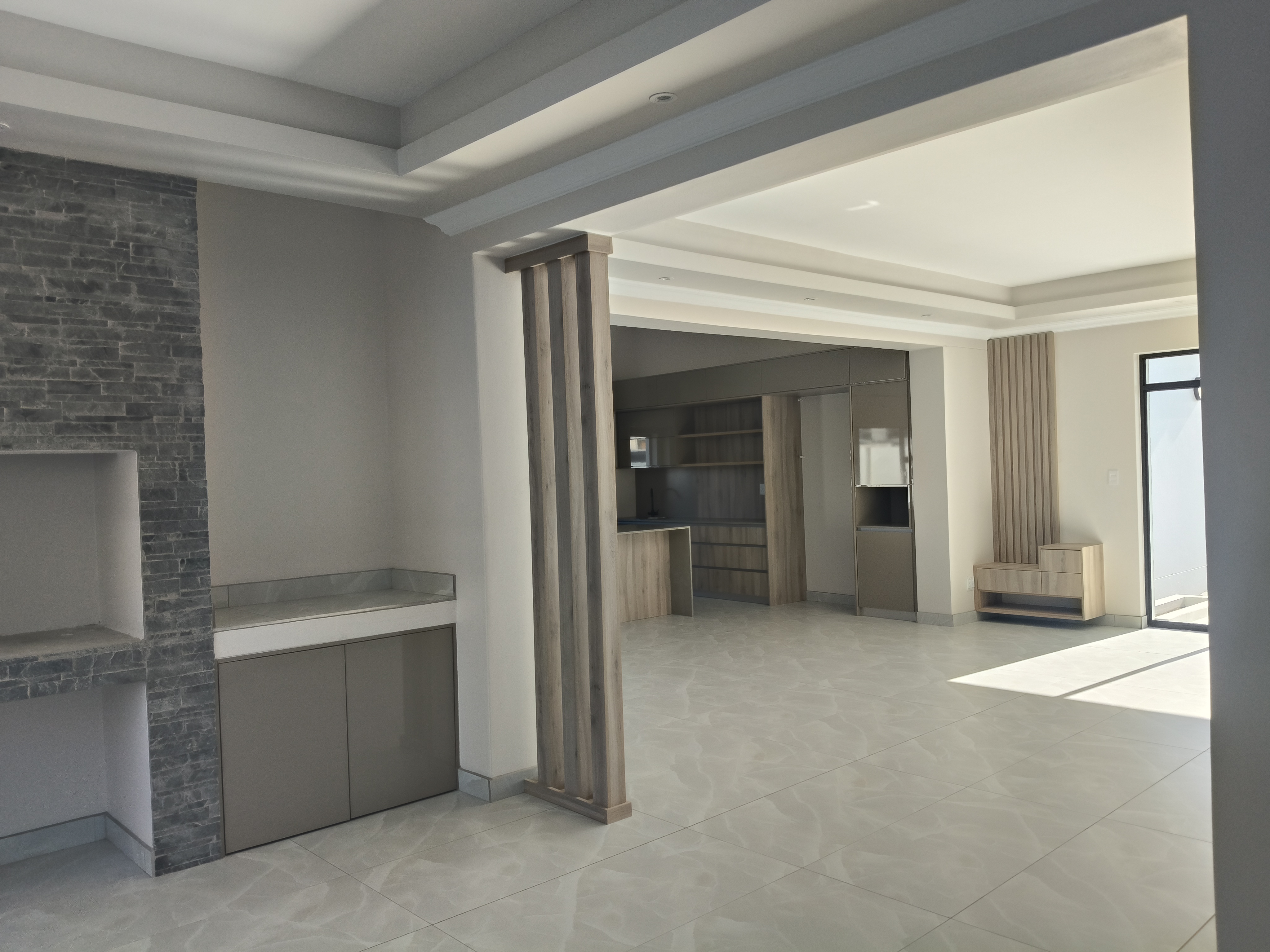Modern open-plan living area seamlessly connecting the lounge, dining room, and indoor braai/entertainment space