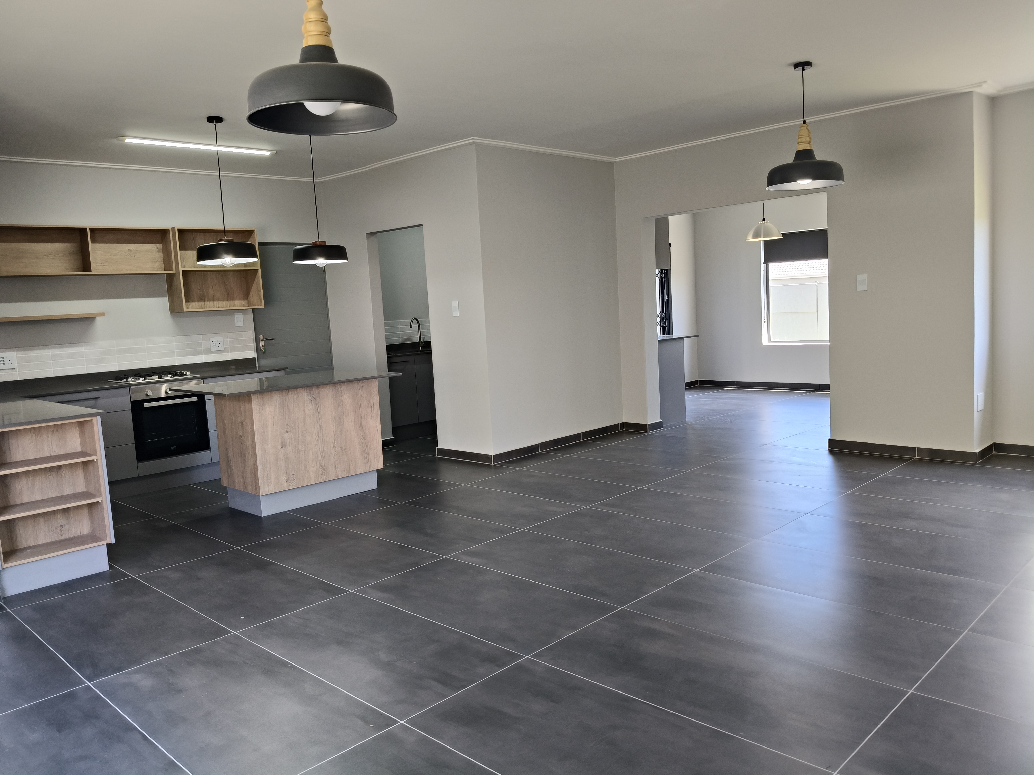 The home features three well-sized bedrooms and two modern bathrooms, including a main en-suite and a full family bathroom. Fully tiled throughout, it boasts a spacious open-plan living area comprising a contemporary kitchen with gas stove and separate scullery, lounge, and dining area.