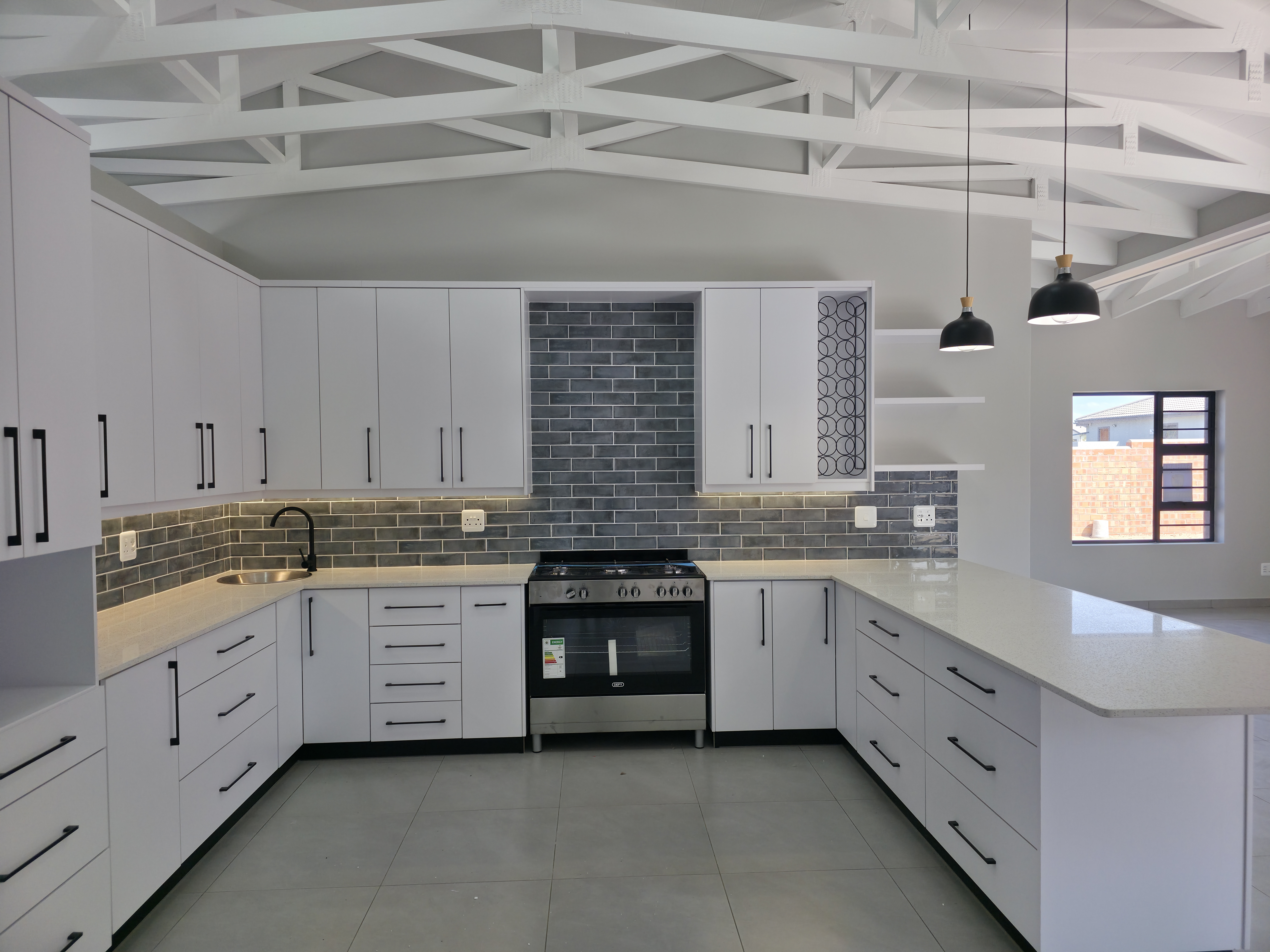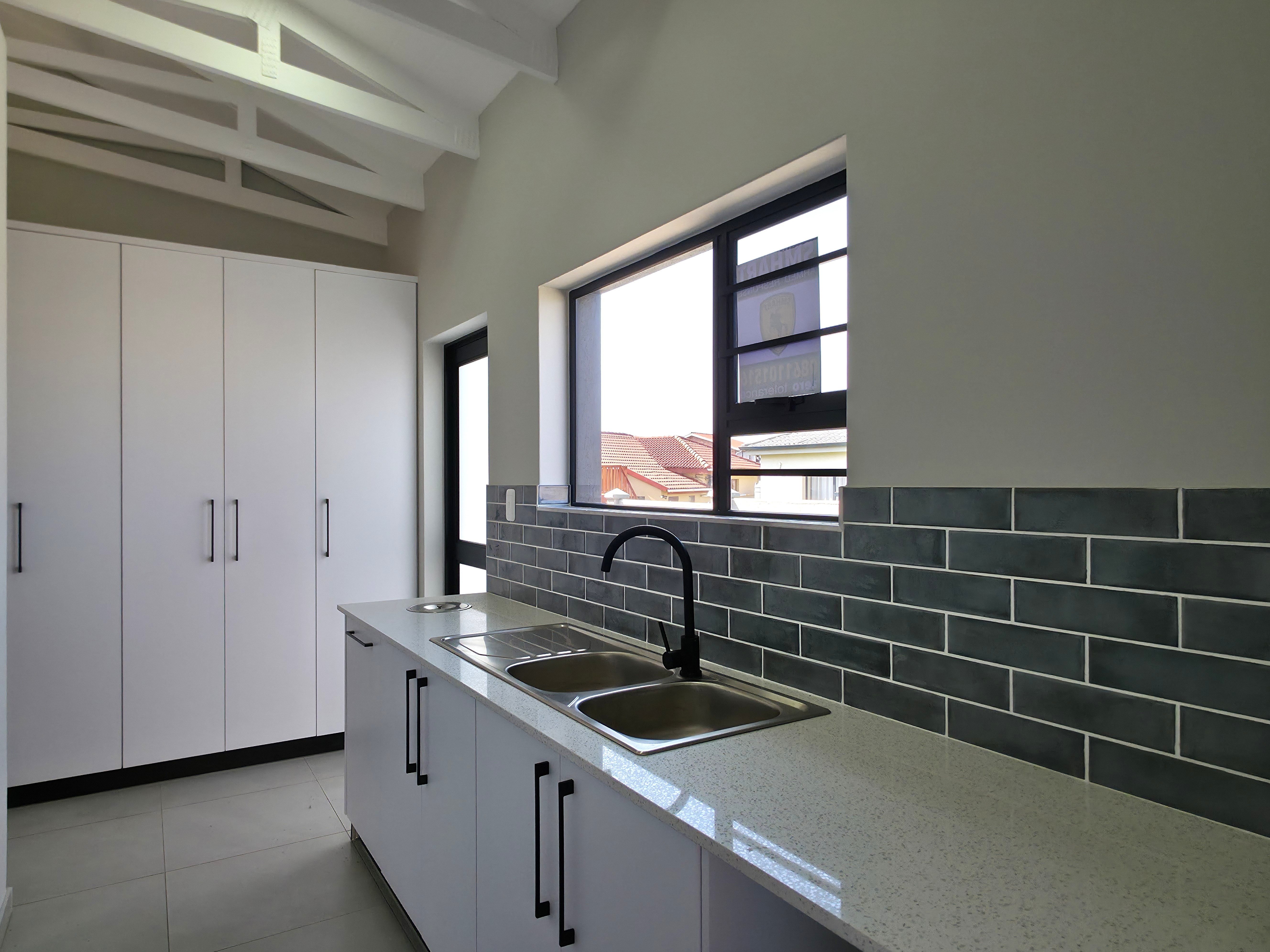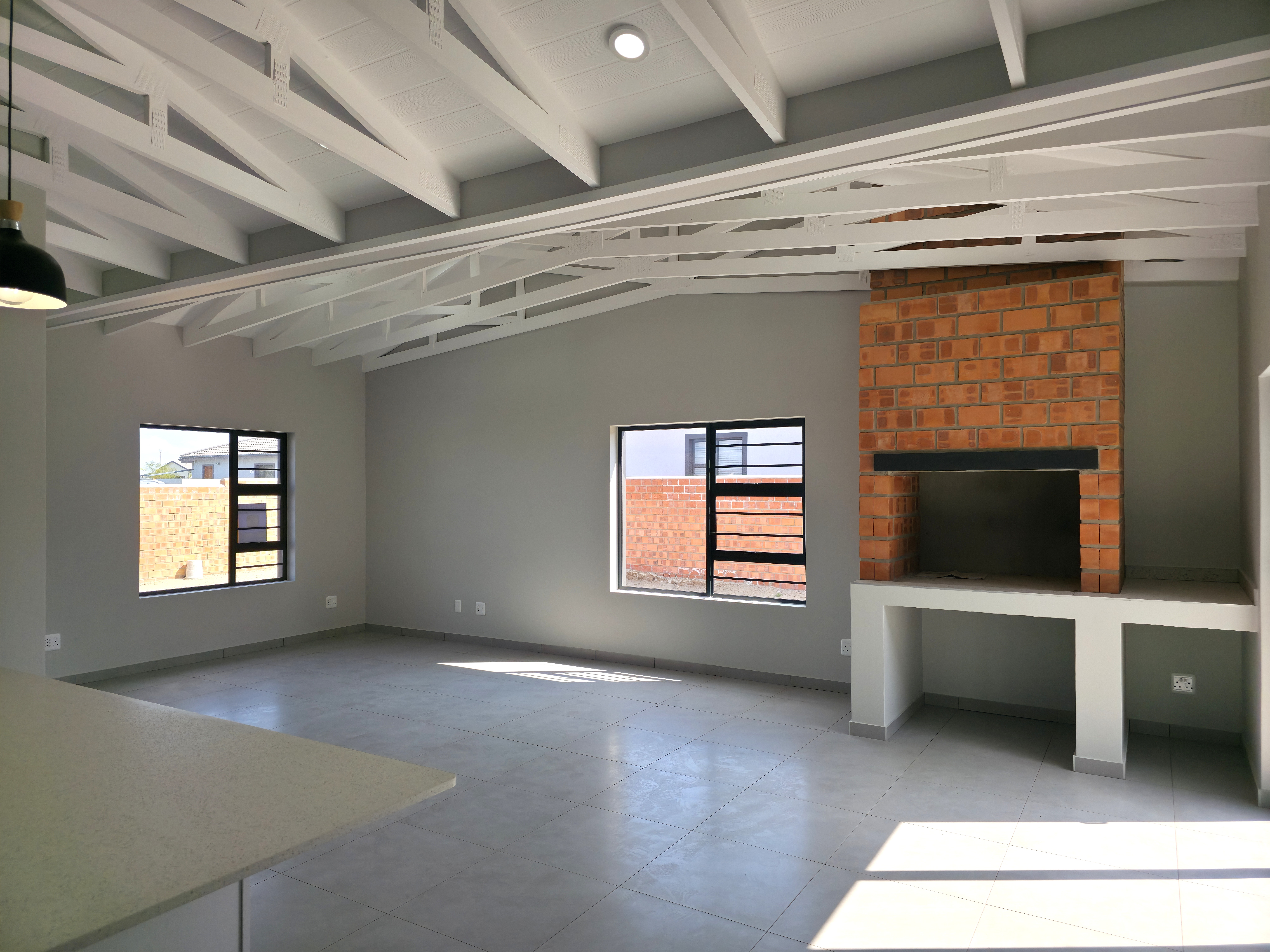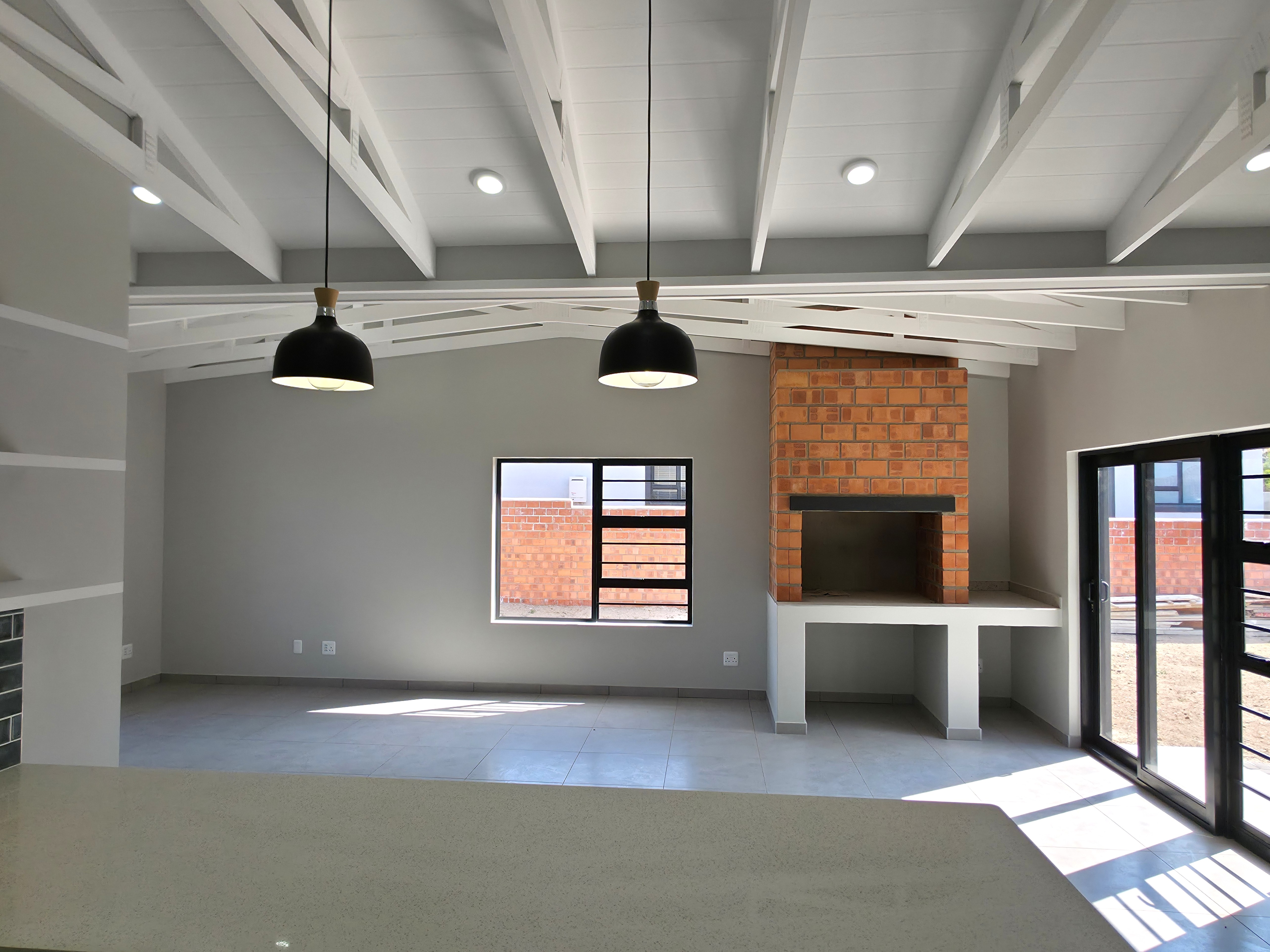 High-end finishes elevate every corner of the home, including a fully tiled garage that reflects the same level of care and quality found throughout. The sleek open-plan kitchen is both stylish and practical, featuring ample cabinetry, a gas hob, electric oven, and a generous layout that opens into the light-filled lounge and dining space. The built-in braai adds warmth and atmosphere, especially during chilly winter evenings.