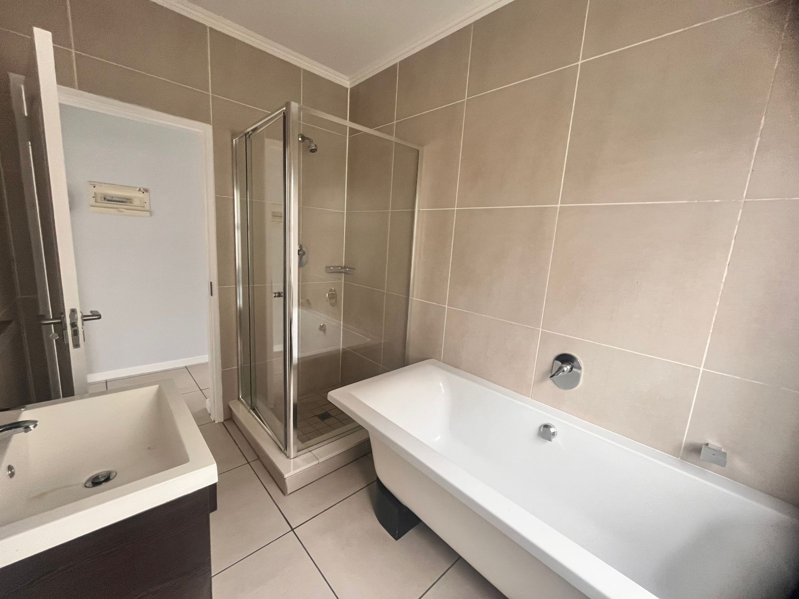 Contemporary bathrooms with stylish fixtures and neutral tones