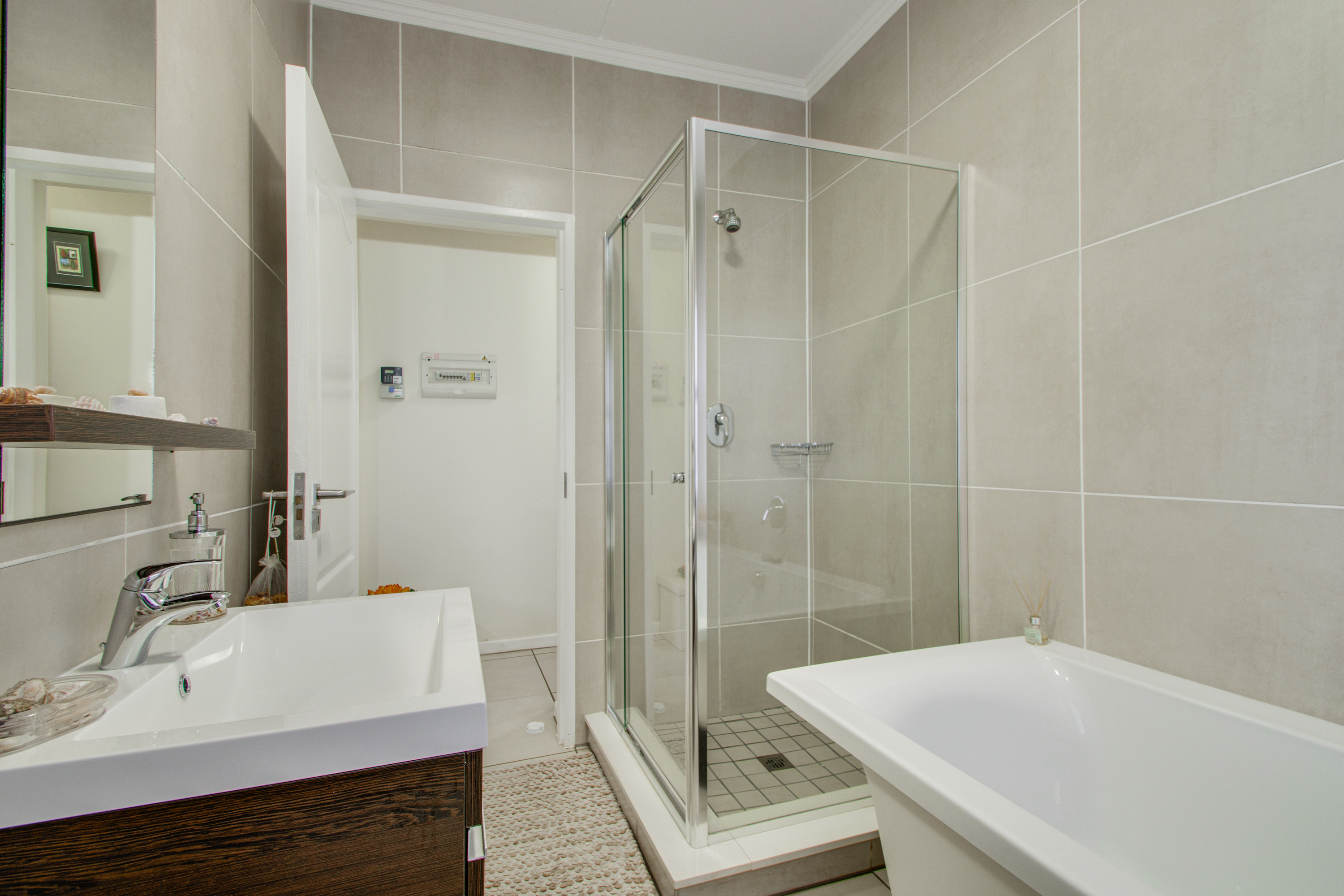 Both bedrooms are spacious, with the main bedroom featuring an en-suite bathroom with a walk-in shower and direct access to the balcony through sliding doors, enhancing the sense of openness and tranquility.