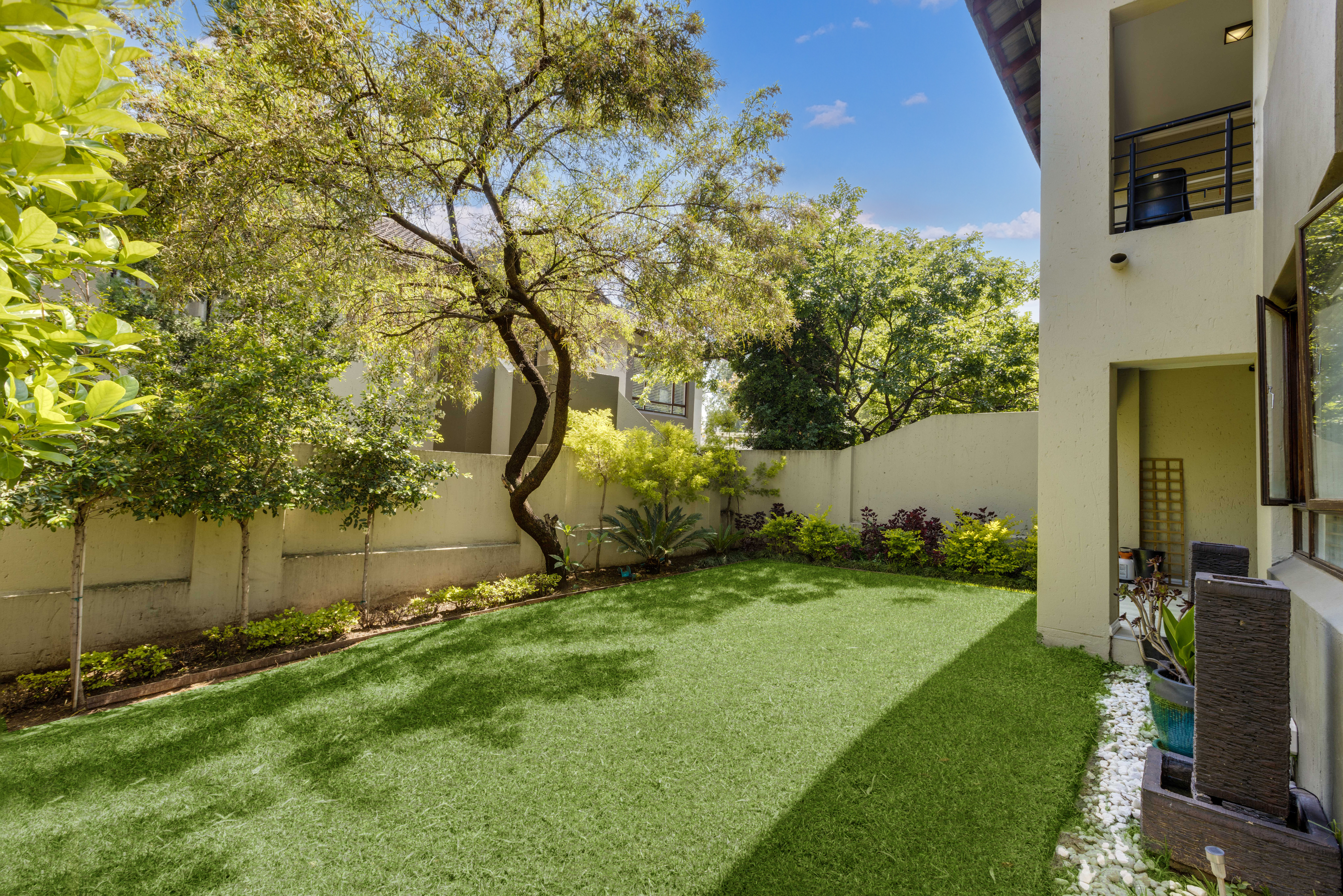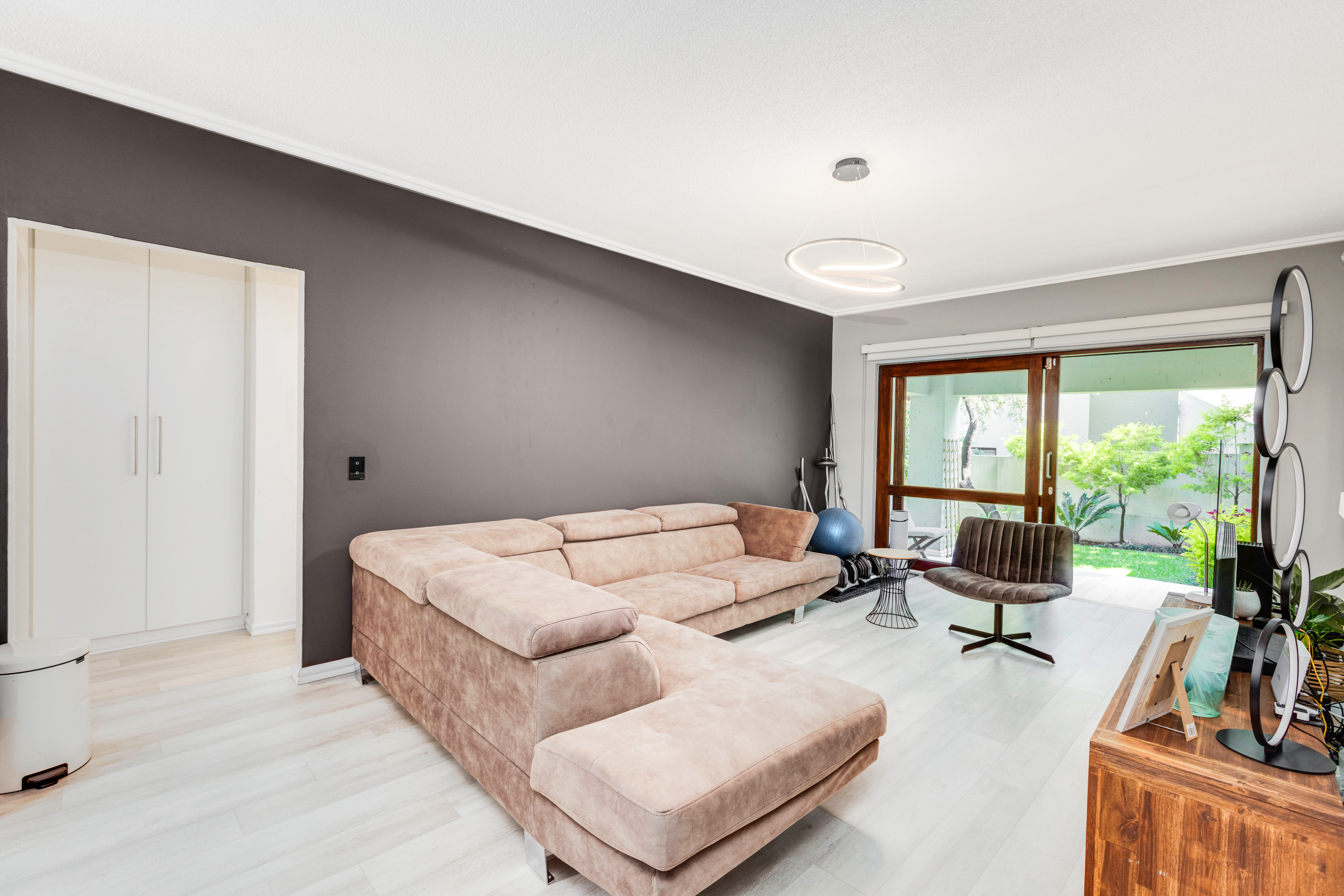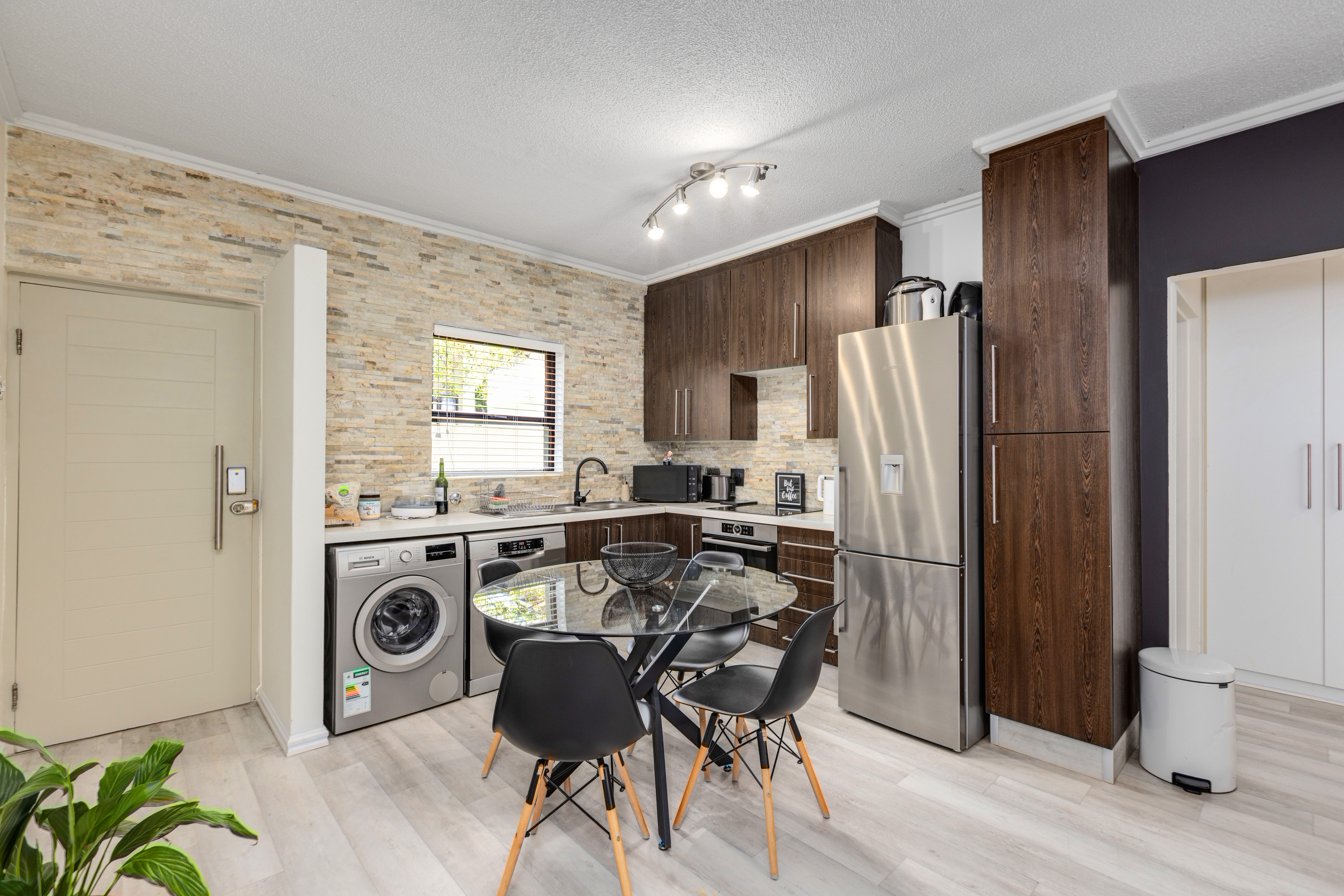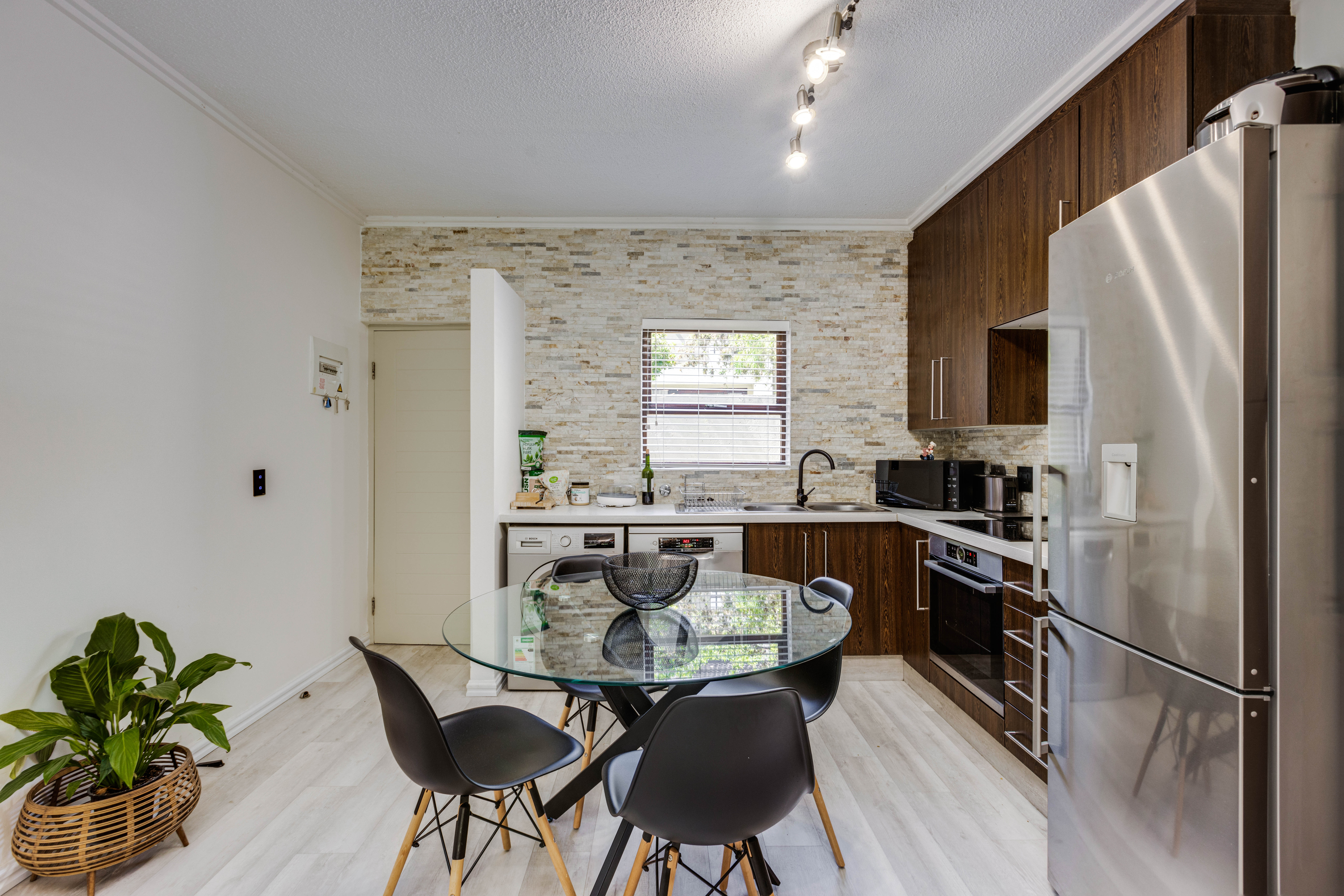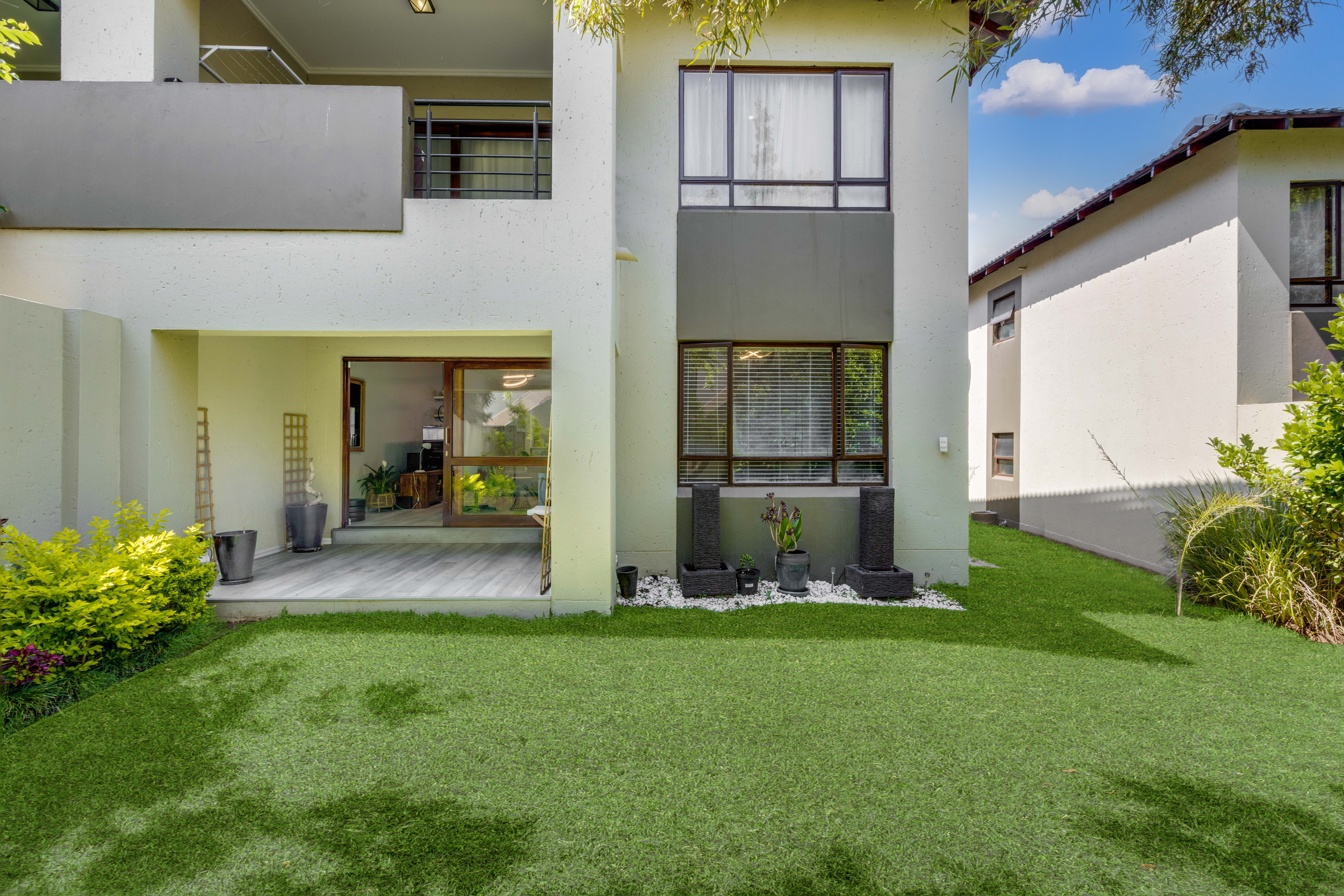 The heart of the home is the stylish open-plan kitchen, finished with generous cupboard space, sleek cabinetry and quality appliances, designed to be both functional and elegant. It flows seamlessly into the dining area and spacious lounge, creating a harmonious living space ideal for both everyday living and entertaining. Large sliding doors open onto a tranquil covered patio, an extension of the living area that overlooks a private, tree-lined garden that is immaculately maintained and offers a sense of serenity and seclusion rarely found in apartment living. The garden is perfectly sized for relaxed outdoor living, morning coffees, evening sundowners and peaceful moments surrounded by greenery.