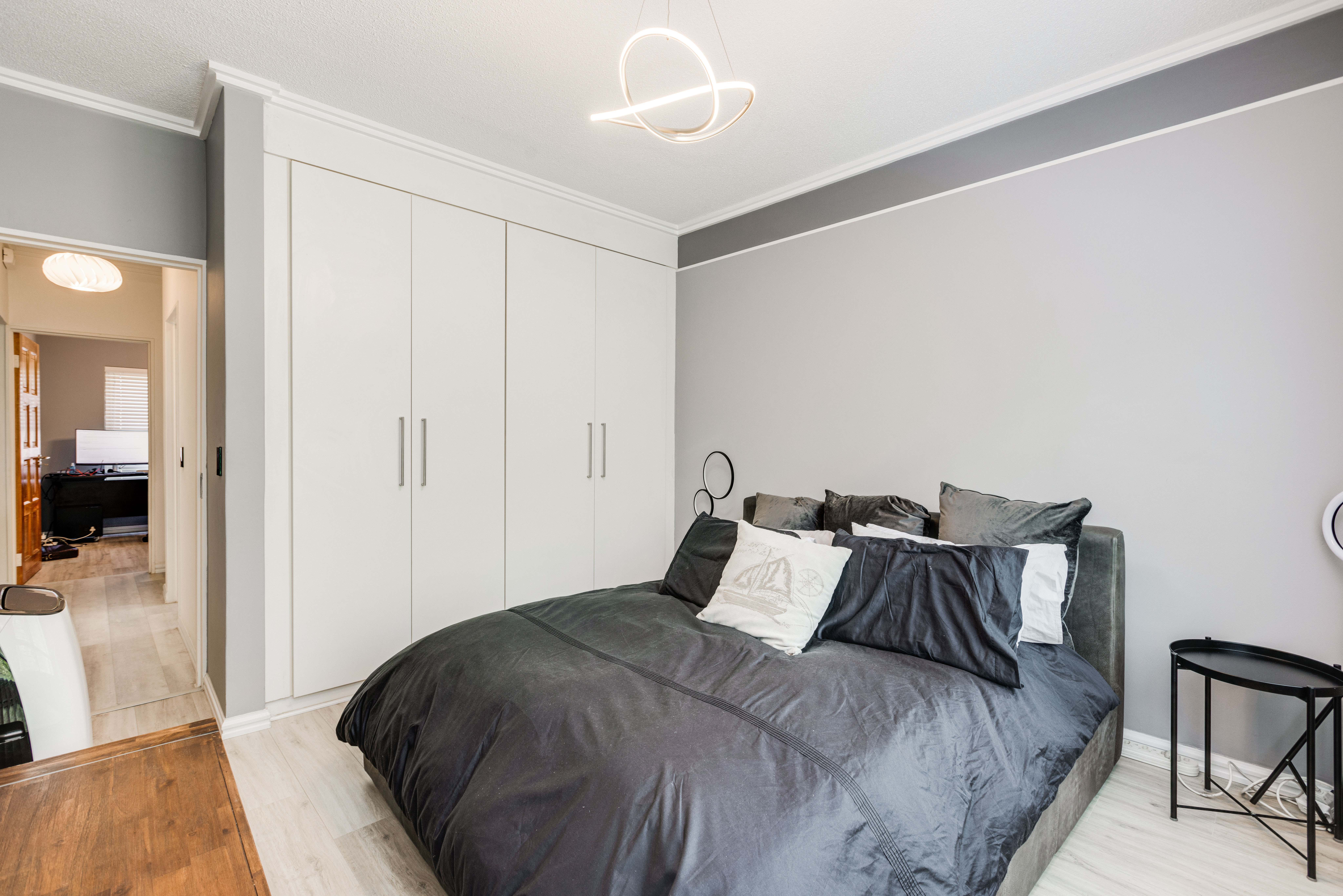 The living areas are complemented by modern flooring, contemporary lighting and a natural flow that enhances the feeling of space and light. The passage leads to a neatly positioned linen cupboard and two well-proportioned bedrooms, both designed to enjoy excellent natural light and a calm, restful atmosphere. The bathroom has been meticulously renovated with modern finishes, featuring a bath and a separate glass-enclosed shower, blending practicality with understated luxury.