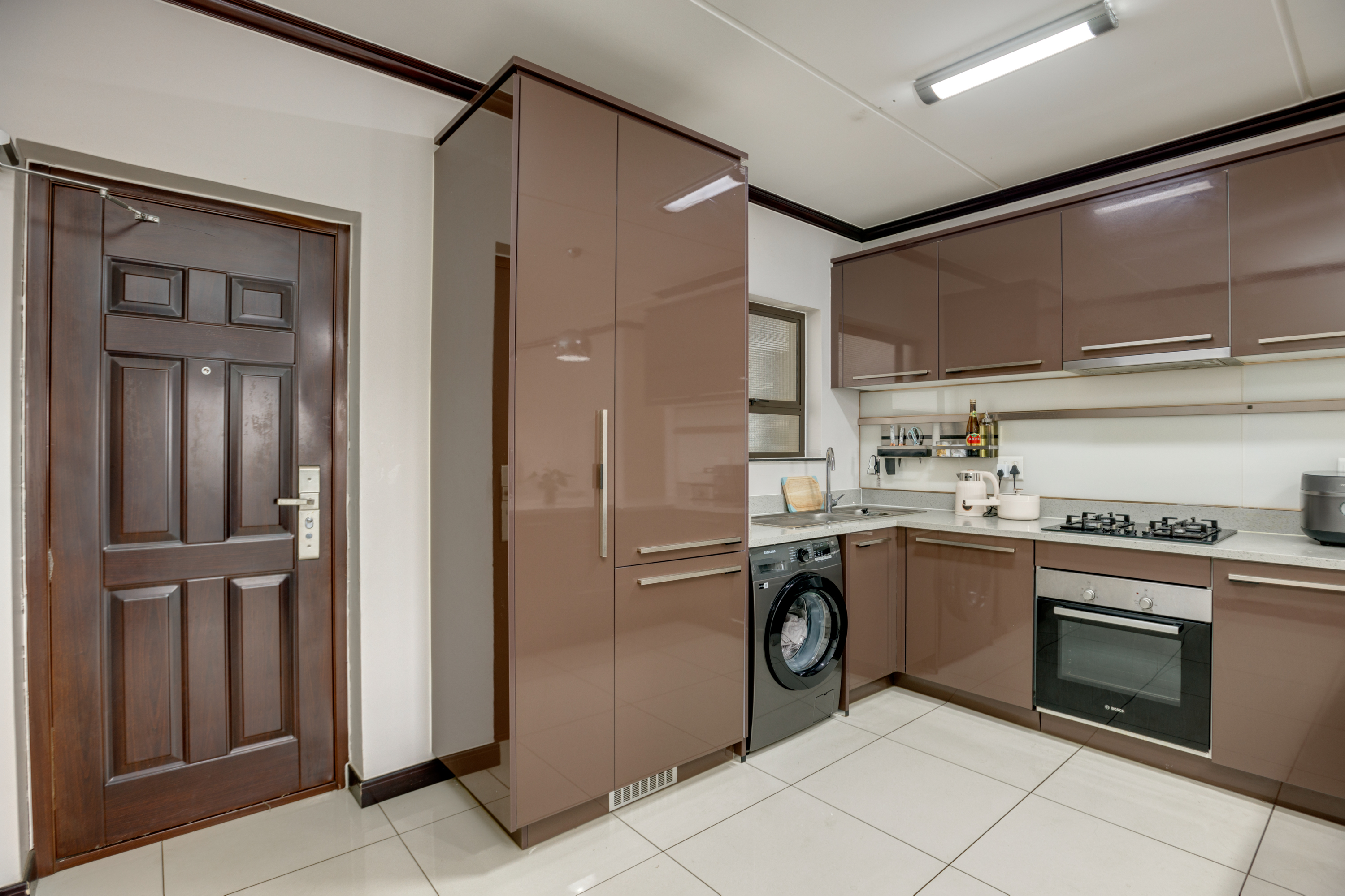 The contemporary kitchen is fitted with sleek cupboards that cleverly conceal the built-in fridge and dishwasher. Stunning quartz countertops, ample storage, and provision for a washing machine and an additional fridge complete the space. Appliances include a gas hob, electric oven, and extractor fan.