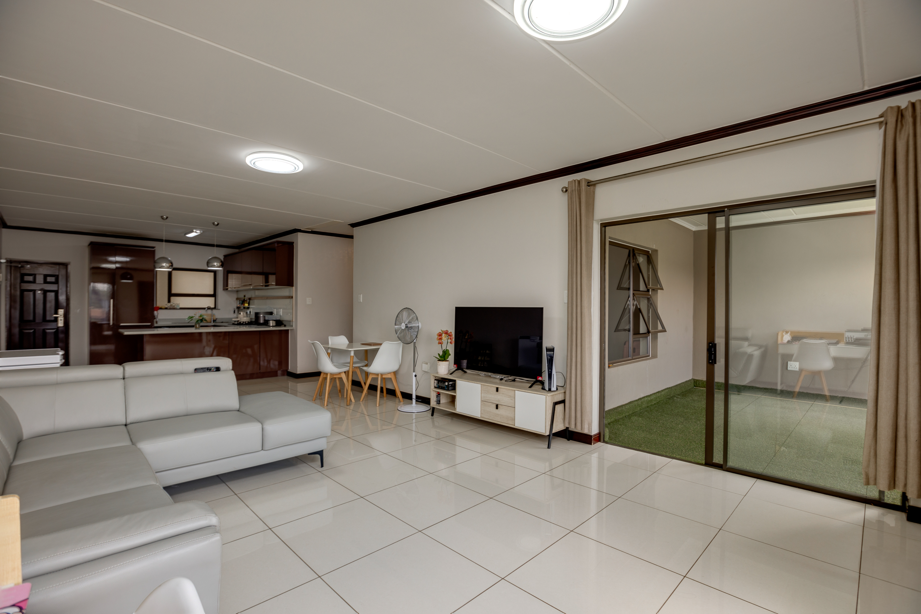 The open-plan lounge, dining area, and kitchen create a seamless flow, ideal for both everyday living and entertaining. The lounge features a fitted cabinet for added style and a library and is spacious enough to accommodate full lounge furniture, large TV, and side tables. Sliding doors open onto a covered balcony with ample space for additional outdoor seating.