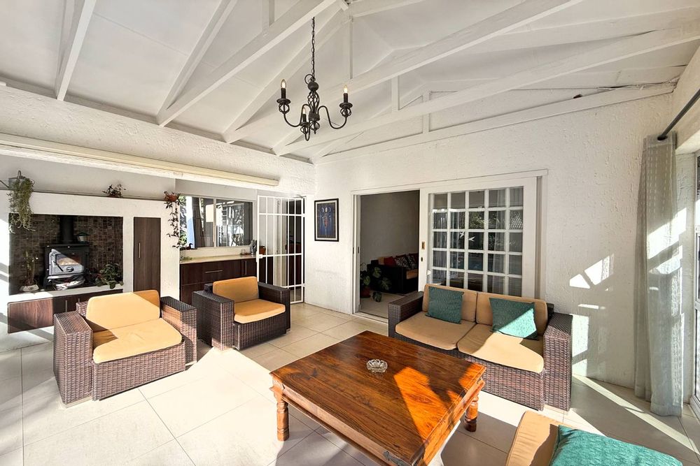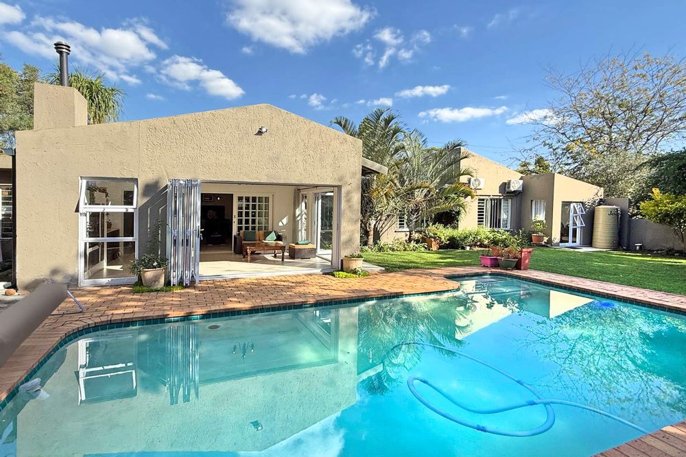 The patio overlooks the lush garden with a sparkling pool, perfect for those late evening Sundowners.