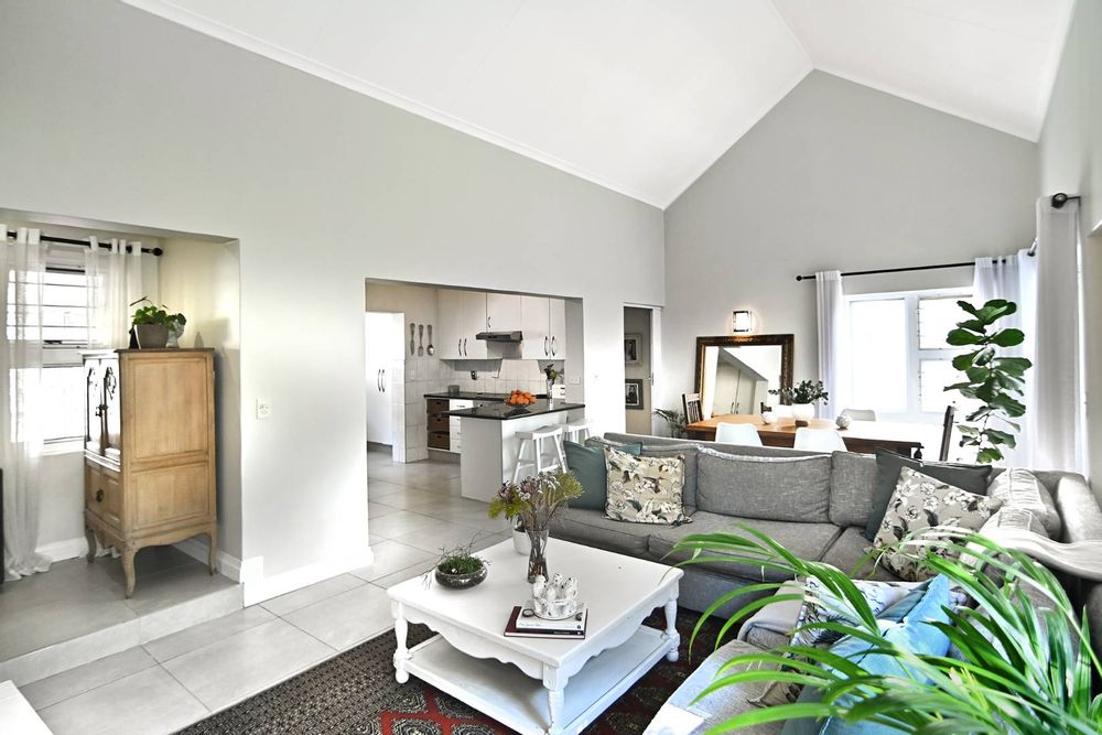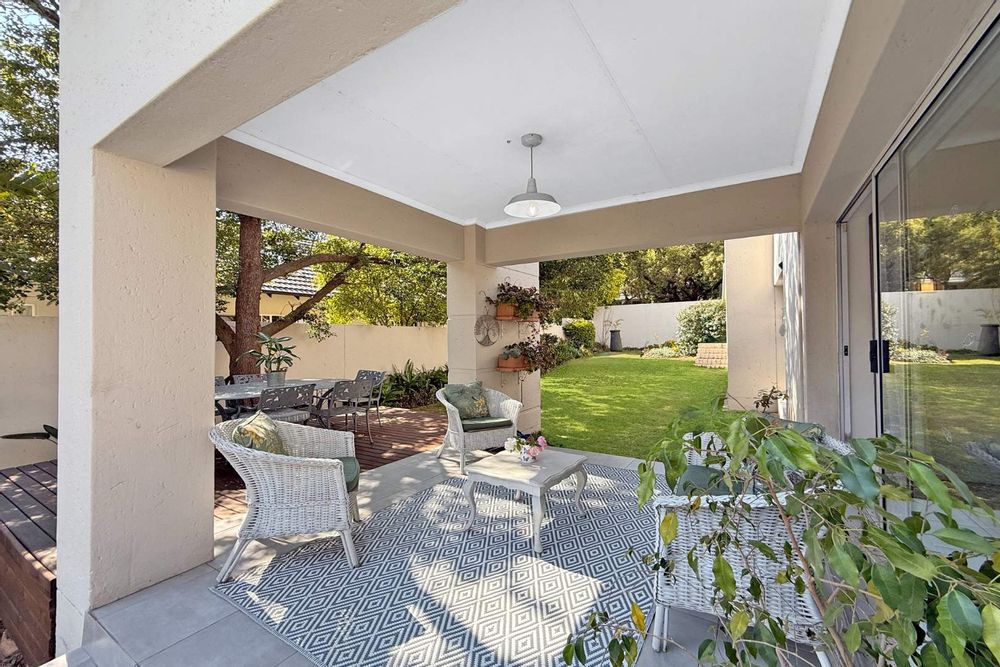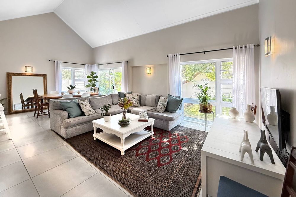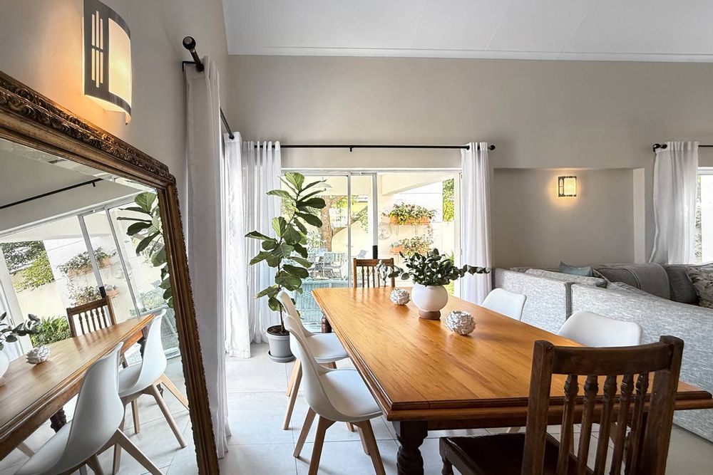 The entrance hall welcomes you into an expansive open-plan double volume living area, seamlessly flowing into a sophisticated dining room. This inviting space extends to a covered patio, perfect for entertaining or enjoying quiet evenings overlooking the beautifully landscaped garden and sparkling pool. Imagine hosting summer braais or having relaxing sundowners by the water. This home is designed for both leisure and luxury.