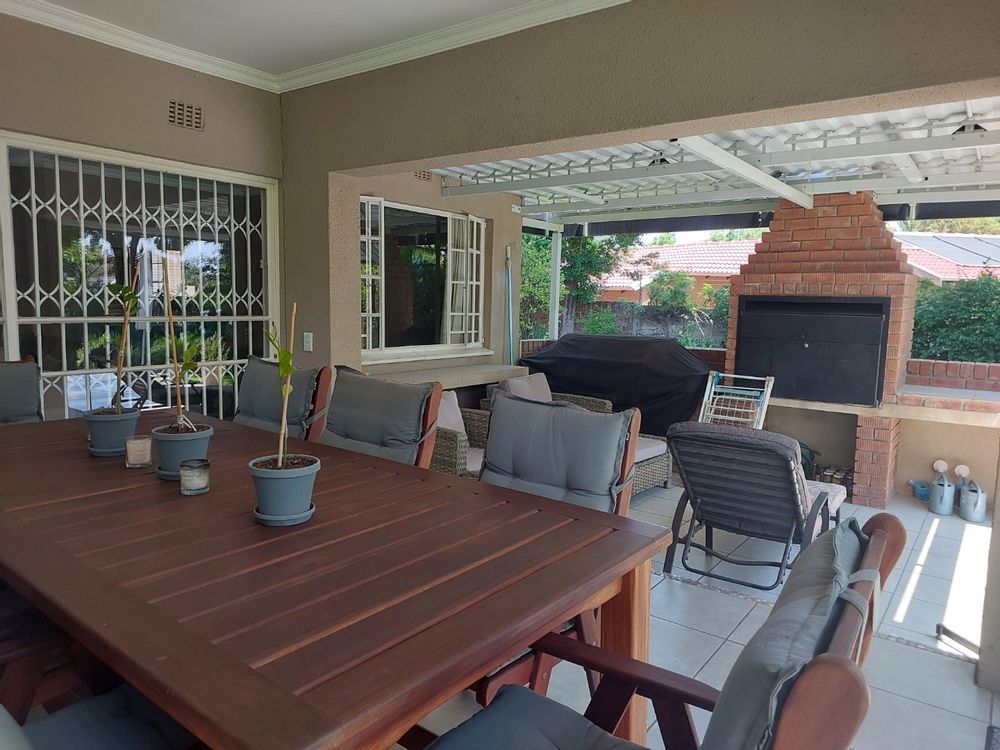 The modern kitchen boasts granite countertops, a scullery with space for two undercounter appliances, a double door fridge, two eye-level ovens, and ample cupboard space, as well as a convenient hatch to the dining area. The spacious open-plan living and dining areas enjoy excellent natural light and flow seamlessly to the outdoor entertainment area.