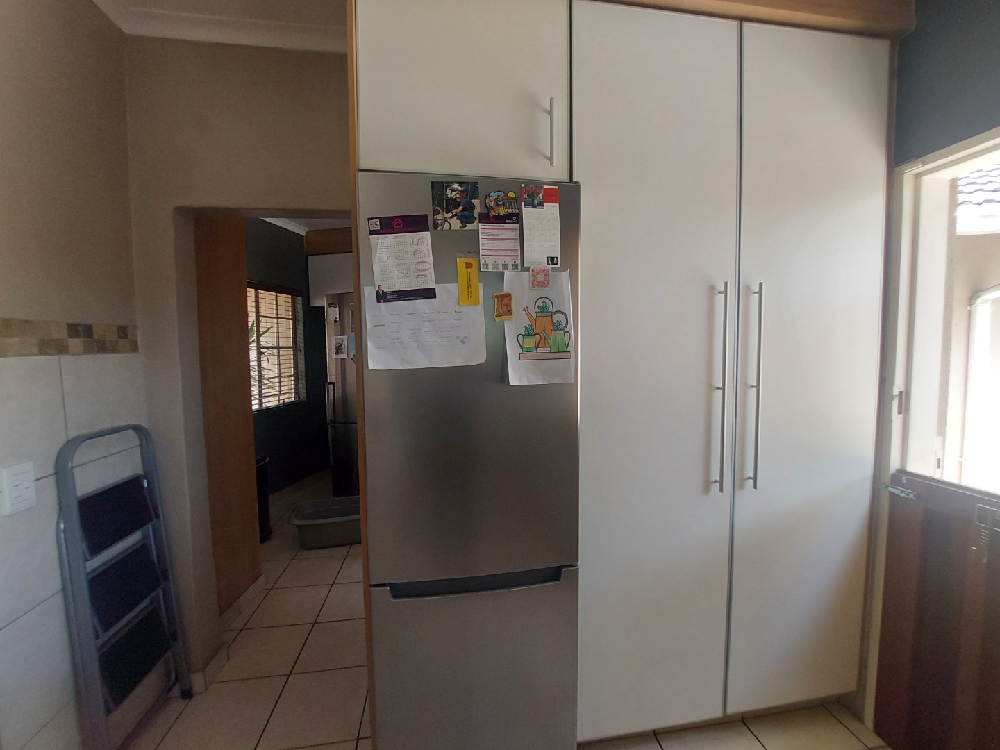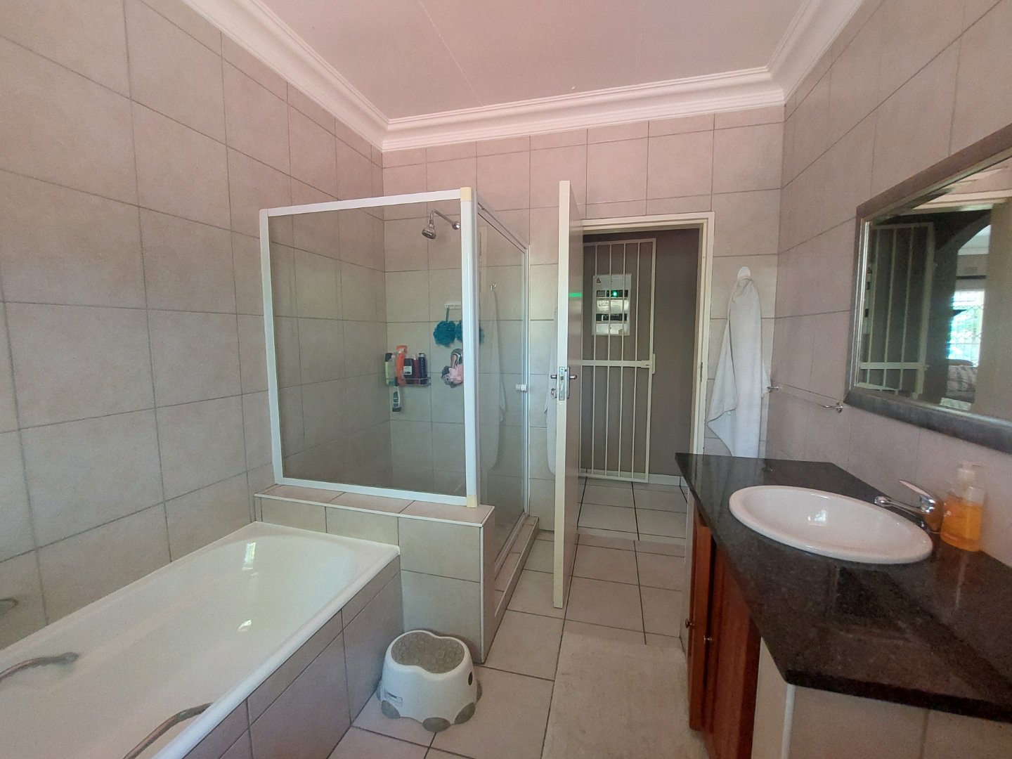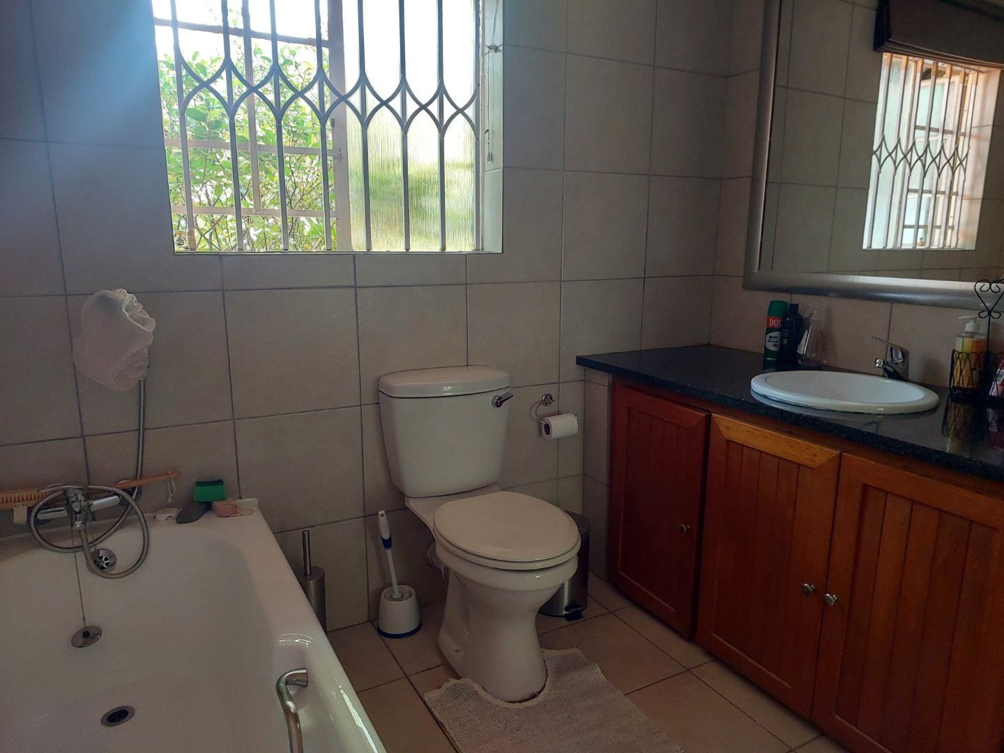Accommodation includes three well-sized bedrooms, all overlooking the lush garden. Each bedroom is carpeted and fitted with built-in cupboards, with an additional security gate for peace of mind. The main bedroom features an en suite bathroom with a bath and generous cupboard space, while the family bedrooms are serviced by a full bathroom with both a bath and a shower.