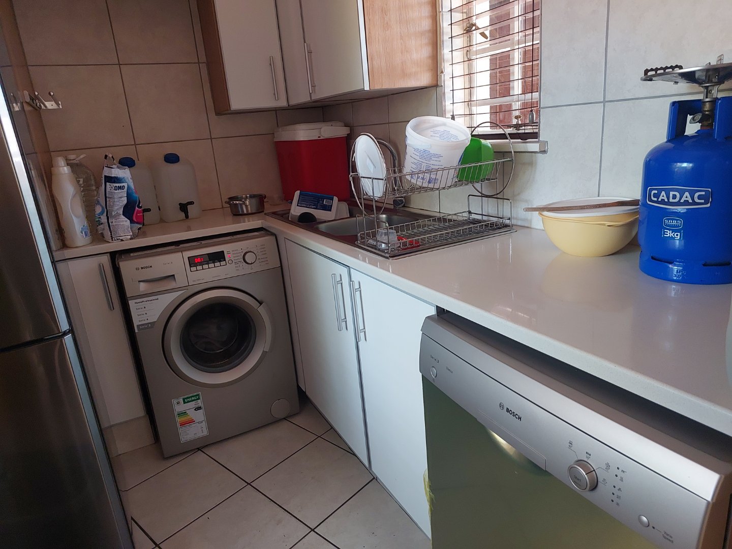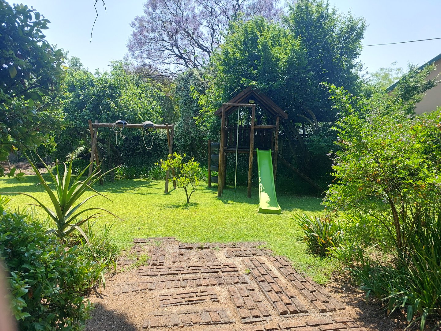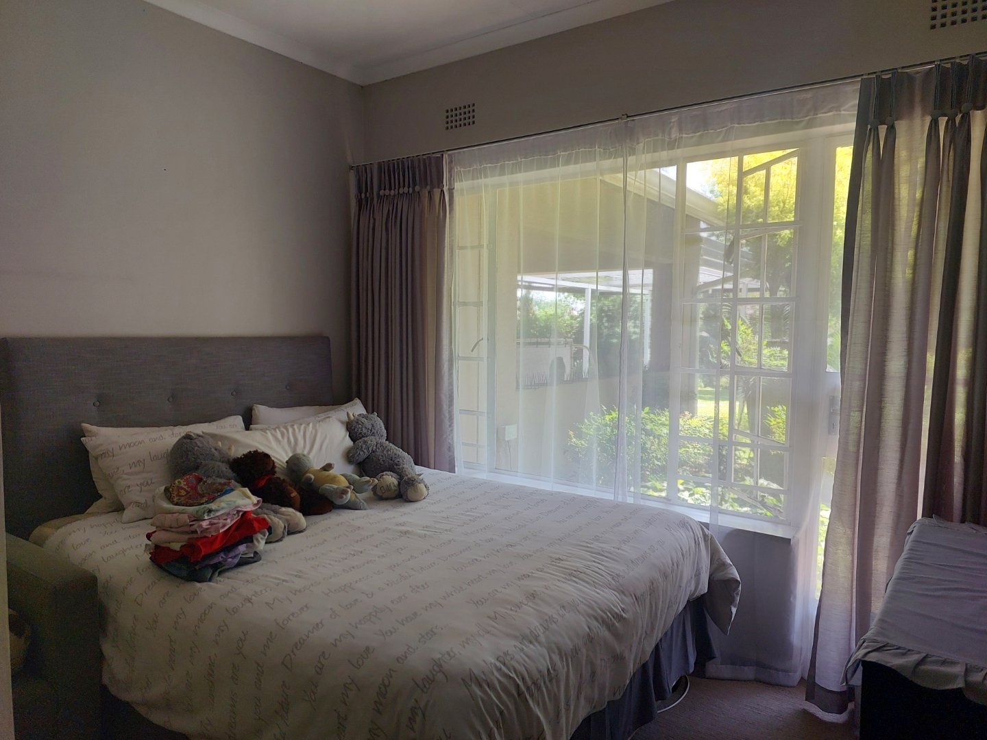 Accommodation includes three well-sized bedrooms, all overlooking the lush garden. Each bedroom is carpeted and fitted with built-in cupboards, with an additional security gate for peace of mind. The main bedroom features an en suite bathroom with a bath and generous cupboard space, while the family bedrooms are serviced by a full bathroom with both a bath and a shower.
