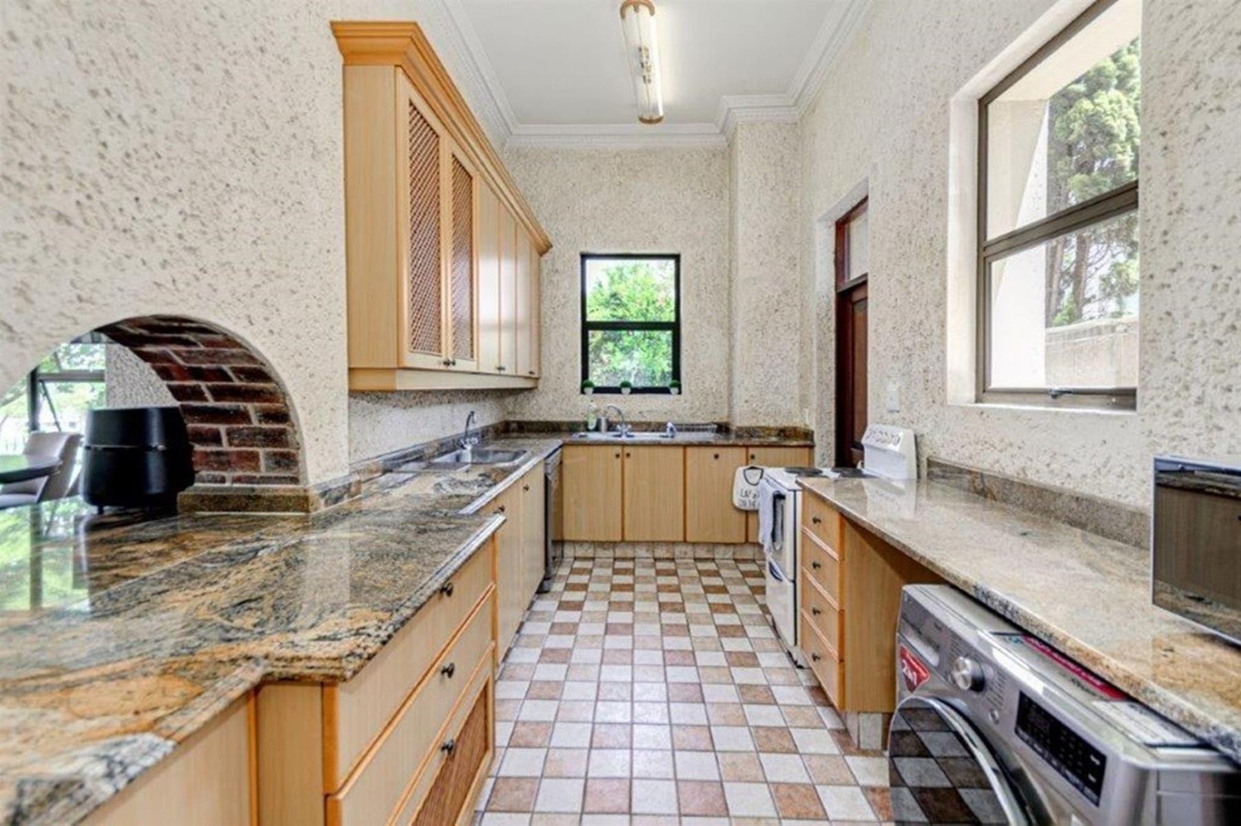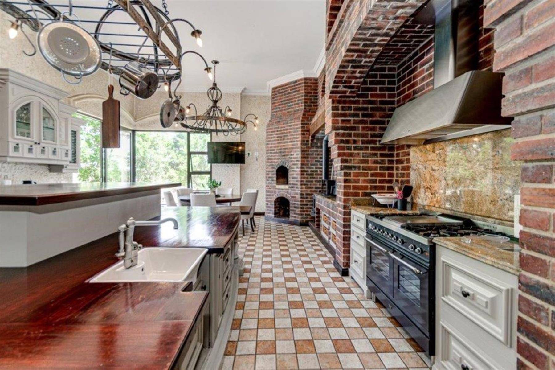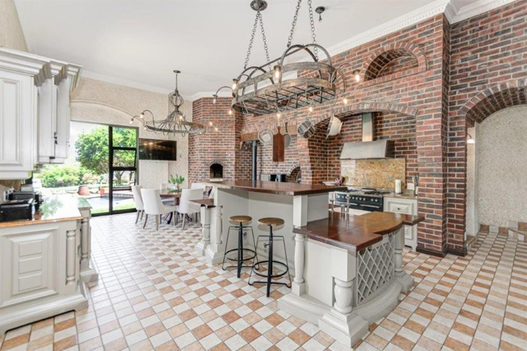 The grand family lounge is adorned with hand-painted murals, creating an artistic atmosphere for relaxation. The large Italian gourmet kitchen is a chef’s dream, complete with a top-of-the-range gas stove, a secondary stove, a built-in pizza oven, and a fireplace that adds warmth and charm. Ample cupboard space ensures excellent storage, with a second kitchen providing additional functionality for family catering needs.