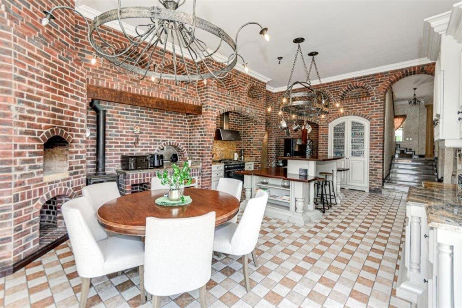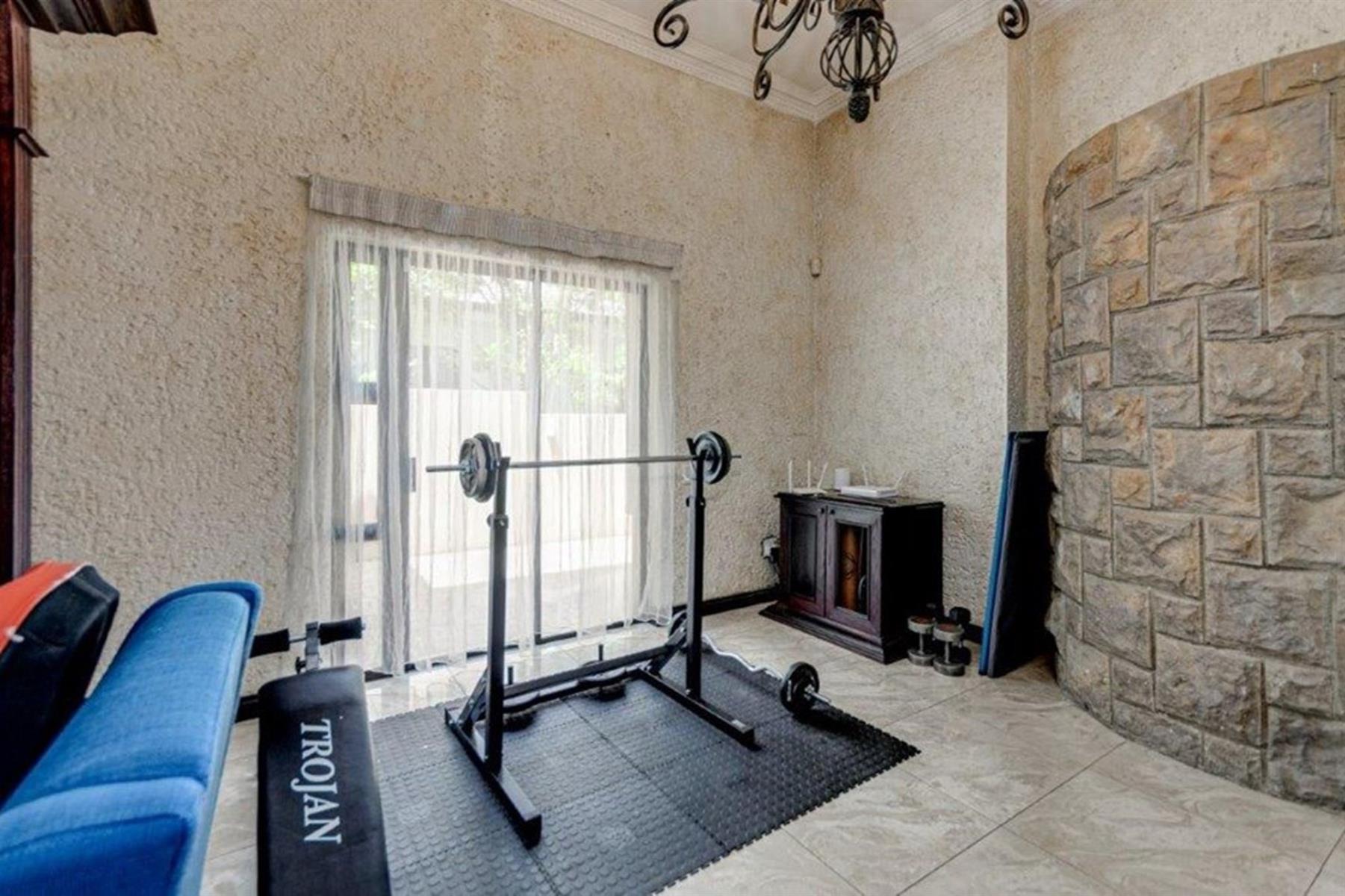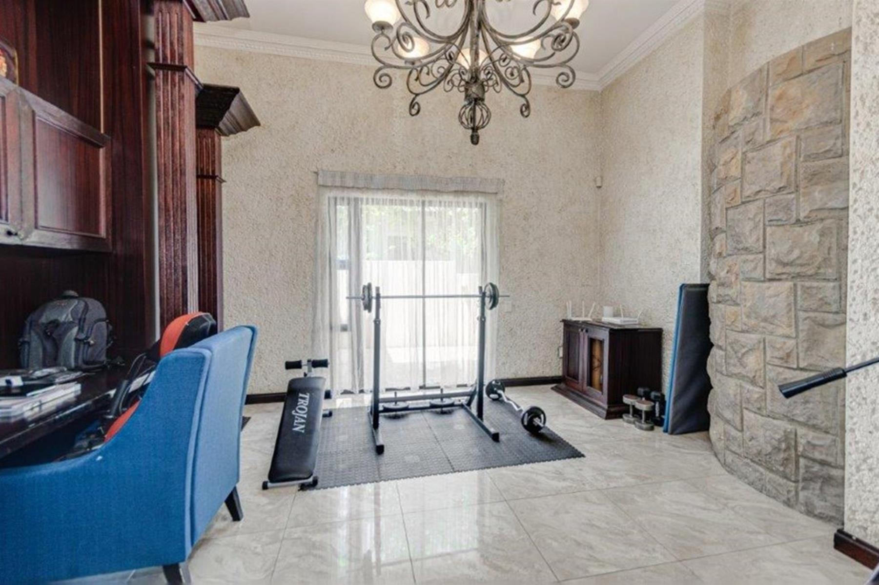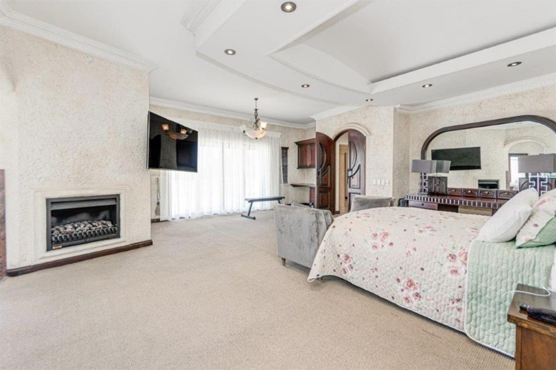 The grand family lounge is adorned with hand-painted murals, creating an artistic atmosphere for relaxation. The large Italian gourmet kitchen is a chef’s dream, complete with a top-of-the-range gas stove, a secondary stove, a built-in pizza oven, and a fireplace that adds warmth and charm. Ample cupboard space ensures excellent storage, with a second kitchen providing additional functionality for family catering needs.
