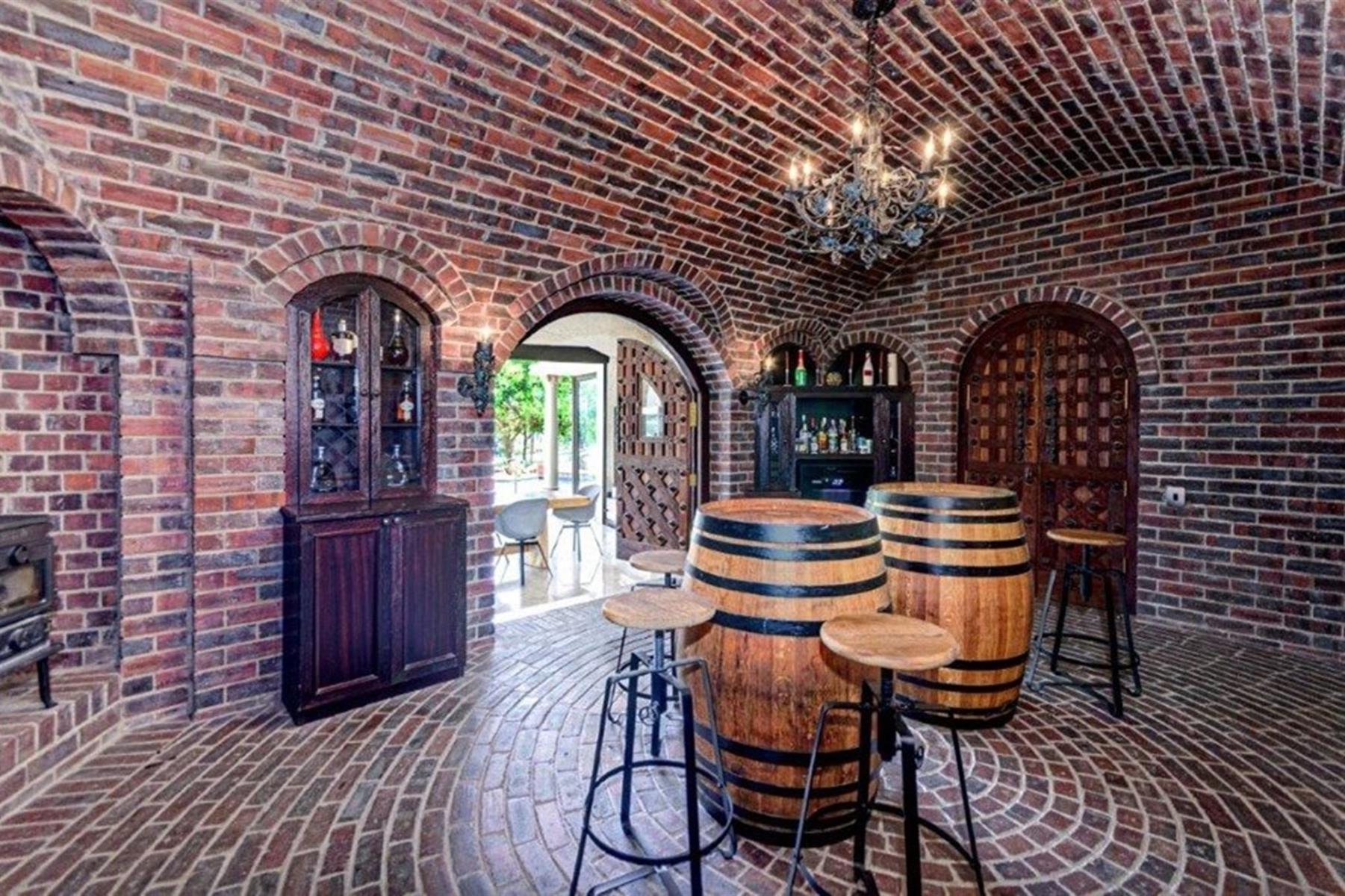 A 500-bottle wine cellar serves as the focal point of the home, with a built-in fireplace, offering the perfect ambiance for wine lovers and entertaining guests. The large dining room comfortably seats 10, making it ideal for hosting family gatherings and dinner parties. A state-of-the-art in-door gas braai is also featured in the dining area.