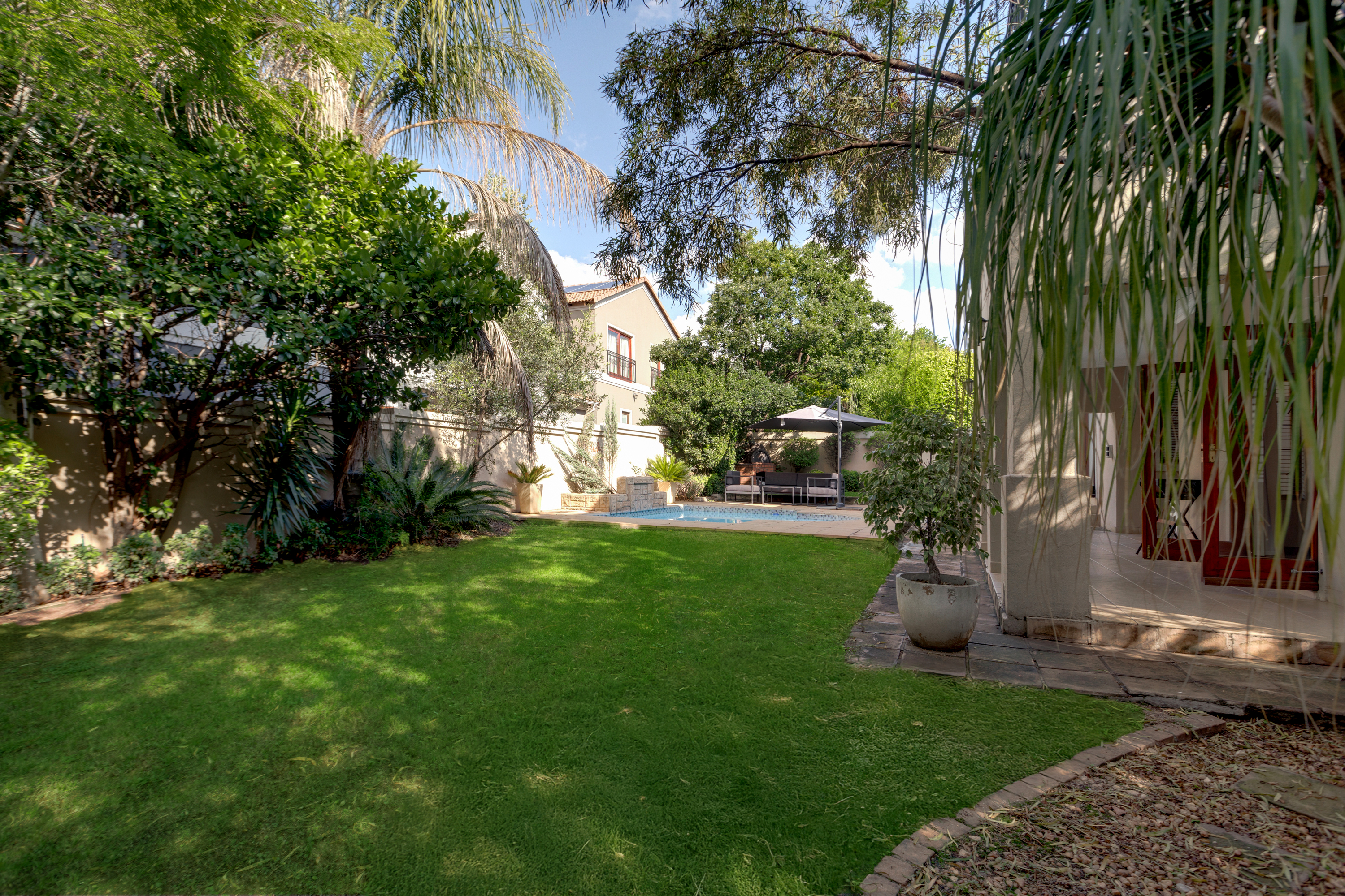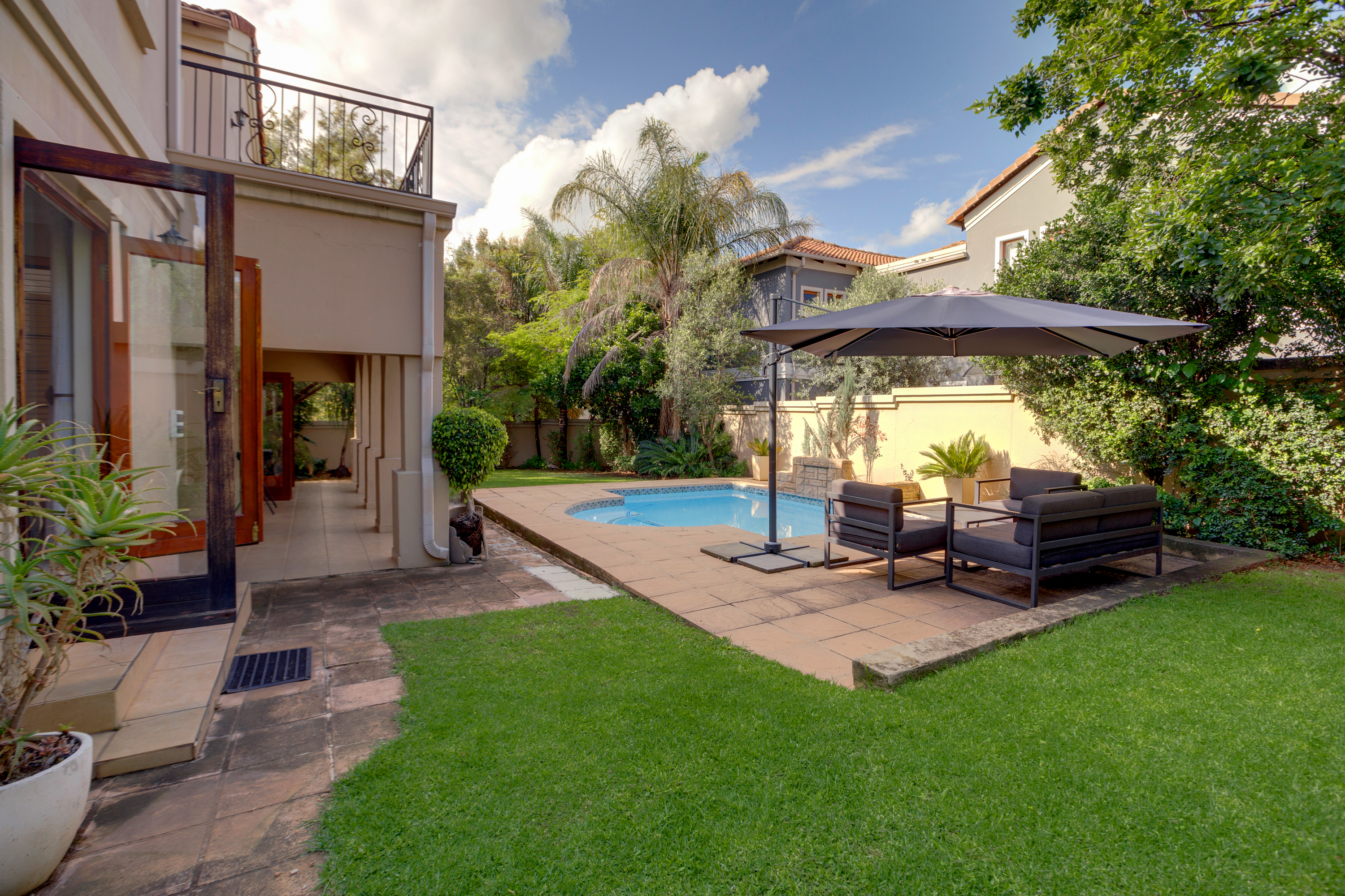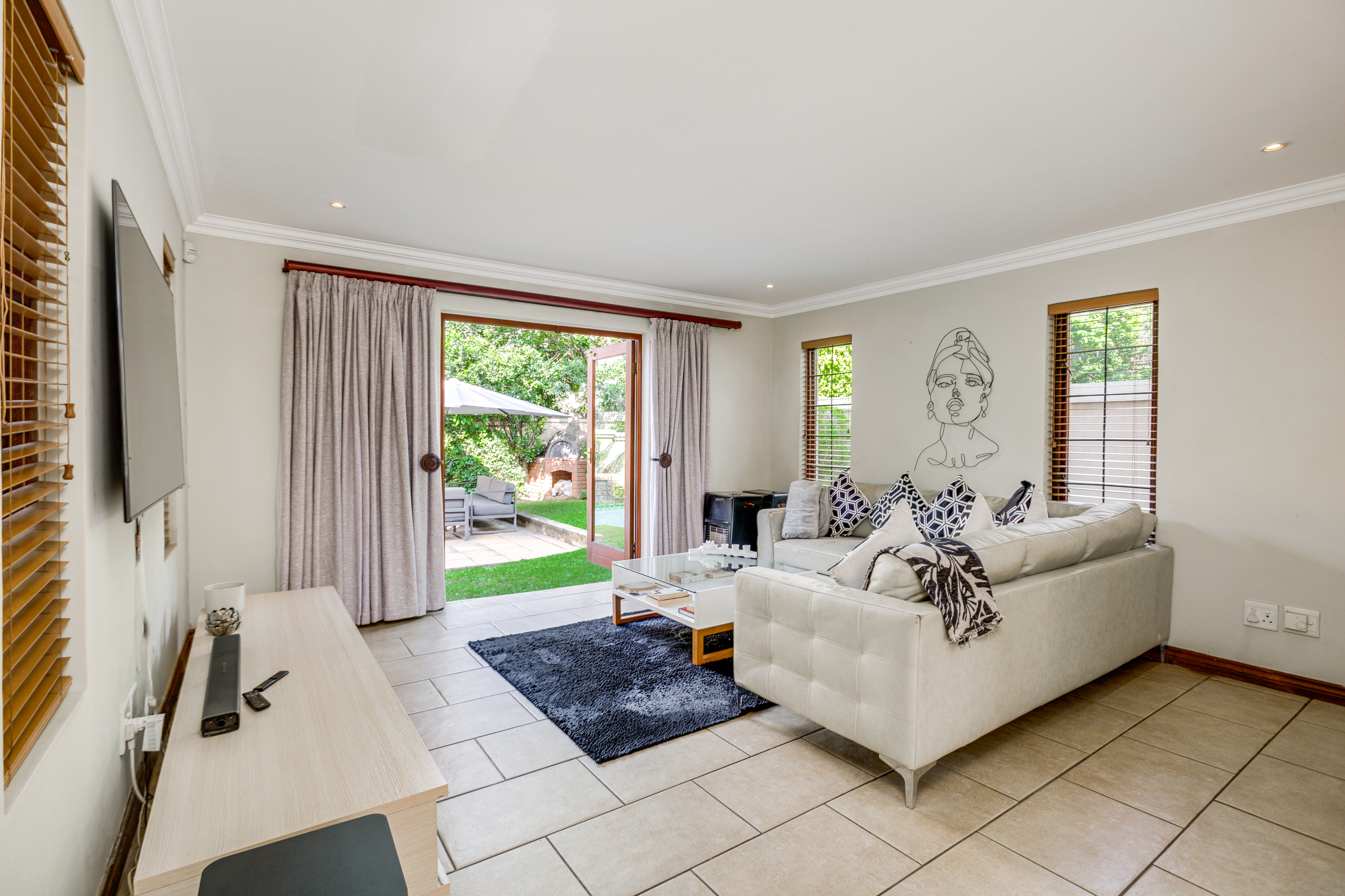 Both lounges open via sliding doors to a generous covered veranda, overlooking a lush, irrigated garden, a sparkling pool with a water feature, and a built-in pizza oven—a perfect setting for weekend relaxation and entertaining.