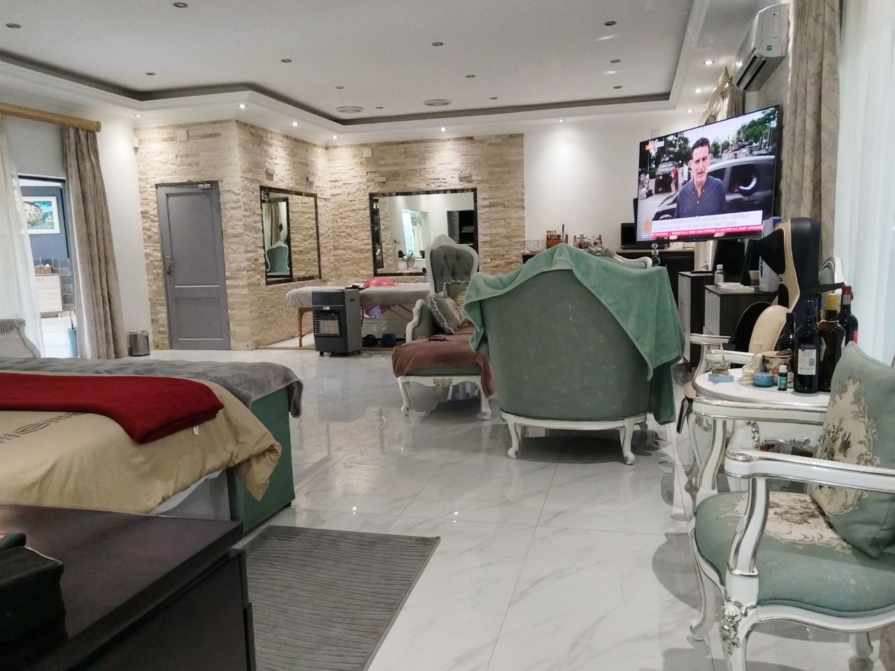 The main house consists of 5 bedrooms, Main Bedroom is spectacular with a jacuzzi, fireplace, lounge area, dressing room and a simply stunning full bathroom, The second bedroom is also En-suite with a dressing room and sliding door onto the garden, there is a third full bathroom for the other 3 bedrooms. The Open-plan living areas (with fireplace) flows out onto the large entertainment patio with a built-in braai. The 2nd lounge also leads out onto the entertainment area. The gourmet kitchen is open-plan and fitted with a Gas stove. The whole house is fitted with aircons.