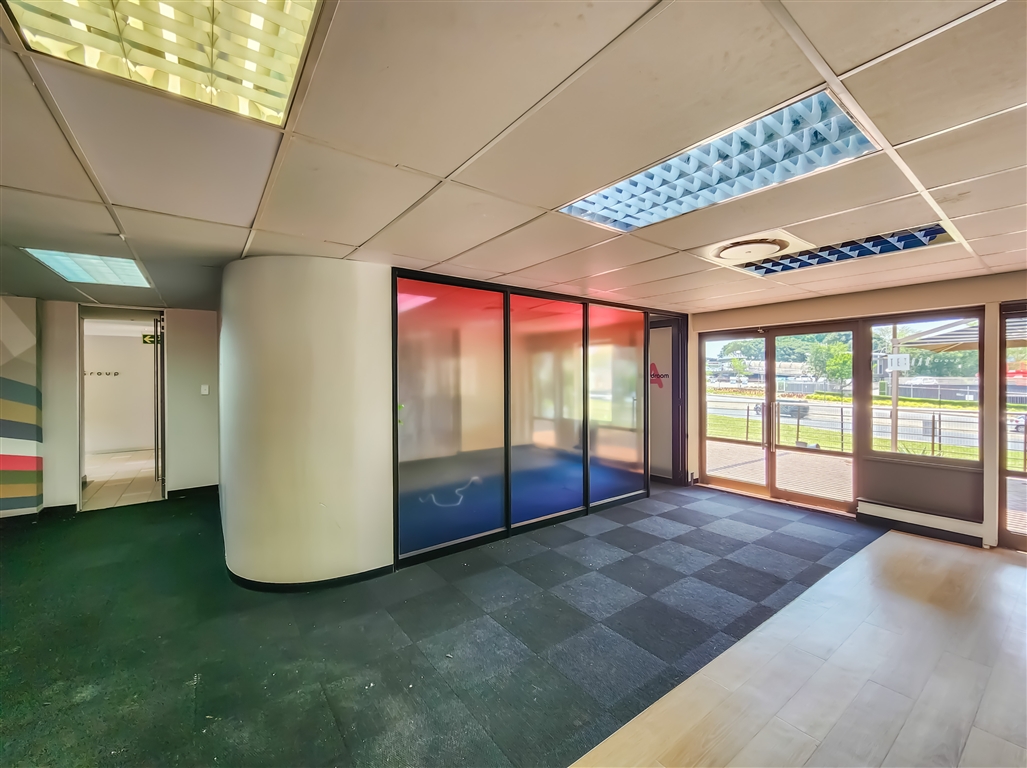 This contemporary ground-floor office in Little Fourways Office Park offers a welcoming reception area that leads into a stylish six-seater boardroom and a private, fully equipped kitchen. The rear section features a spacious open-plan workspace, three private offices, and an additional boardroom. Both the reception area and open-plan office enjoy direct access to a shared patio with scenic views over Leslie Road.