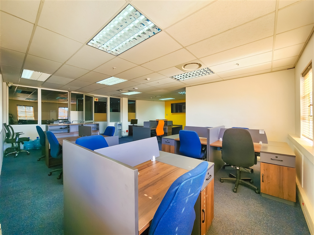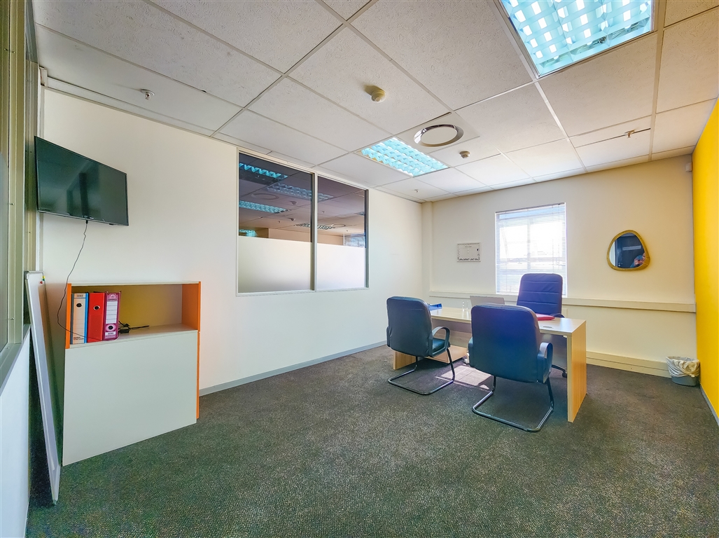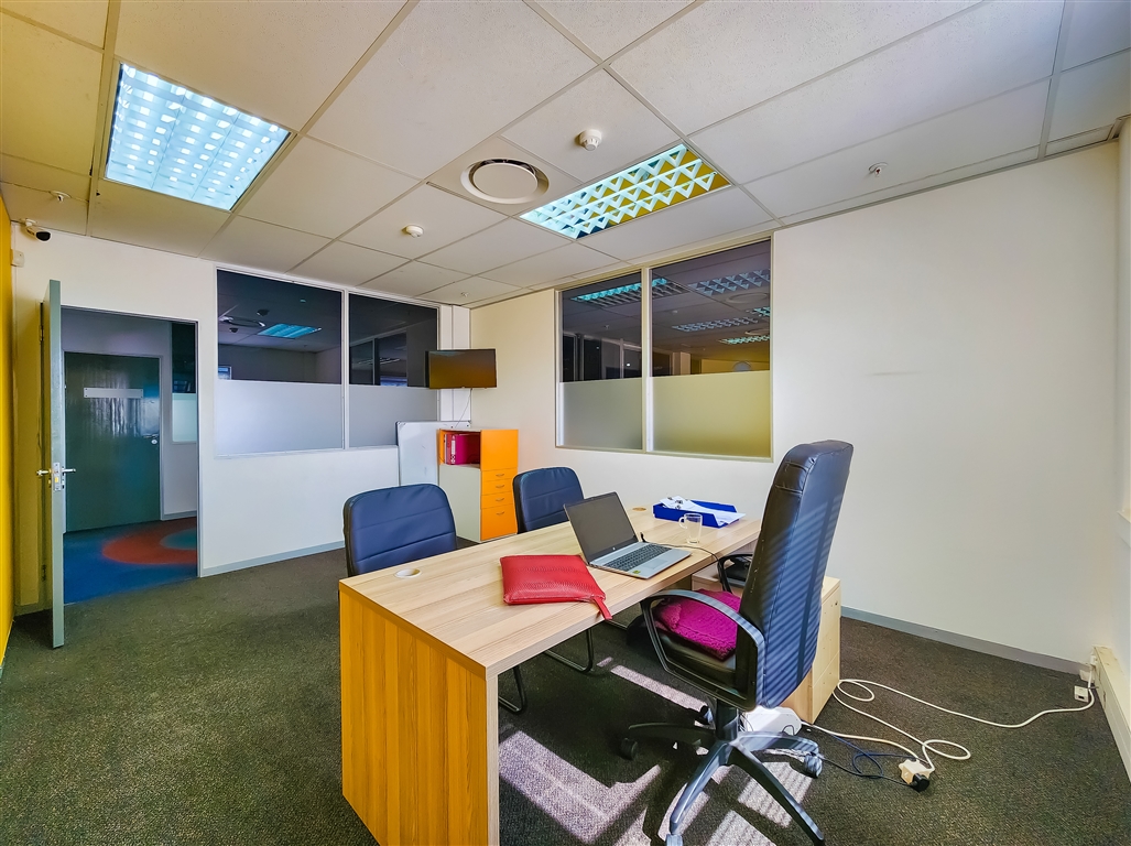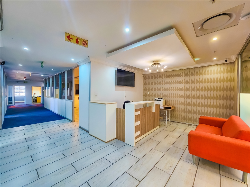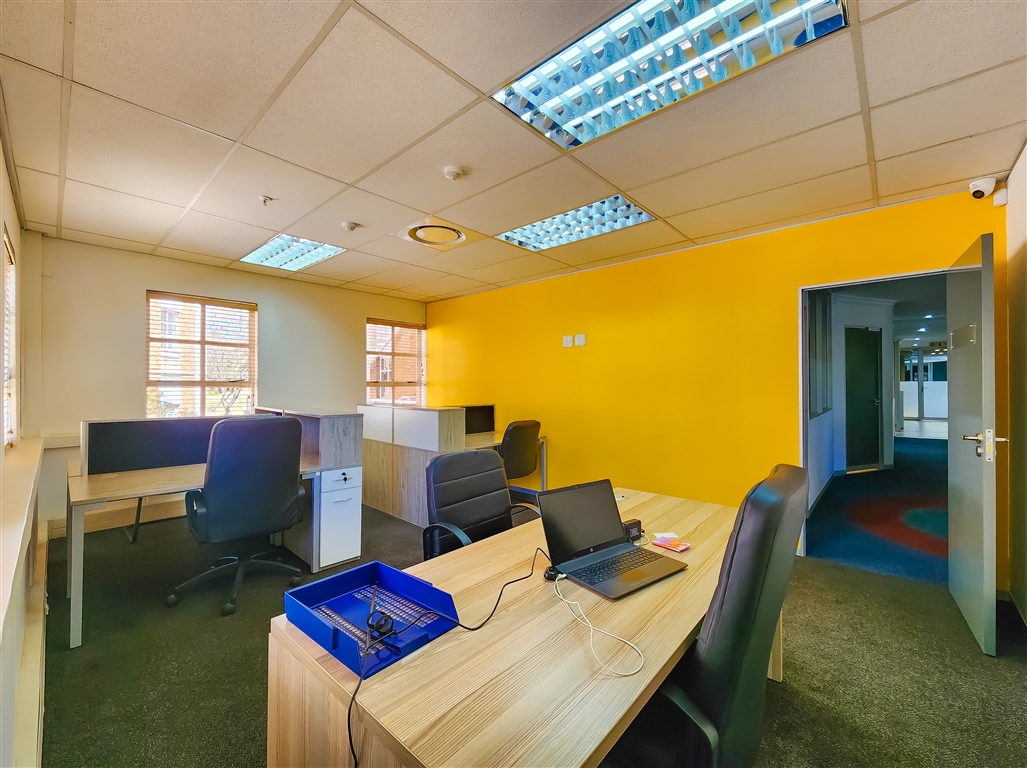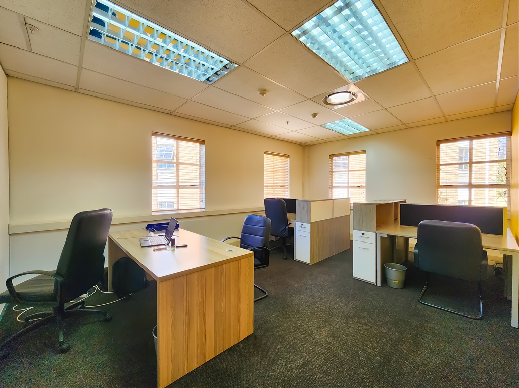 This ground floor office to Let in Fourways Golf Park welcomes you with a modern reception area followed by a spacious boardroom that can easily accommodate a 12-seater. A passage further leads you to 2 spacious offices that can comfortably accommodate multiple desks and 2 individual offices. The office enjoys a private dedicated kitchen with running water and a spacious pause area with direct access to the shared patio that leads to golf course. The building is supported by a back up generator. All the windows have ready fitted blinds. The floor is a mix of modern tiles and carpets. Metro fibre is the fibre service provider in the park. Kindly watch the video for a virtual walkthrough.