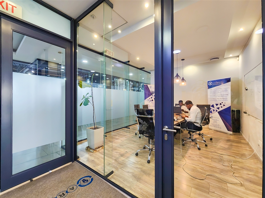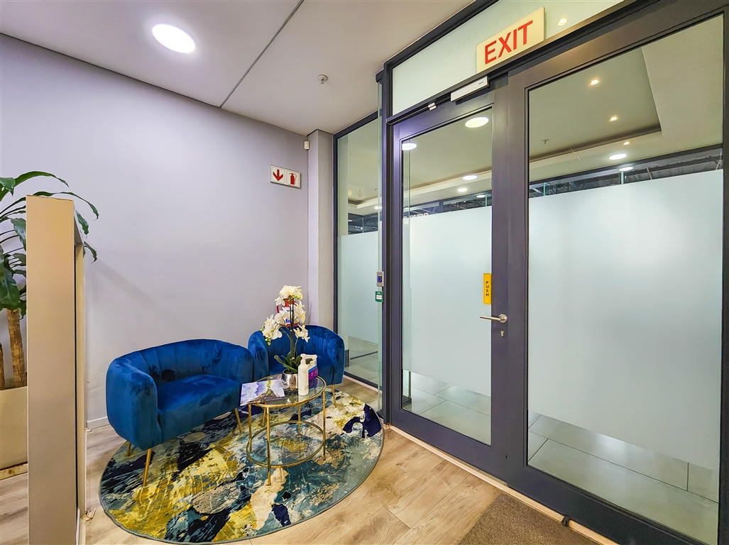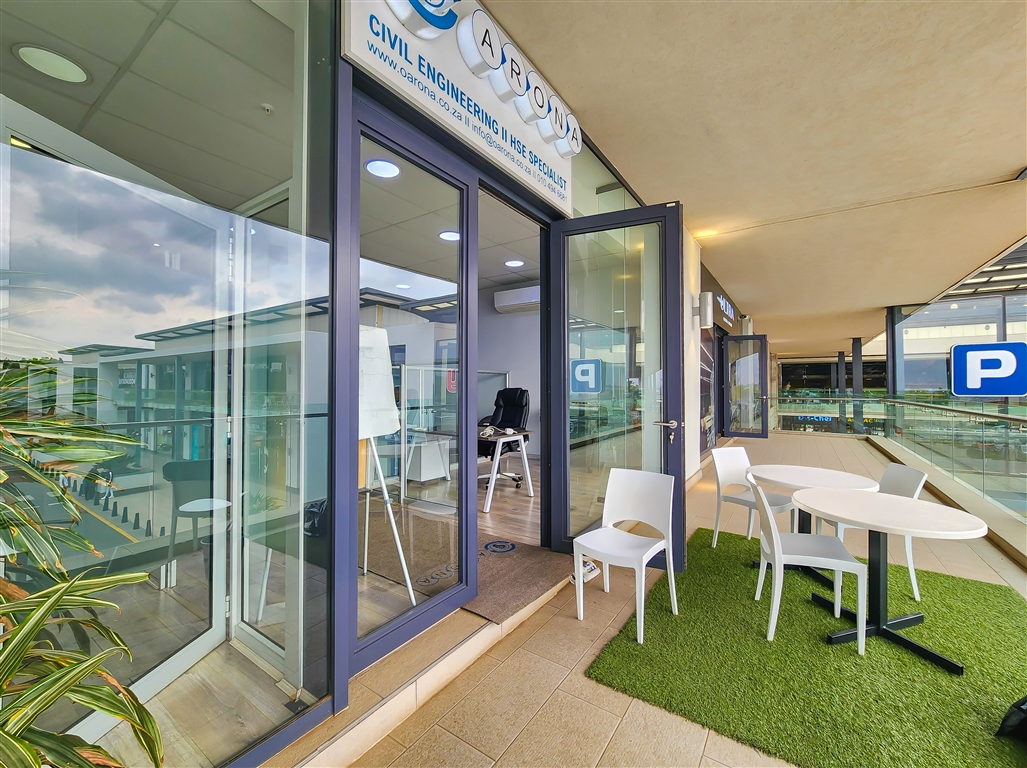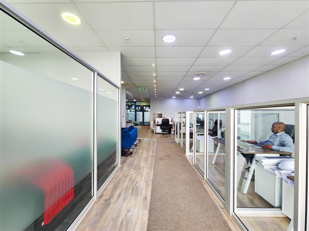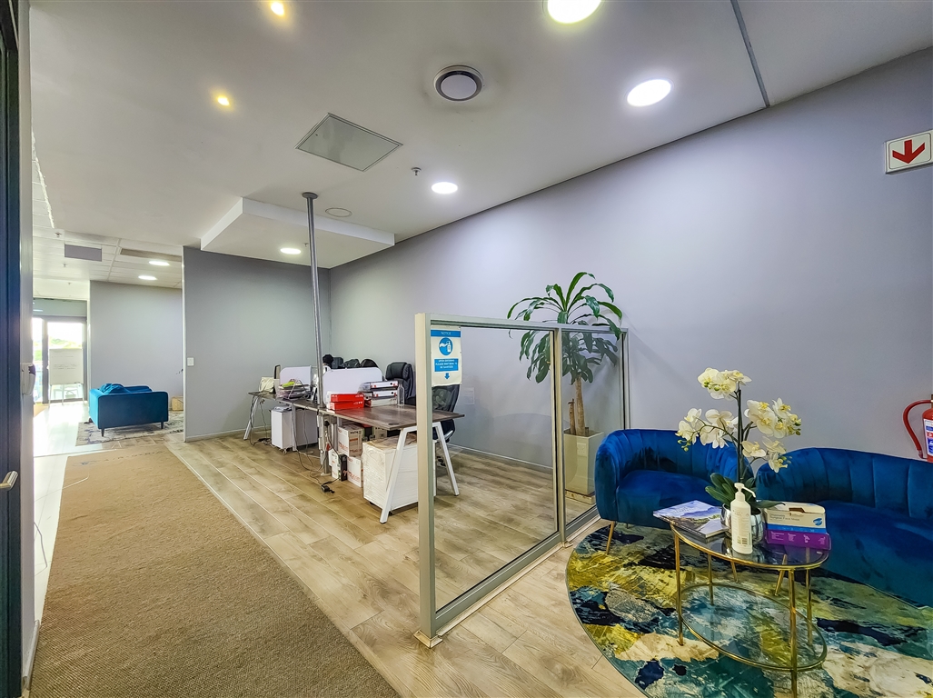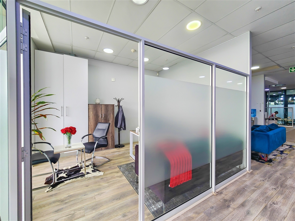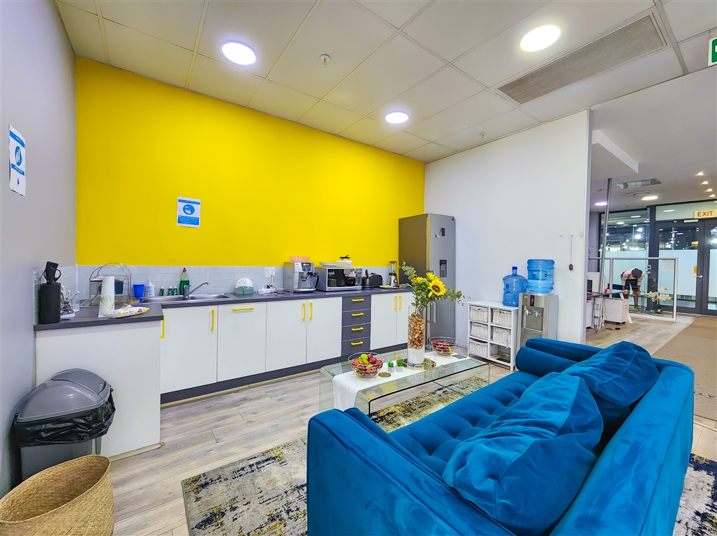 This contemporary office space available for rent in Dainfern Square features a welcoming reception area leading to a glass-enclosed boardroom, ideal for an 8-seater setup. The layout further includes an open-plan workspace with semi-private cubicles, a sleek modern open plan kitchen, and one private office. Additionally, the open-plan area offers access to a balcony overlooking the shopping center. The space provides excellent branding opportunities and boasts stylish vinyl flooring throughout.