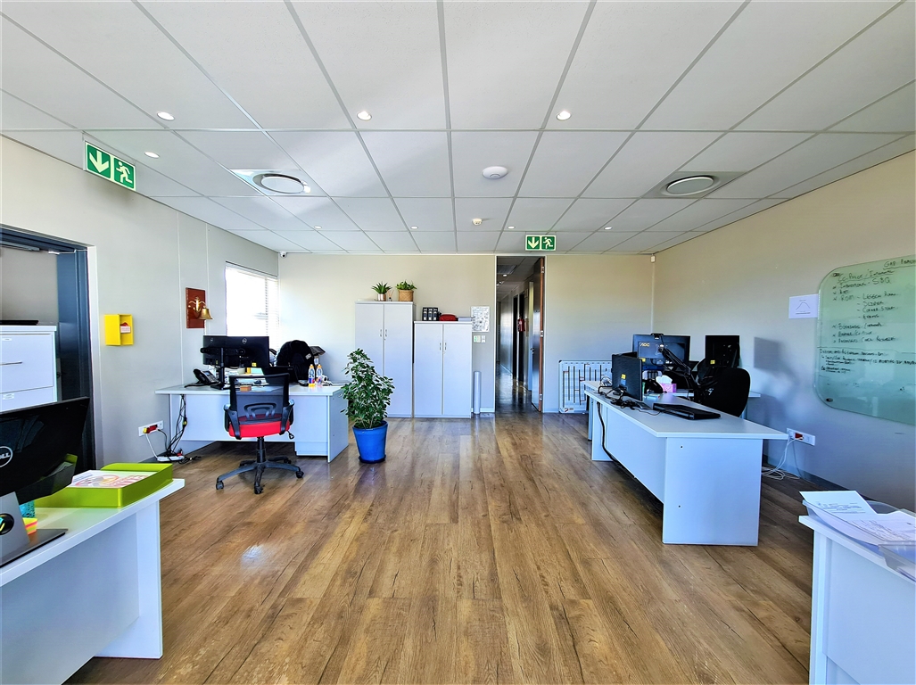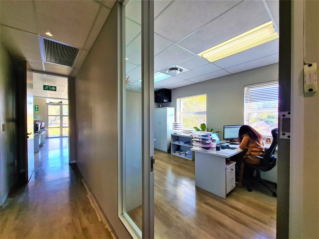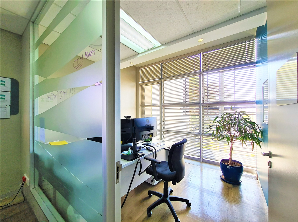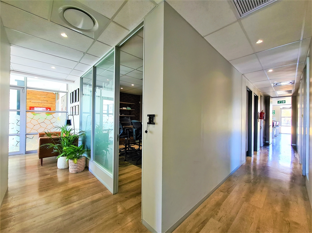 This contemporary 190m2 first-floor office to let in Willow Wood Office Park offers a bright and welcoming reception area, followed by a spacious boardroom that comfortably accommodates a 10-seater table. The office further features four generously sized private offices, each capable of fitting multiple desks, along with private dedicated ladies and gents restrooms and a private kitchen. At the rear, an open-plan workspace provides a flexible layout for collaborative work. The reception area, open-plan office, and two private offices have direct access to both private and shared balconies, enhancing the workspace with natural light and outdoor views. The office is fitted with sleek vinyl flooring throughout, and all windows come with pre-installed blinds.