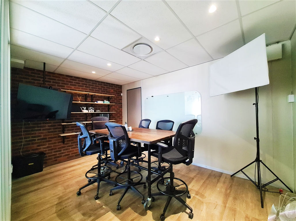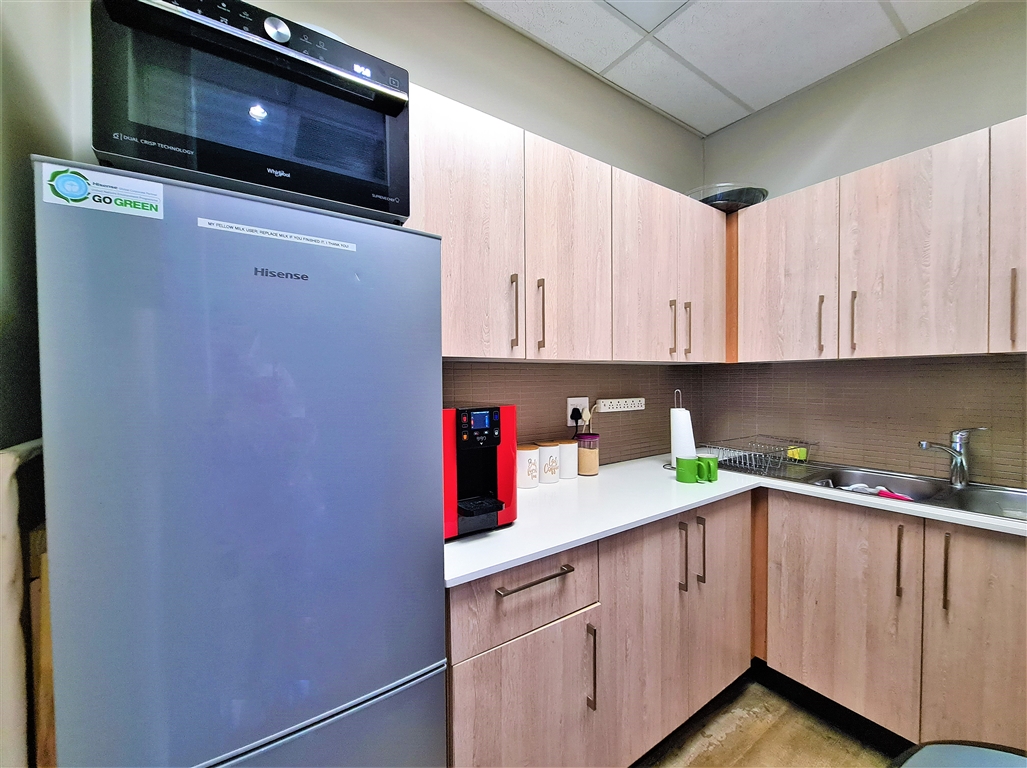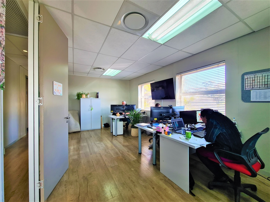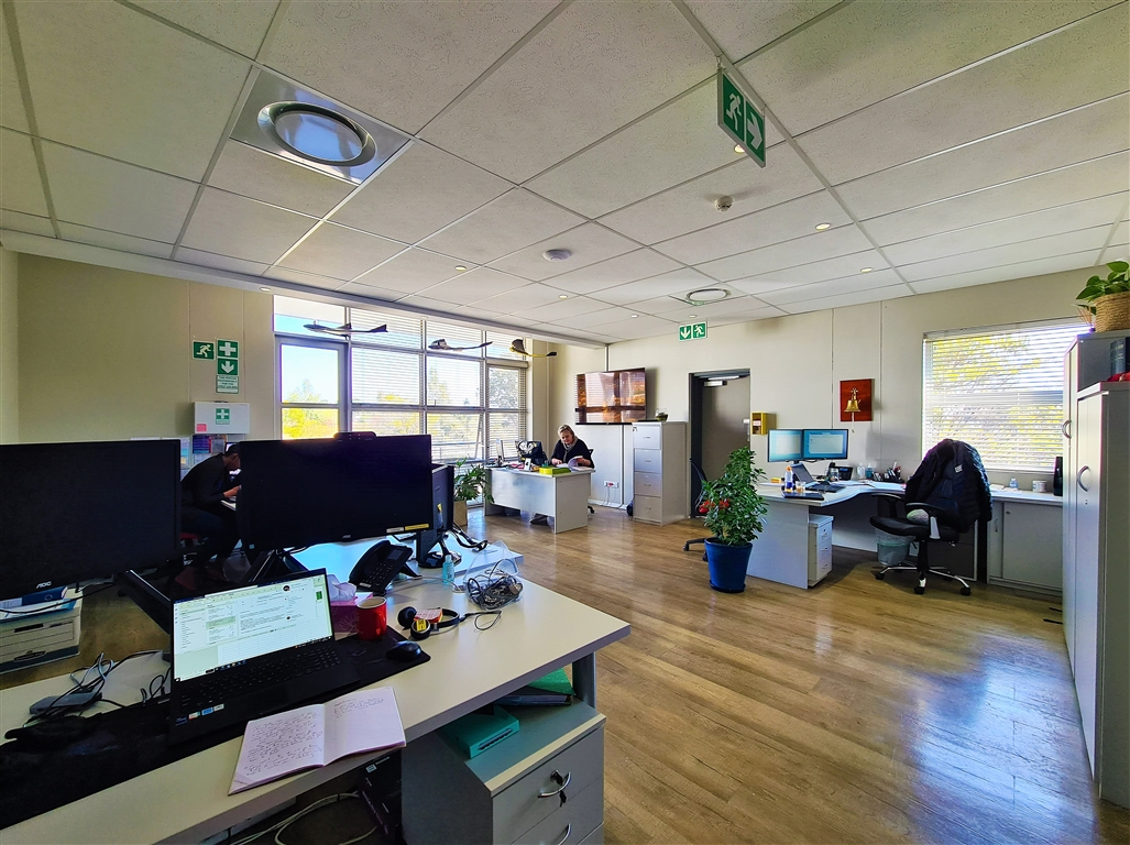 This contemporary 190m2 first-floor office to let in Willow Wood Office Park offers a bright and welcoming reception area, followed by a spacious boardroom that comfortably accommodates a 10-seater table. The office further features four generously sized private offices, each capable of fitting multiple desks, along with private dedicated ladies and gents restrooms and a private kitchen. At the rear, an open-plan workspace provides a flexible layout for collaborative work. The reception area, open-plan office, and two private offices have direct access to both private and shared balconies, enhancing the workspace with natural light and outdoor views. The office is fitted with sleek vinyl flooring throughout, and all windows come with pre-installed blinds.