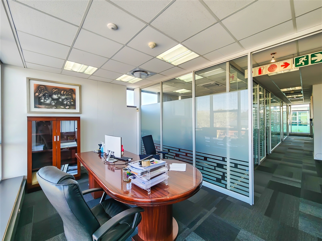 This modern office space to let in Design Quarter combines style, functionality, and comfort in a prime location. The office welcomes you with a modern reception area that flows seamlessly into a spacious boardroom. A passage leads to several glass-enclosed private offices, offering both privacy and transparency, while a well-positioned kitchen at the rear provides convenience for staff. Strategic use of glass ensures the office is flooded with natural light, creating an open and uplifting atmosphere. The space is carpeted throughout for a professional finish and is fully equipped with air conditioning to ensure year-round comfort. This is an ideal workspace for businesses looking for a modern, light-filled office in a sought-after Fourways location.