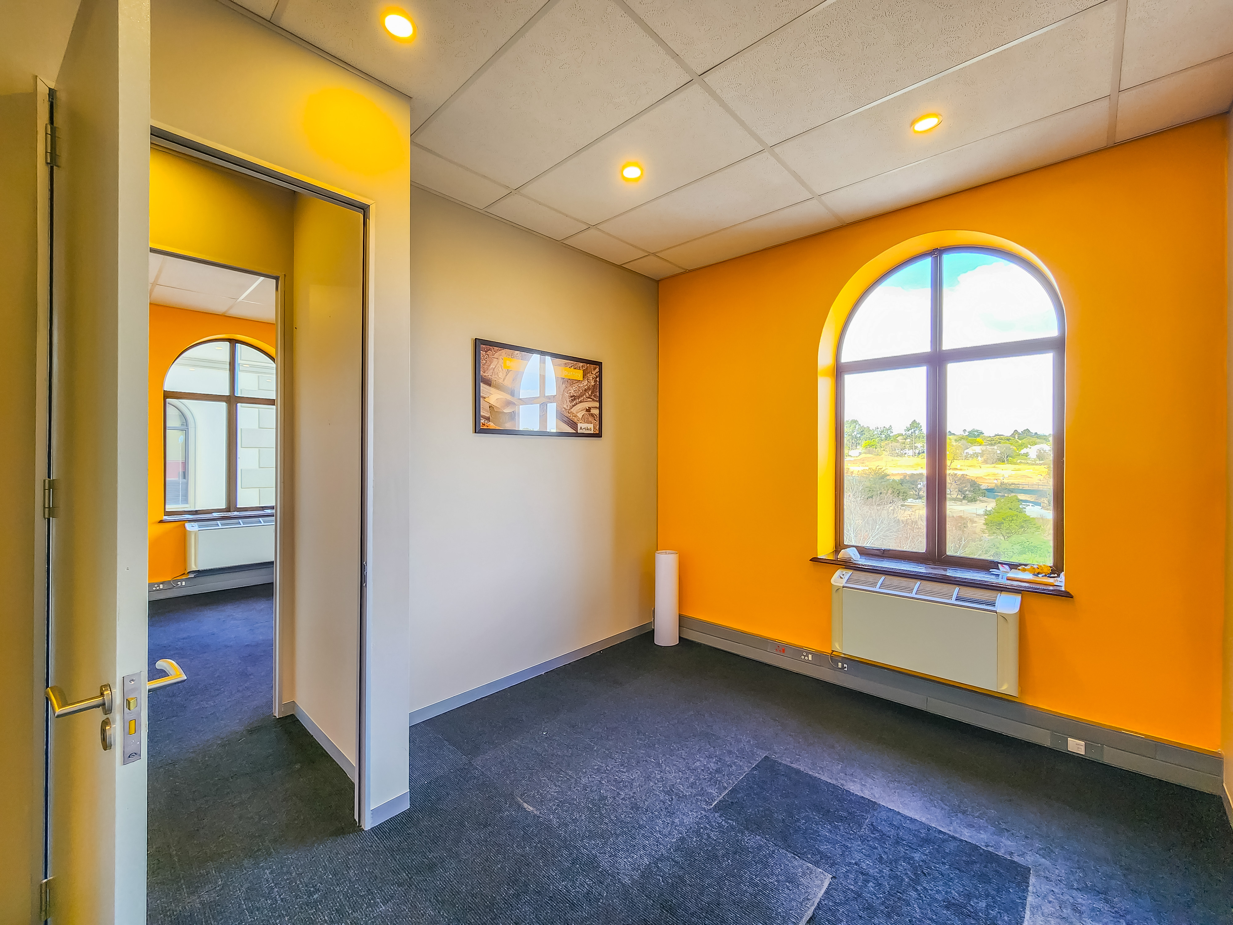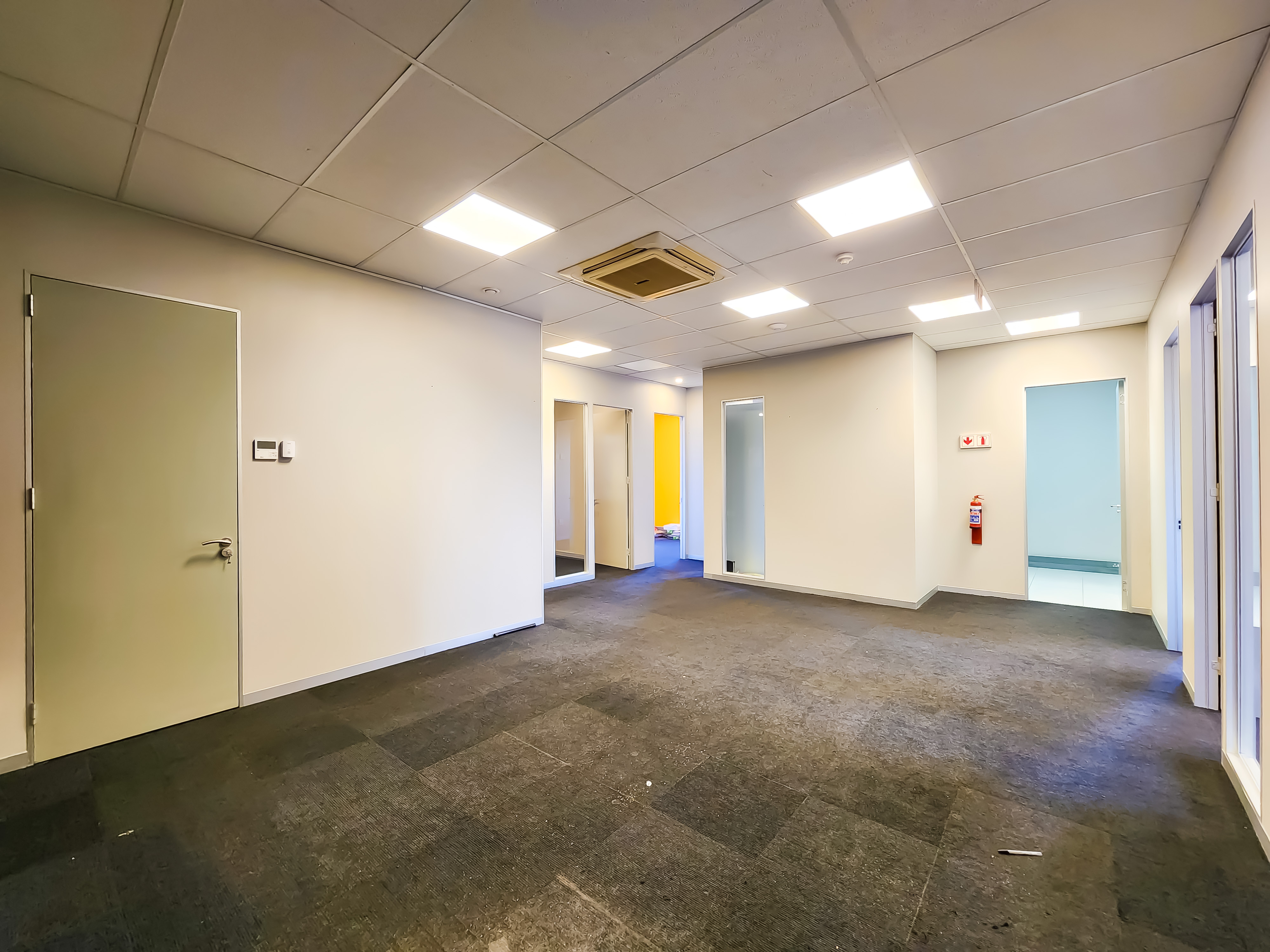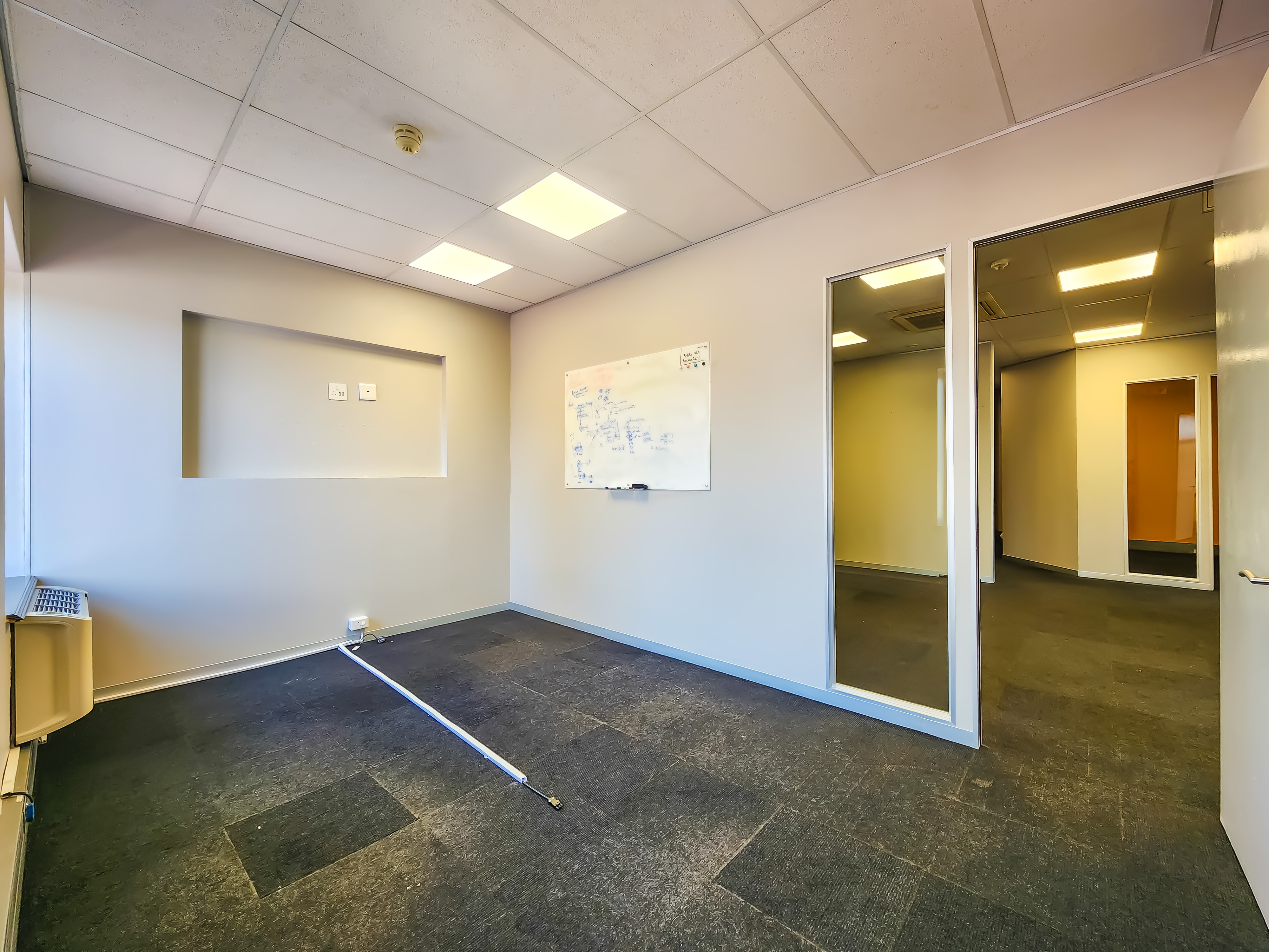 This functional office space available to let in The Pivot offers a sleek and modern design, starting with a welcoming reception area that sets a professional tone. The layout features an open-plan workspace surrounded by three private offices, providing the ideal balance of collaboration and privacy. The office includes a well-appointed meeting room and a spacious kitchen for added convenience. Large windows flood the office space with natural light, creating a bright and inspiring work environment. The office is fully carpeted and air-conditioned throughout, ensuring comfort and functionality.