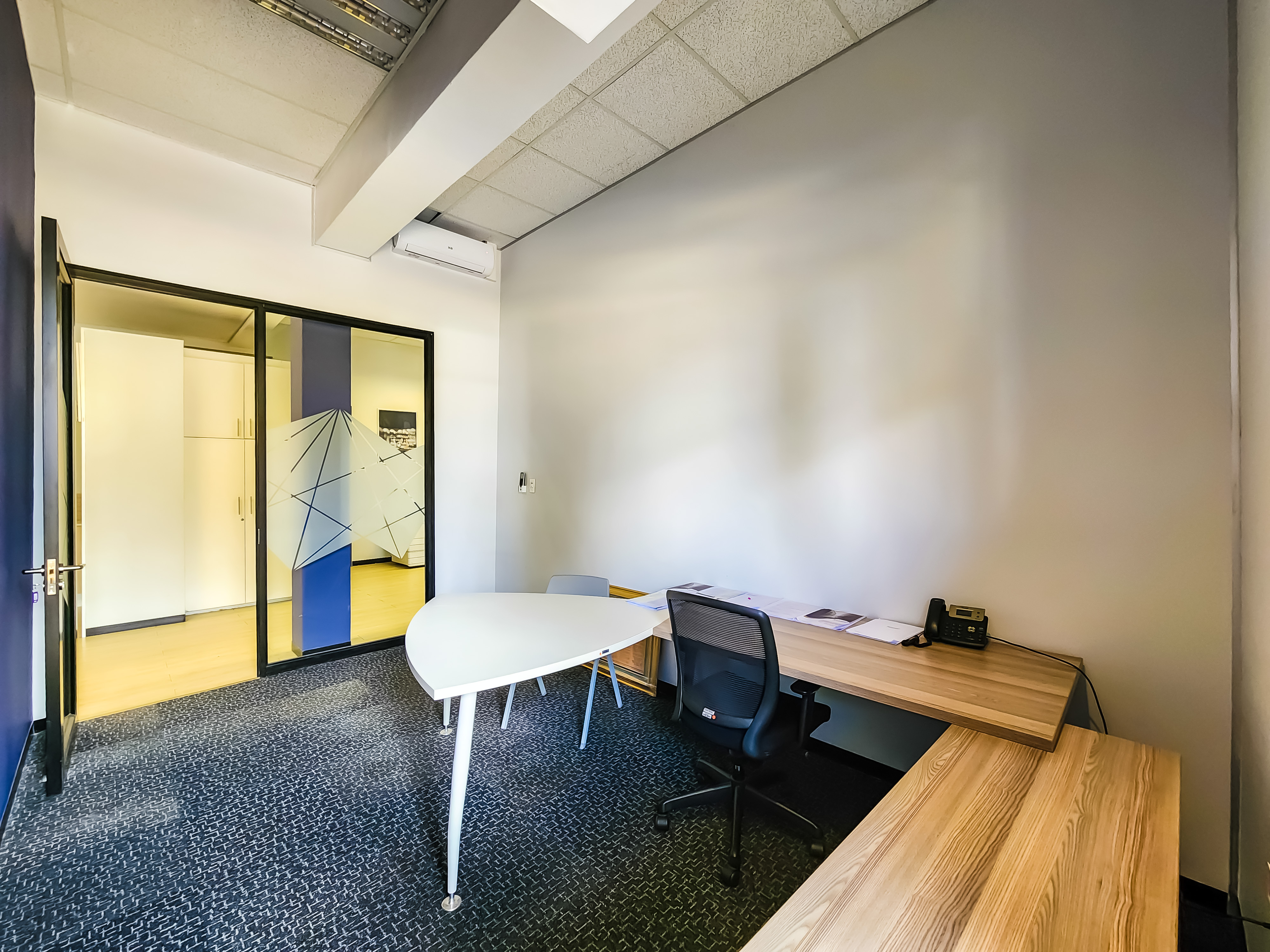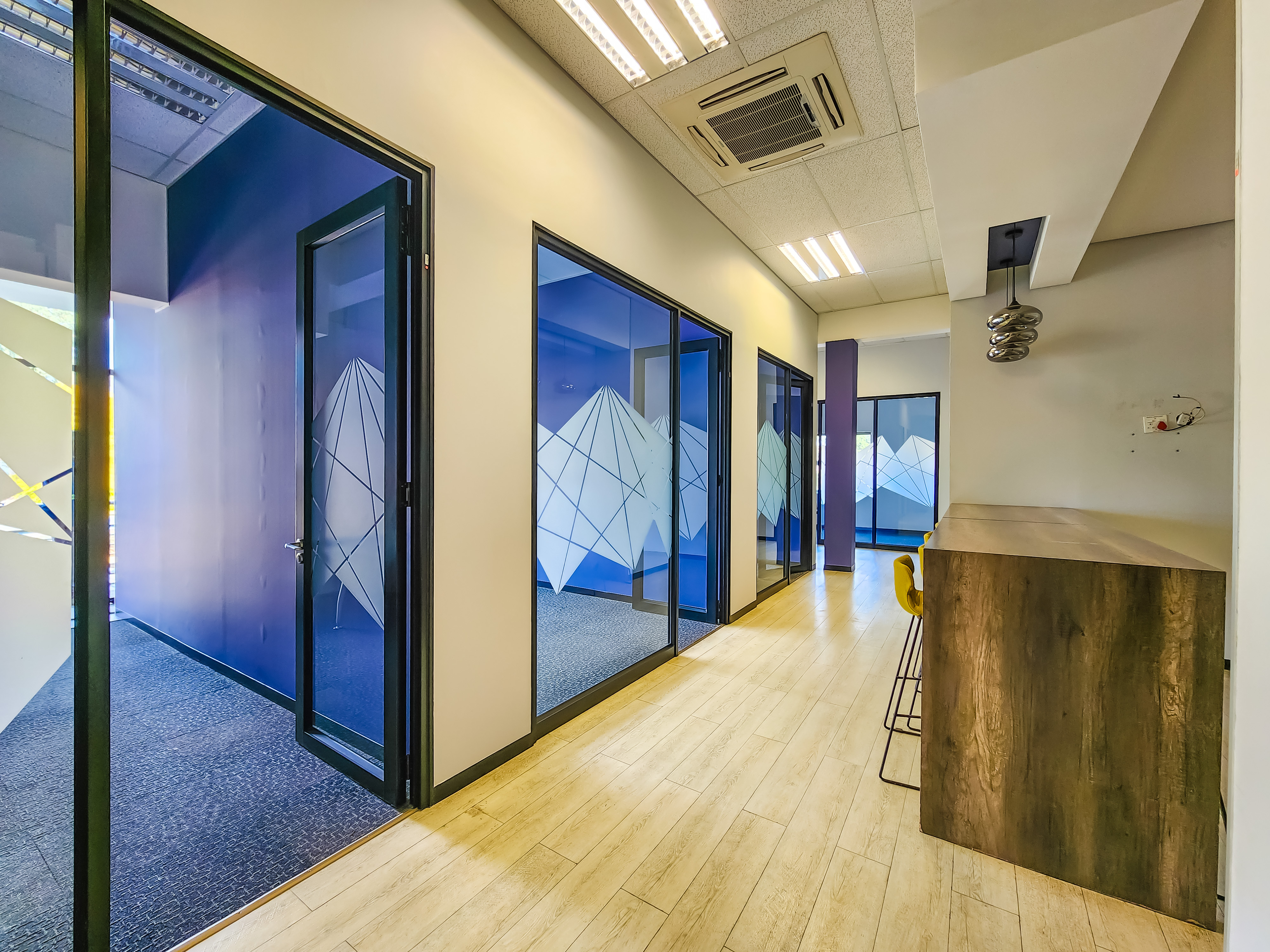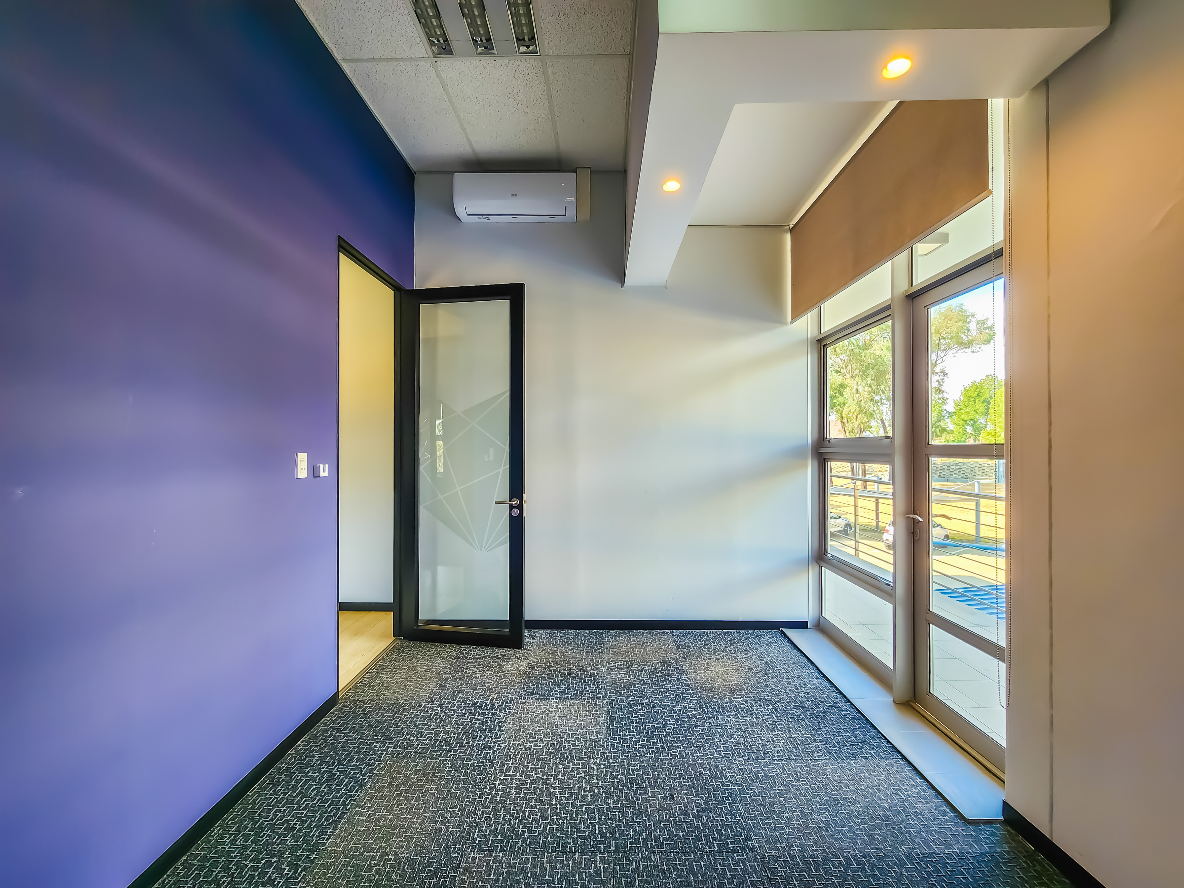This ultra-modern office to let in the prestigious Willow Wood Office Park offers a sleek, contemporary design featuring high-quality vinyl flooring, high-rise ceilings and stylish black aluminum finishes. The office consists of two spacious boardrooms, eight semi-glass-partitioned private offices, a fully fitted open-plan kitchen, and private dedicated ladies and gents restrooms. Several offices and the boardrooms have access to private dedicated balconies. Selected furniture pieces are available and can be included in the monthly rental, offering a turnkey solution for your business.