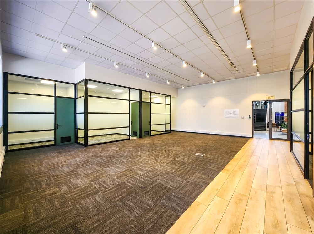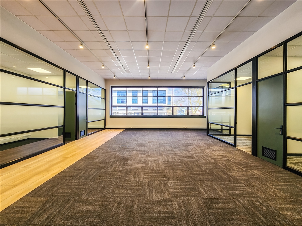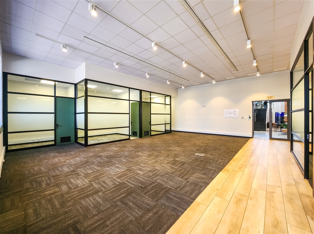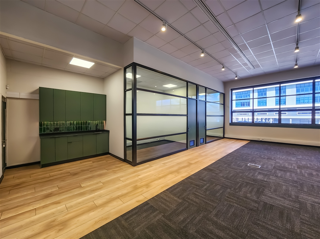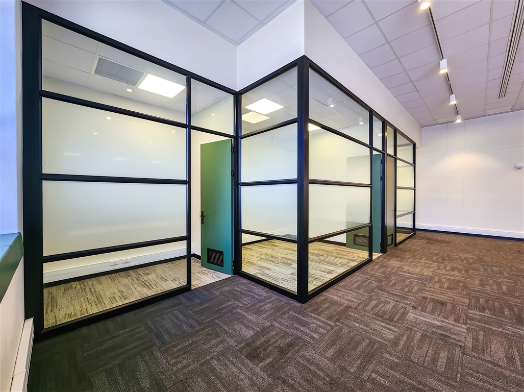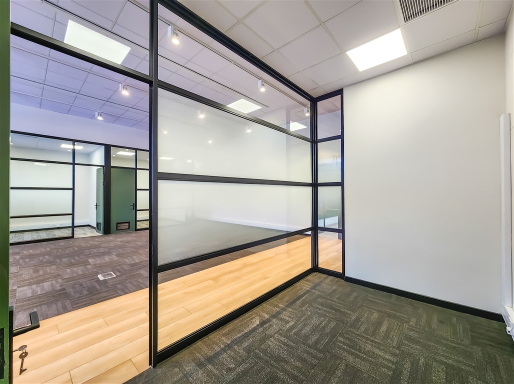 This ultra-modern ground floor office to let in Fourways offers a sophisticated and functional workspace designed for today’s businesses. The building greets visitors with a sleek reception area and comfortable waiting lounge, enhanced by high-end contemporary finishes that set a professional tone from the start. Inside, the office opens into a spacious open-plan workspace, complemented by four glass-enclosed private offices, a dedicated phone booth, a private dedicate kitchen and a convenient storeroom. For meetings, tenants enjoy access to a variety of boardrooms—ranging from a 12-seater with a projector, to an 8-seater, and multiple 4-seater rooms—all available on a booking basis at no additional cost. The interior is carpeted throughout and bathed in natural light, with automated blinds and sleek black aluminium window frames adding a refined modern touch. This is more than just office space—it’s a turnkey solution that blends style, comfort, and practicality in the heart of Fourways.