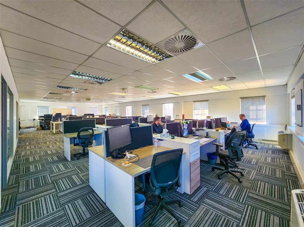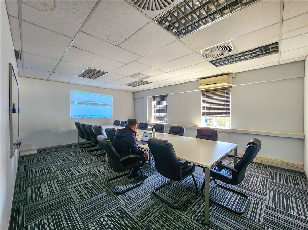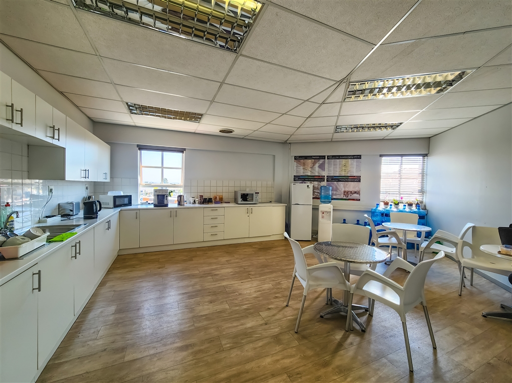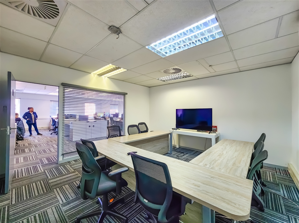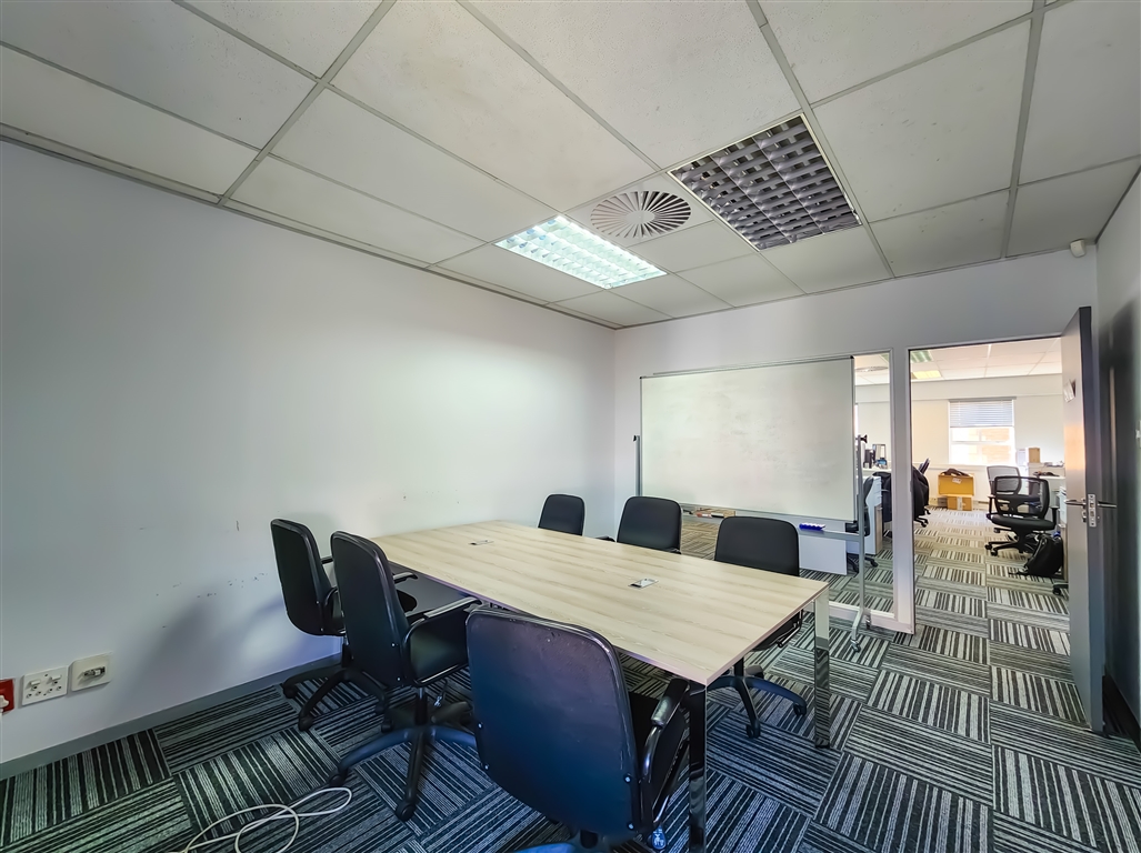 This affordable office to let in Fourways Golf Park offers a modern, functional layout designed for both professionalism and comfort. The office space opens with a stylish reception area, providing direct access to a generously sized storeroom. A passage leads you to a spacious kitchen with room for seating, a contemporary boardroom, and several private offices. Toward the rear, the layout transitions into an open-plan office complemented by four additional private offices overlooking the shared workspace. Featuring a combination of carpet and vinyl flooring, the premises are fully air-conditioned and filled with natural light, creating an inviting and productive working environment.