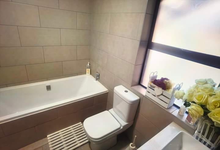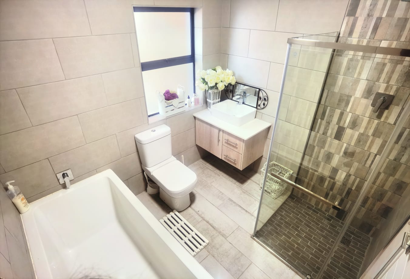 The modern kitchen is a chef’s dream, featuring a sleek gas hob set into a seamless Caesarstone countertop, perfectly positioned to face the open-plan living area. A separate scullery, abundant with built-in cupboards, provides a practical space that connects effortlessly to the double garage, ensuring ease and convenience. Close to the entrance another bathroom is located.