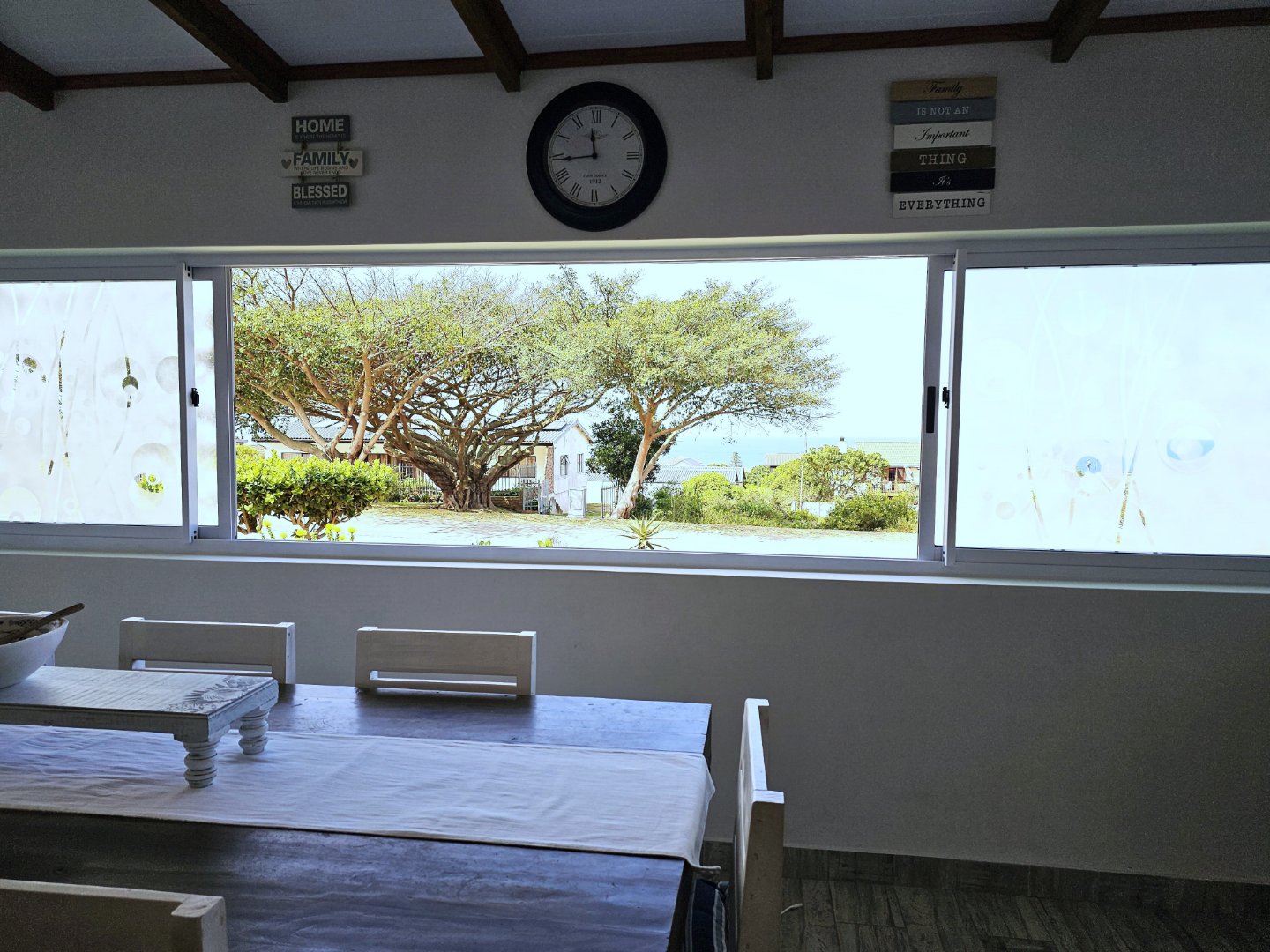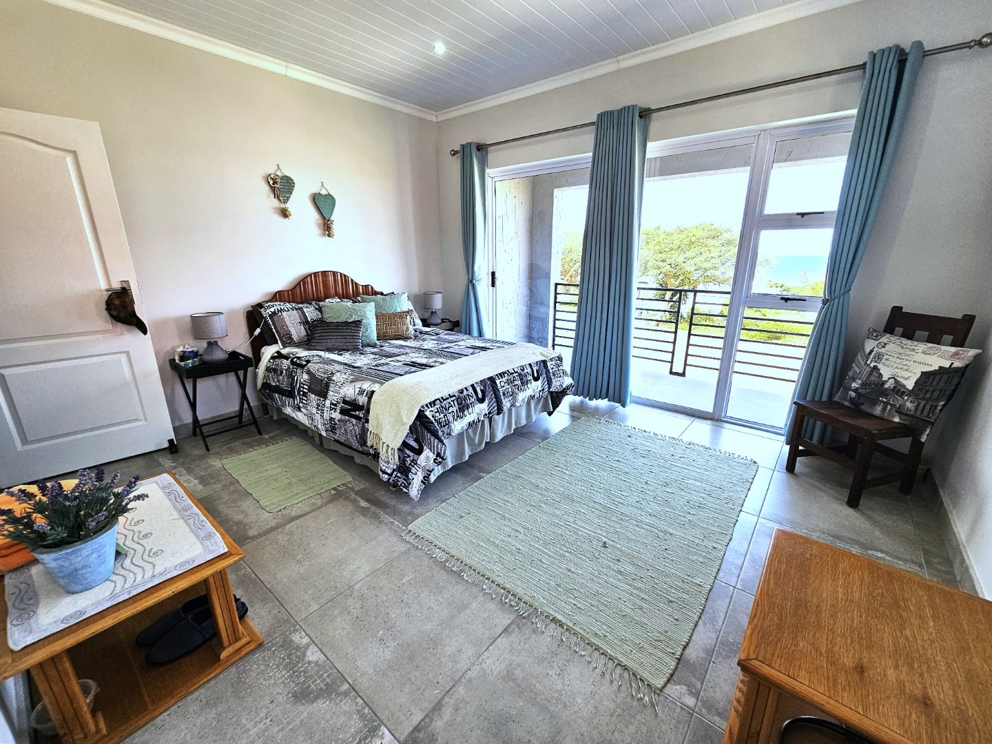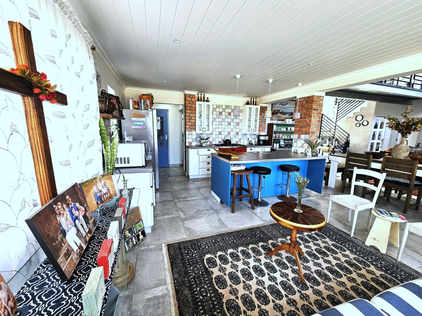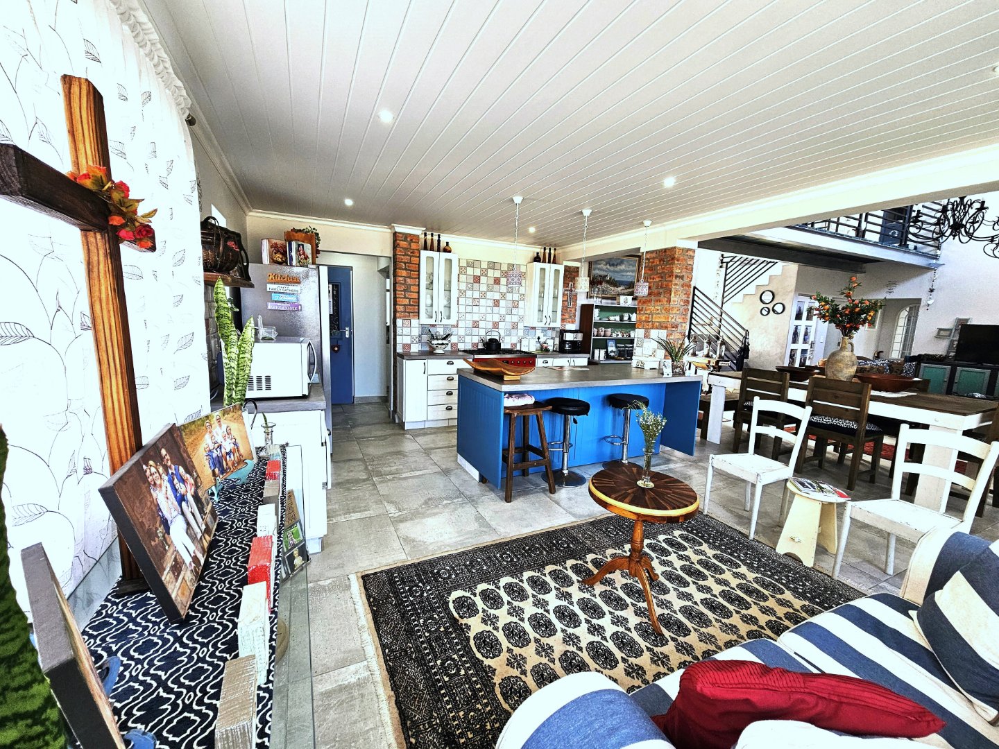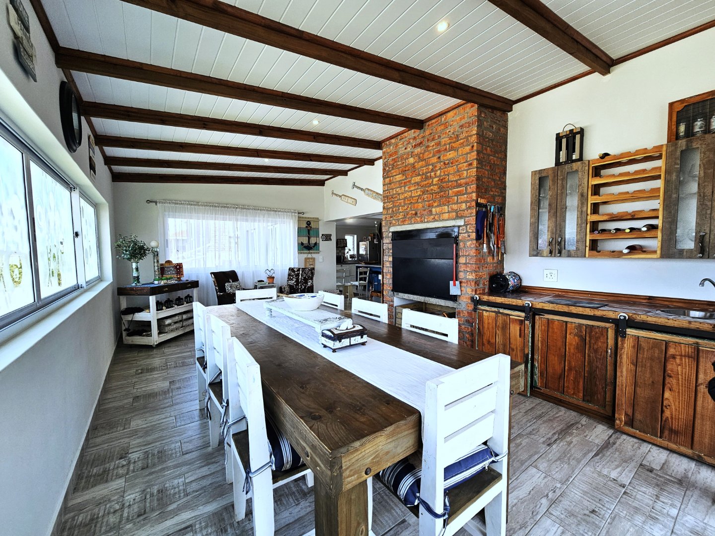 Flowing seamlessly from the living area is the entertainment zone, featuring a built-in braai and sliding stained-glass windows that perfectly frame the panoramic sea views — the ideal setting for relaxed evenings or vibrant gatherings.