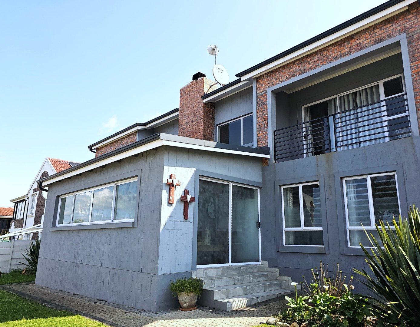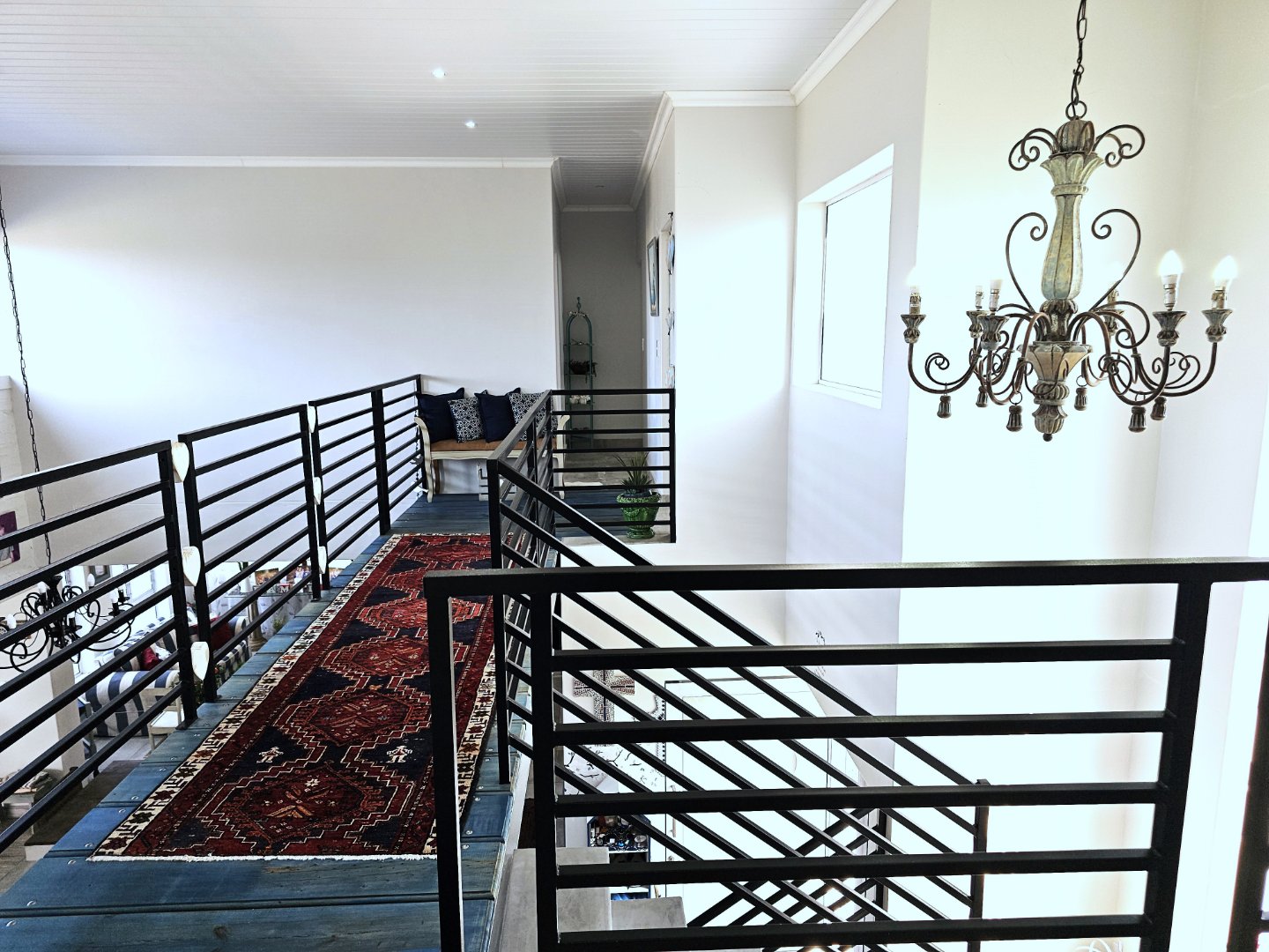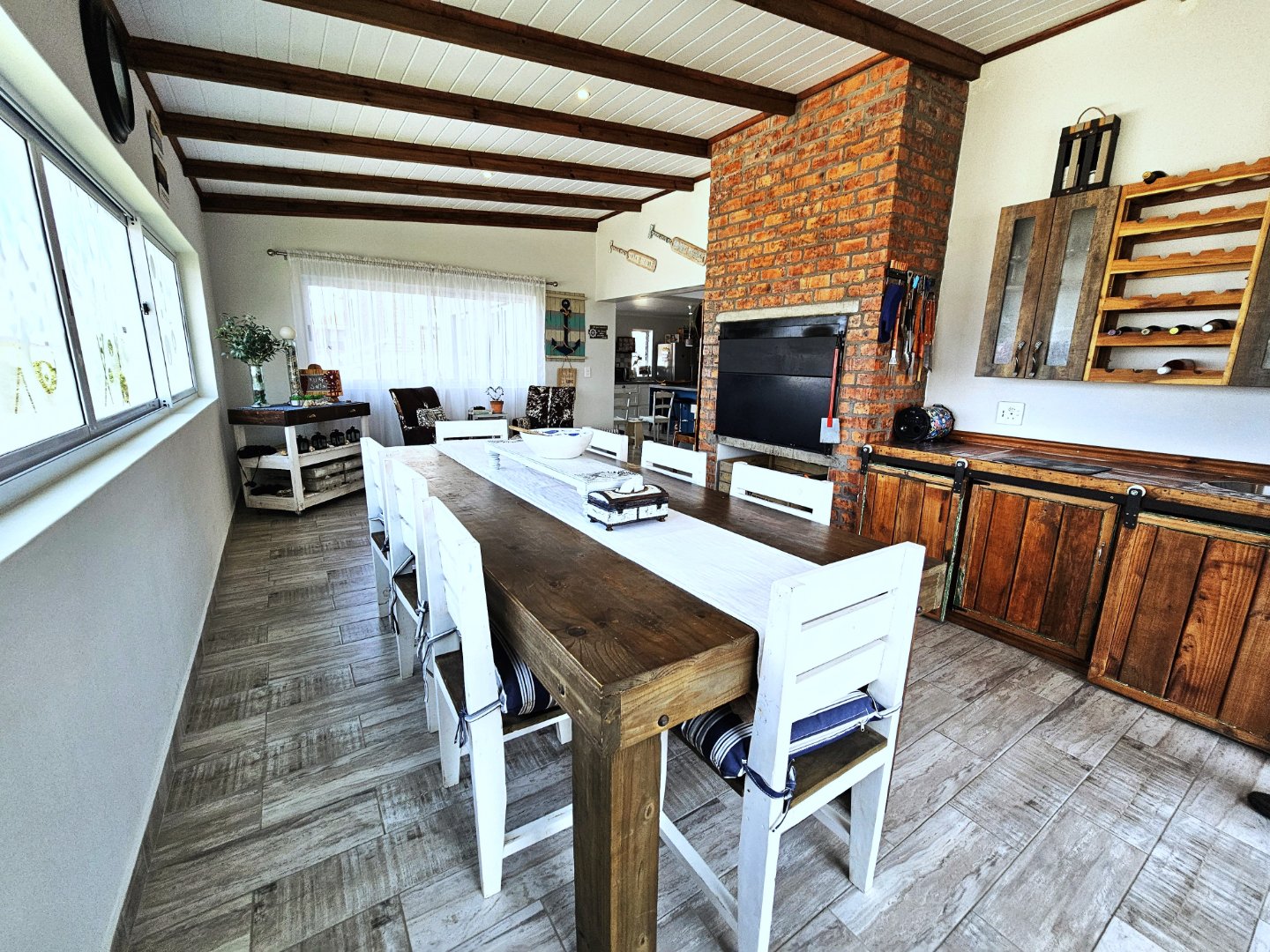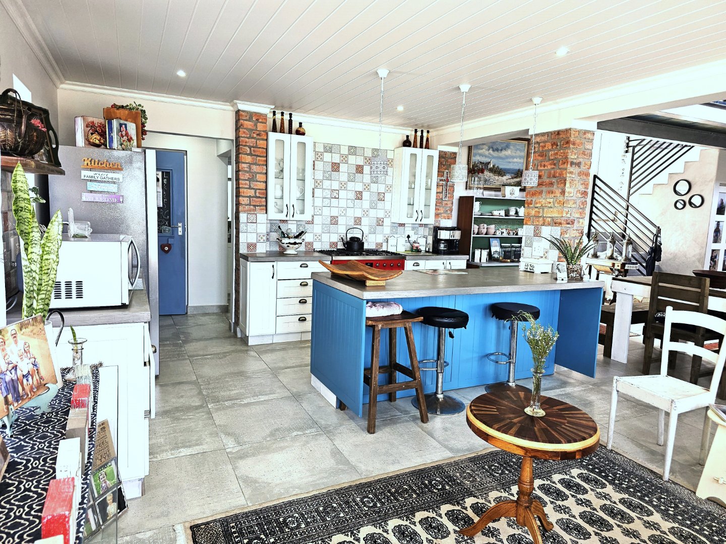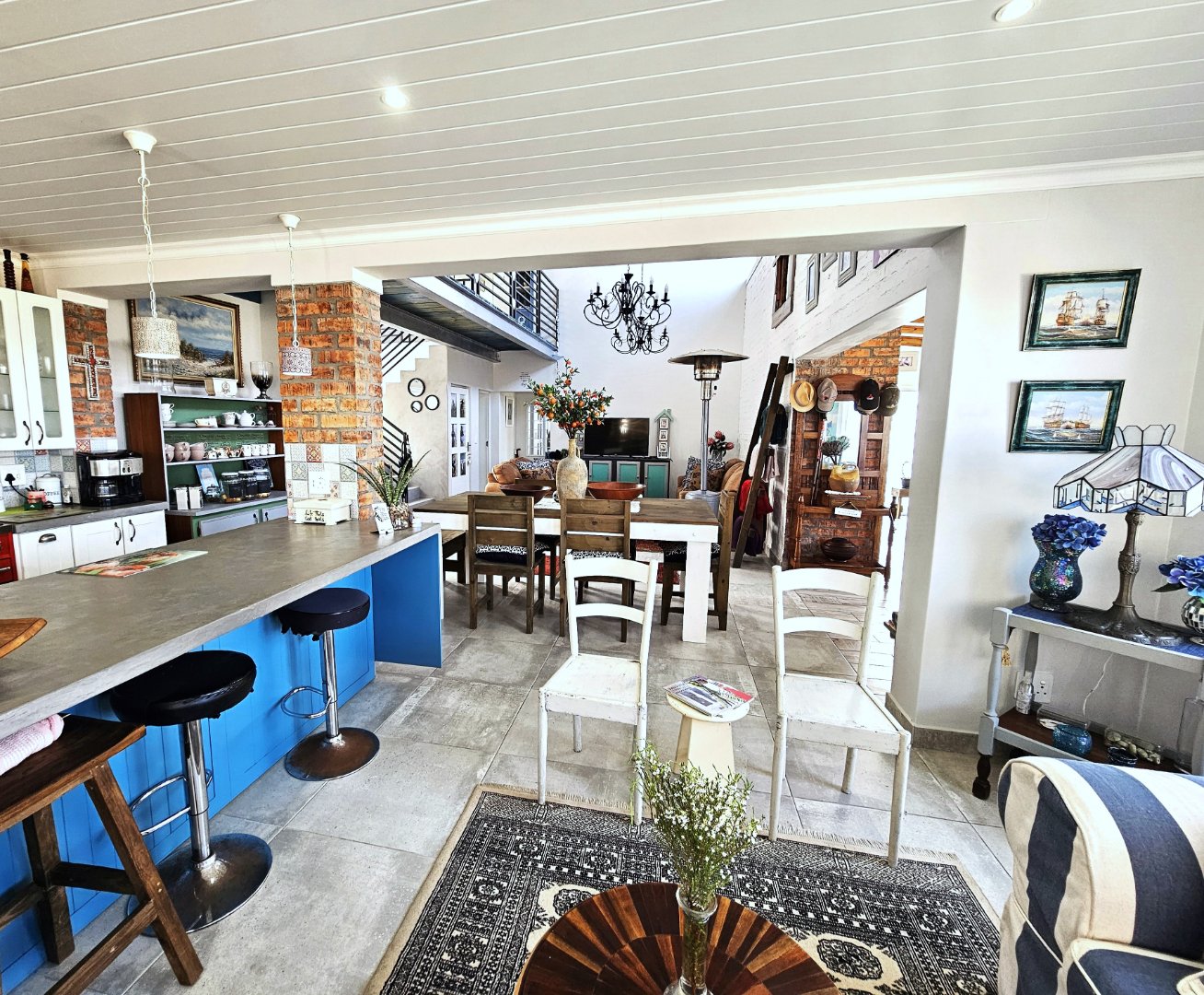 Flowing seamlessly from the living area is the entertainment zone, featuring a built-in braai and sliding stained-glass windows that perfectly frame the panoramic sea views — the ideal setting for relaxed evenings or vibrant gatherings.