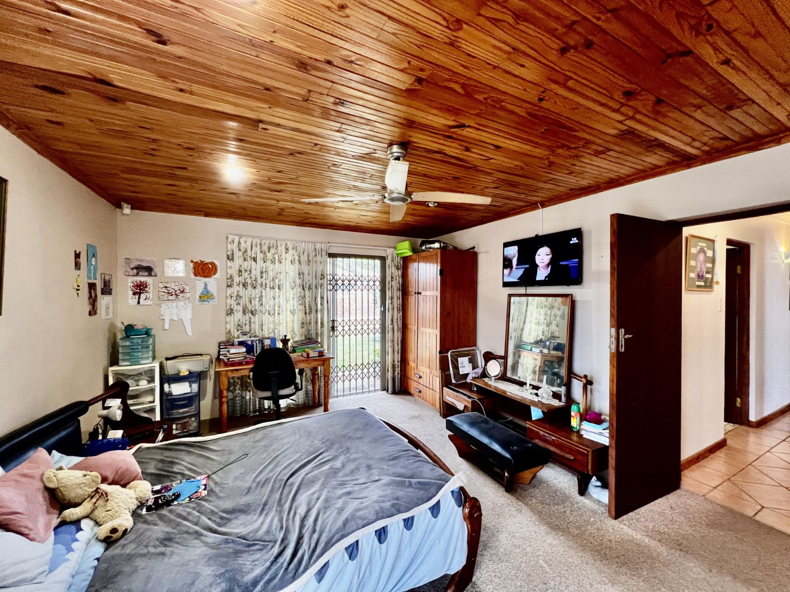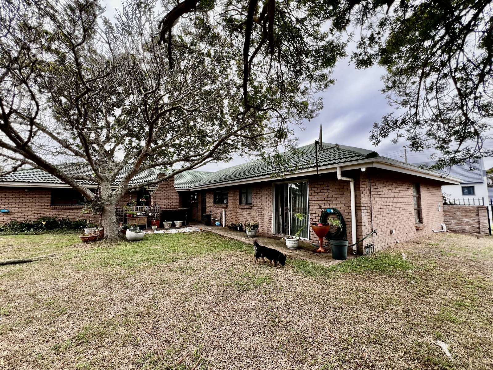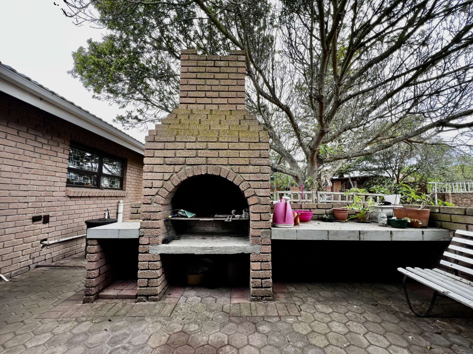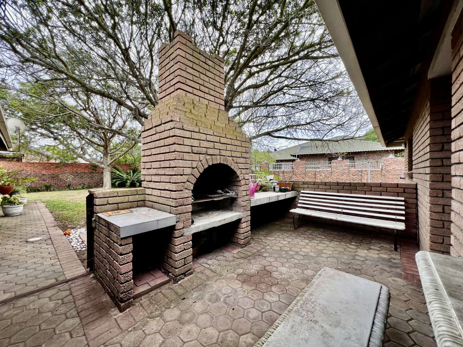 Outside, you’ll find a large, shaded backyard with a beautiful mature tree, a brick braai area with built-in seating, and a neat front garden with established trees — ideal for relaxed outdoor living.