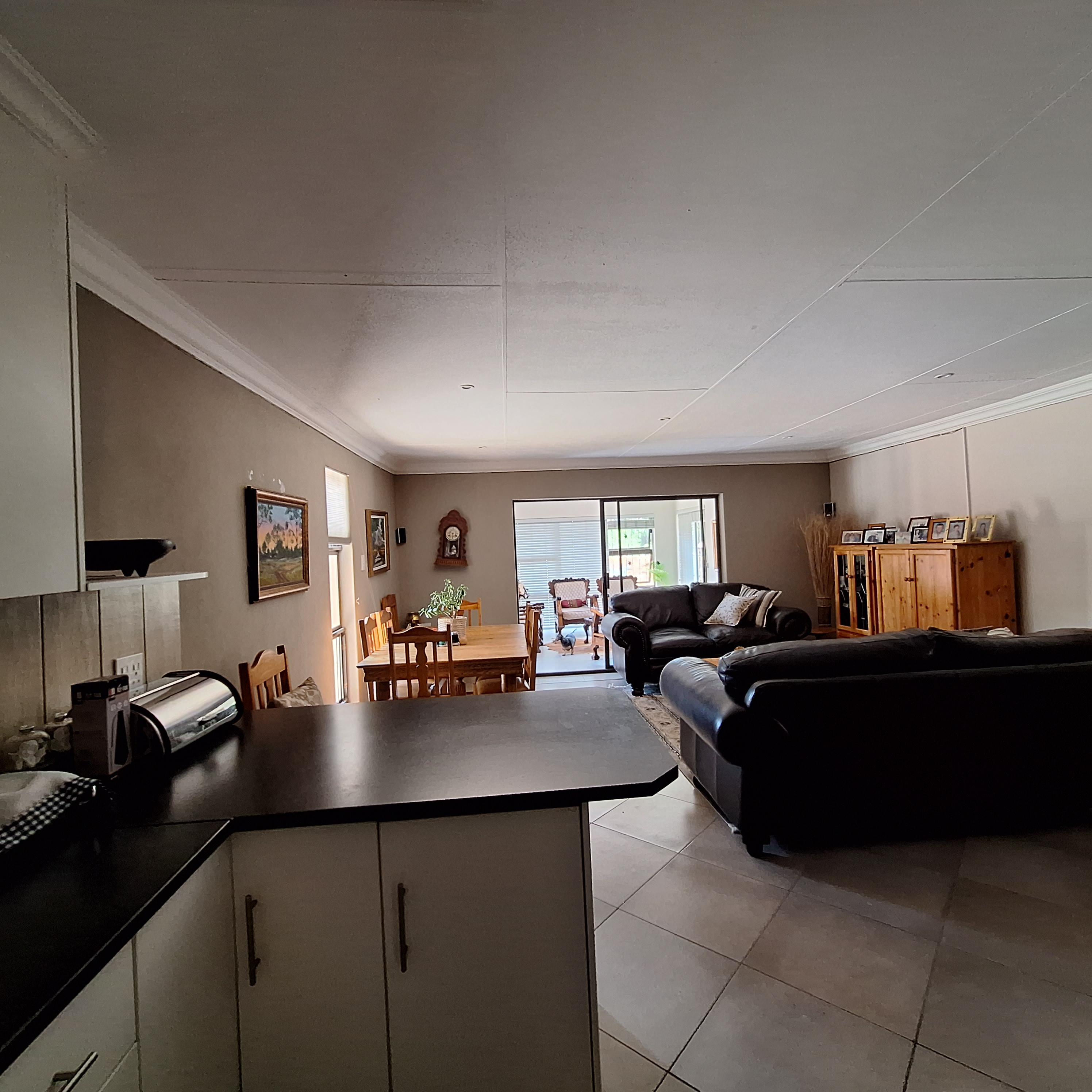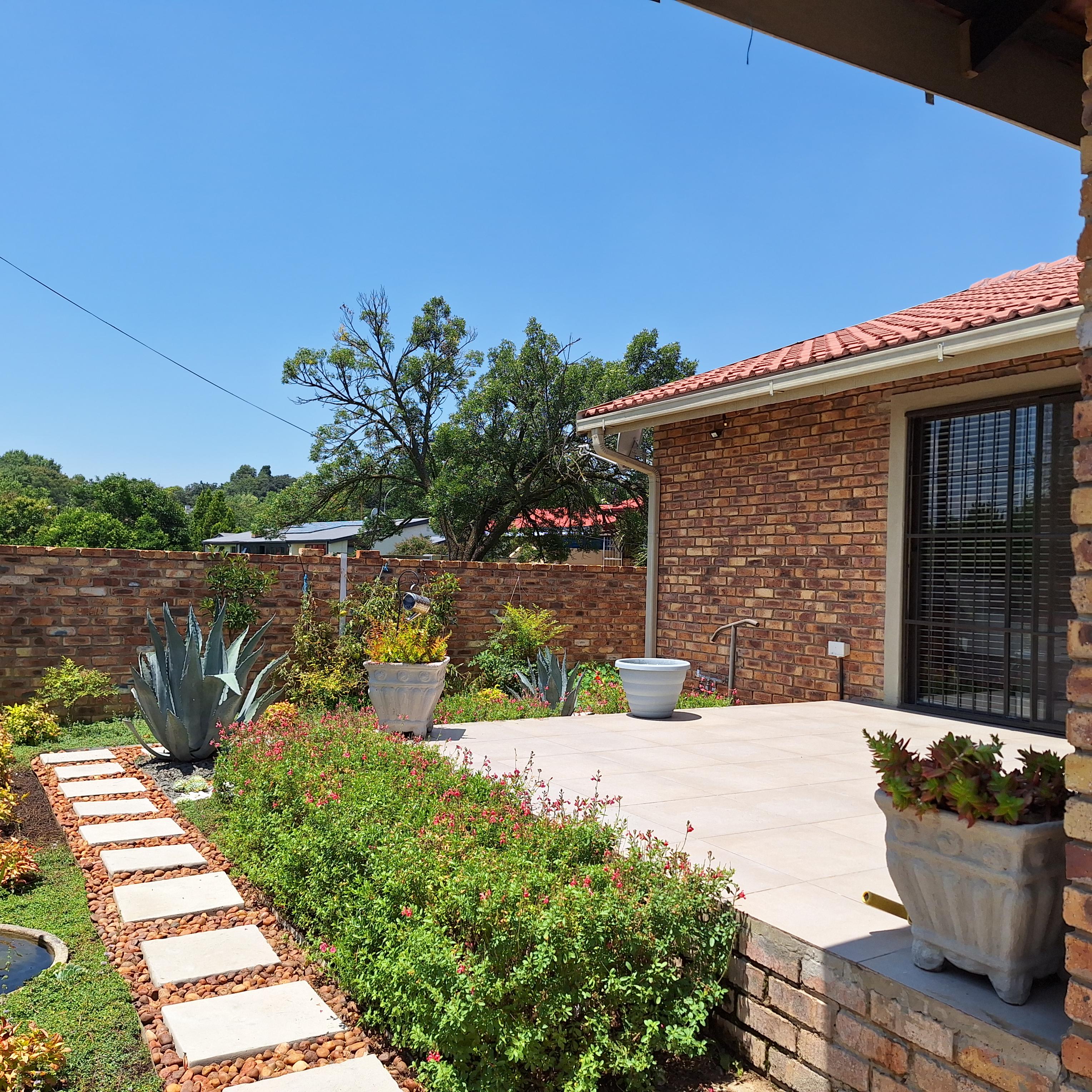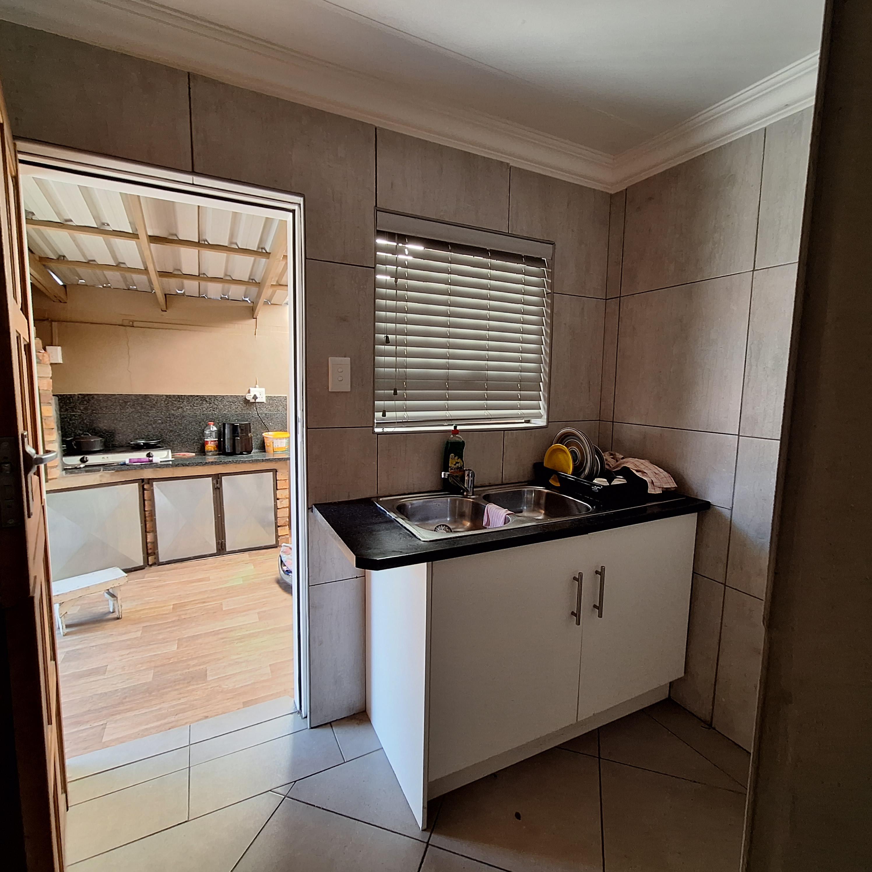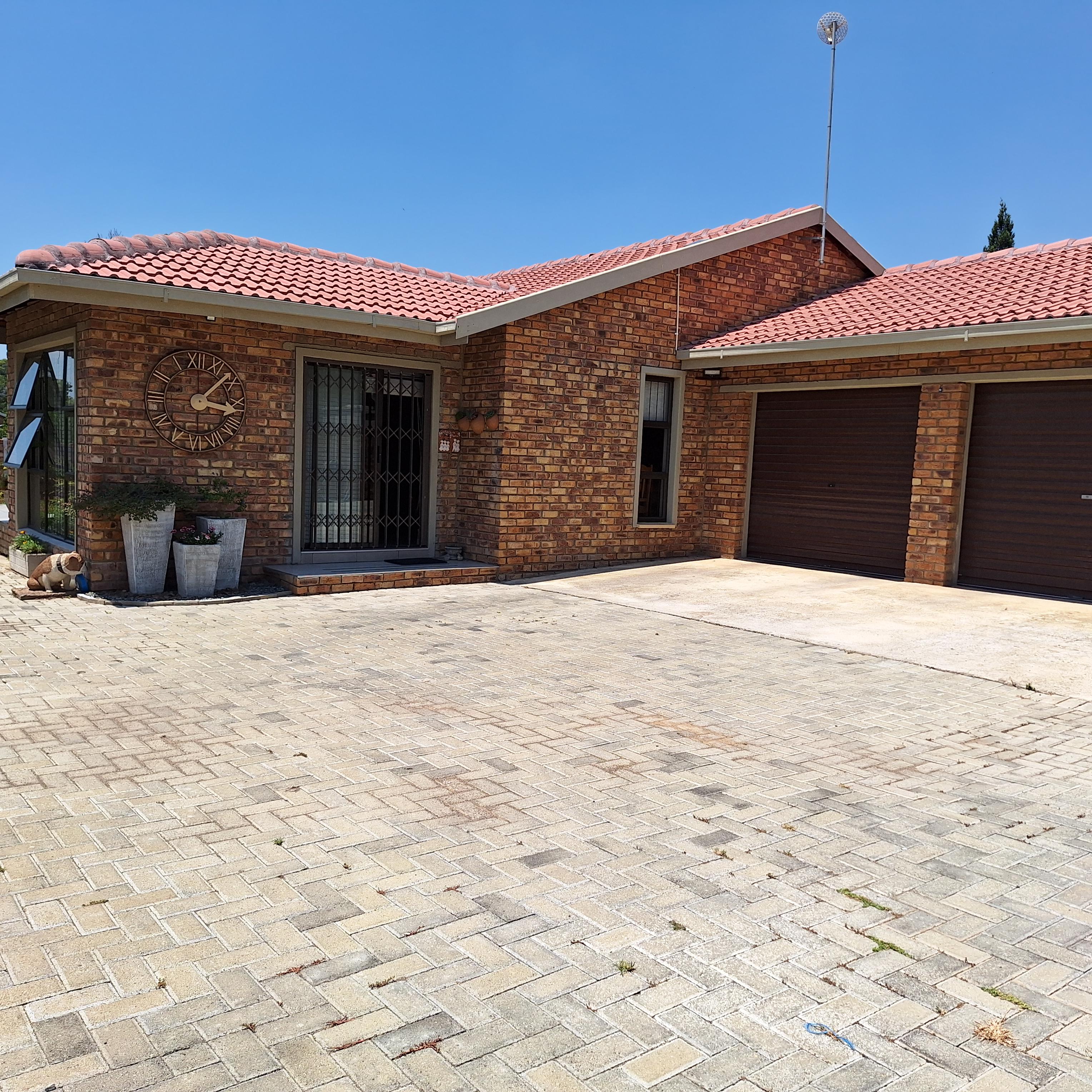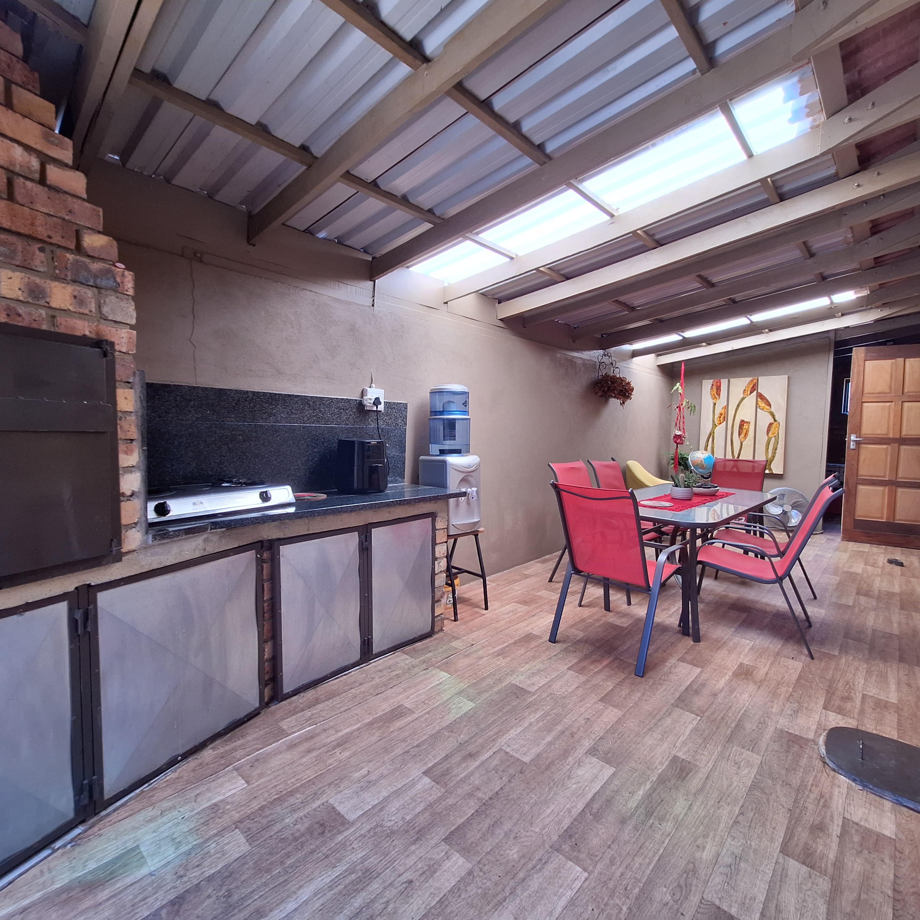 A separate laundry/scullery area leads to the enclosed braai (barbecue) area, offering convenience for outdoor entertaining. The entertainment area includes a fitted braai and opens to the rear, granting access to the double garage.