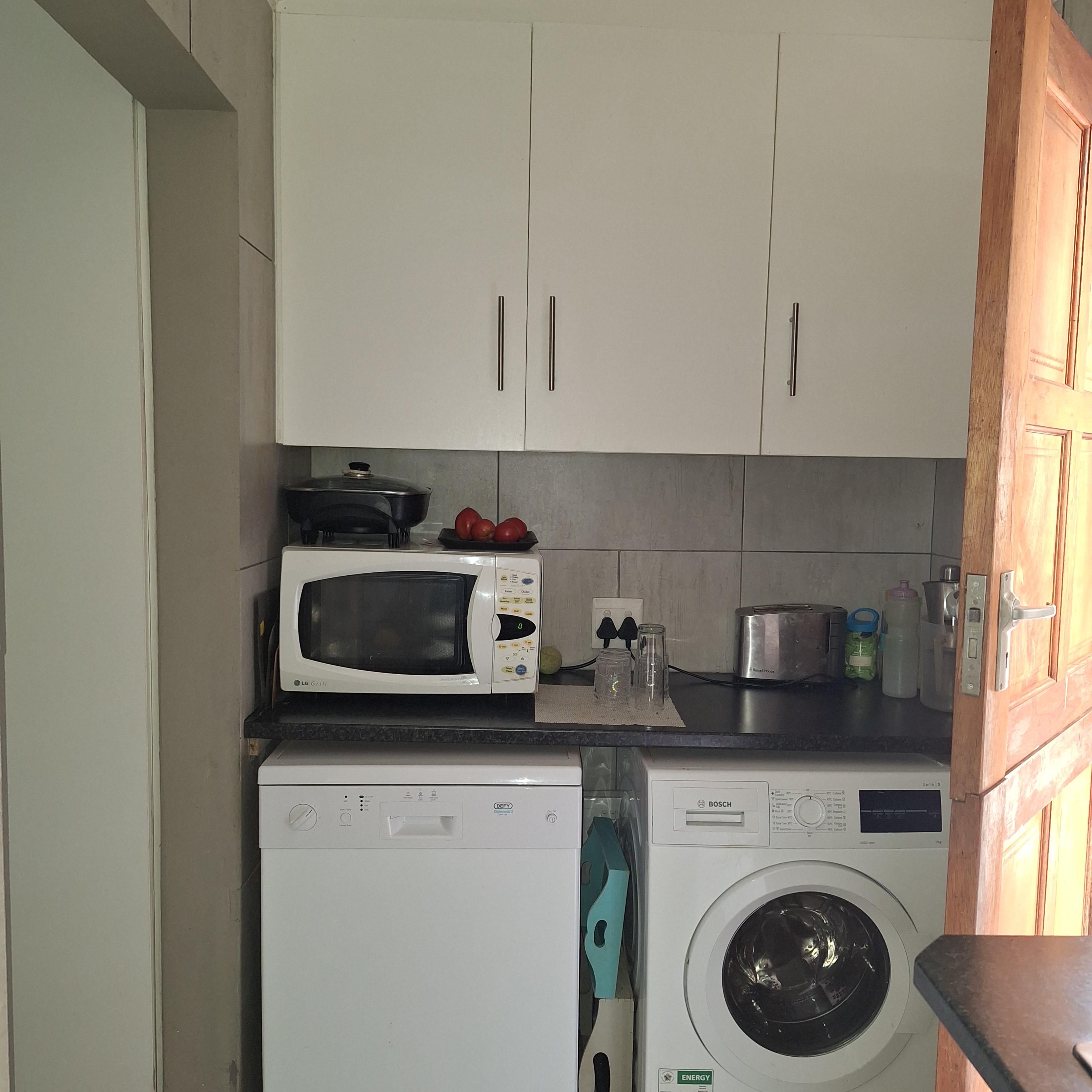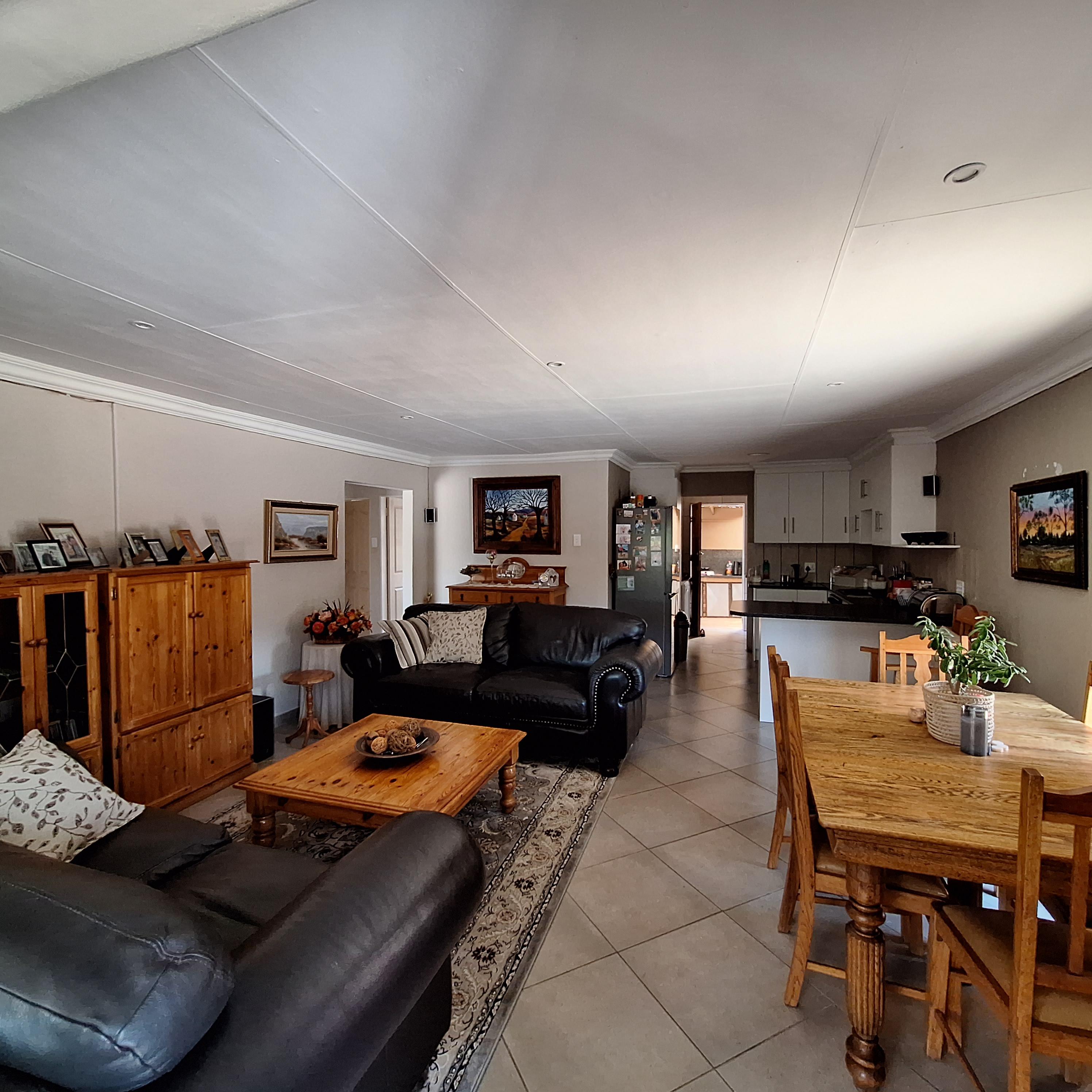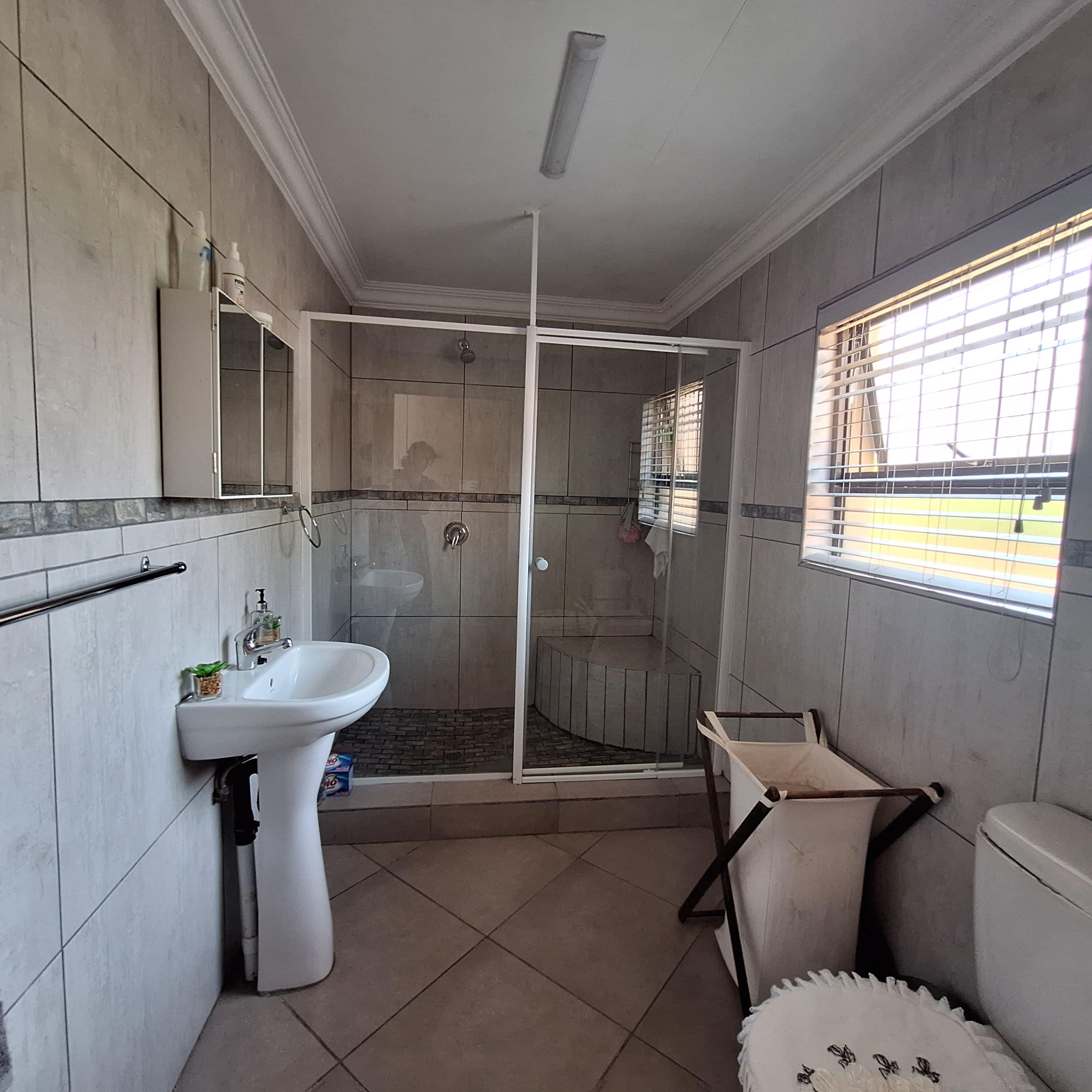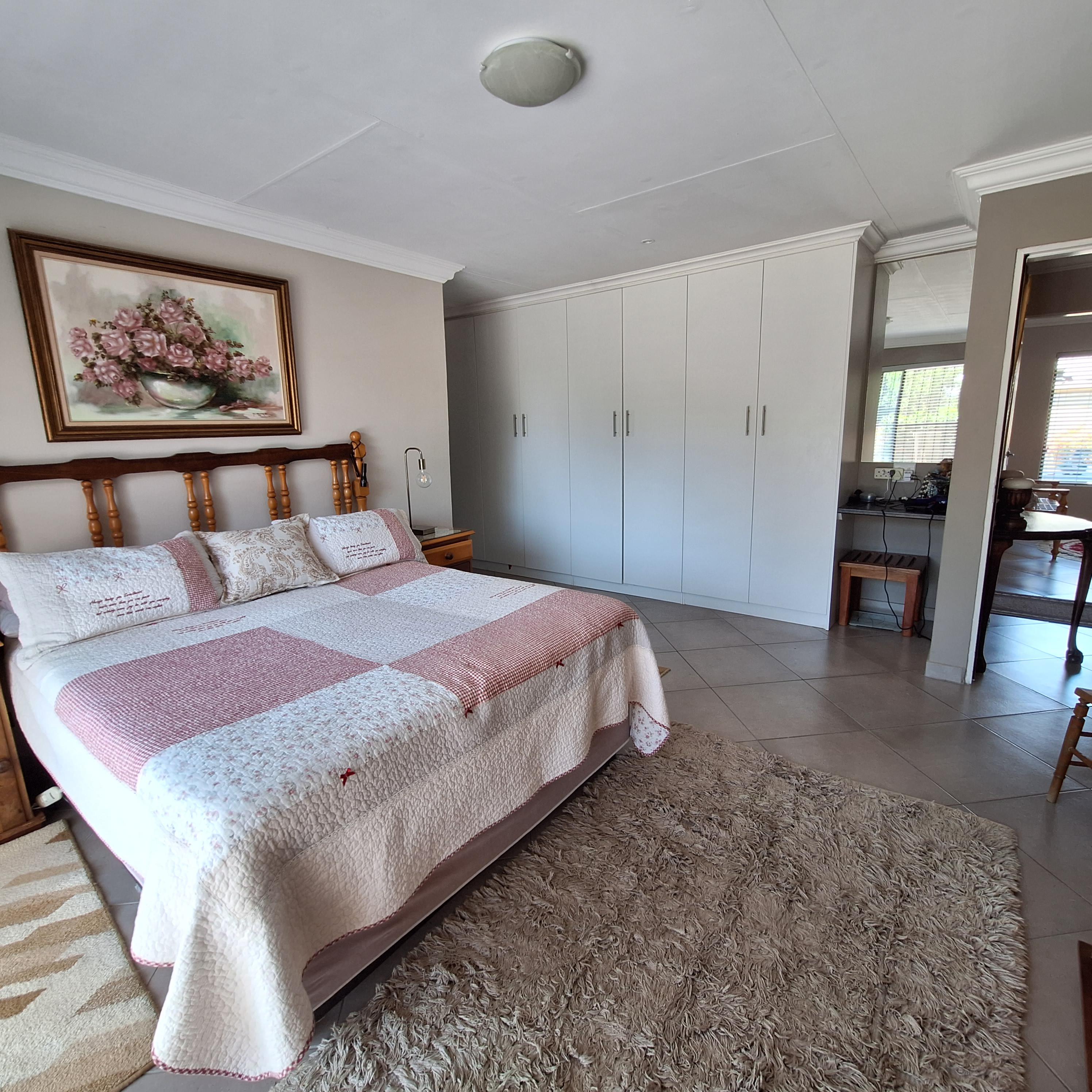 A separate laundry/scullery area leads to the enclosed braai (barbecue) area, offering convenience for outdoor entertaining. The entertainment area includes a fitted braai and opens to the rear, granting access to the double garage.