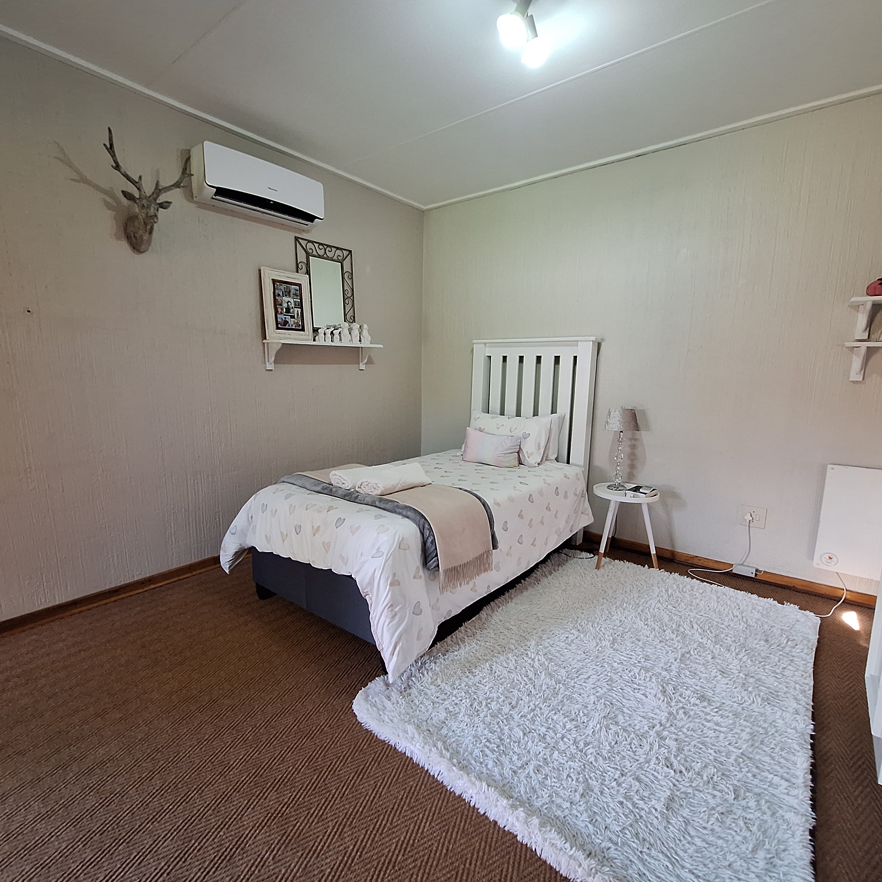 The property features a double garage with an adjoining storeroom. A guest bedroom and bathroom are thoughtfully positioned on one side of the home, ensuring privacy for visitors.