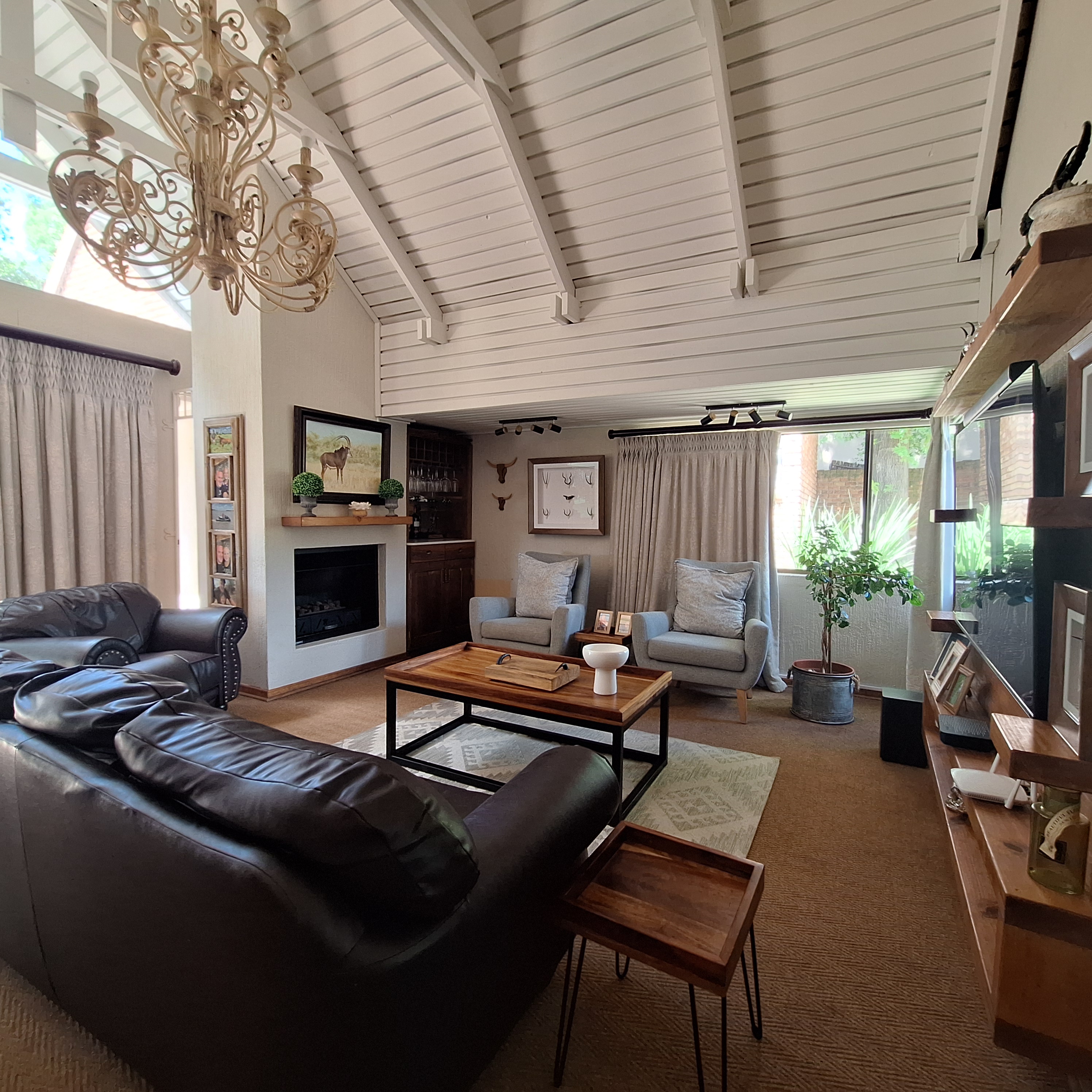 The main living areas include two generous living rooms, a dining room and an entertainment room that opens seamlessly onto a protected outdoor braai area—ideal for year-round entertaining. The family living room is adjacent to the open-plan kitchen and dining area and also opens directly onto the braai area, creating an effortless indoor-outdoor flow.