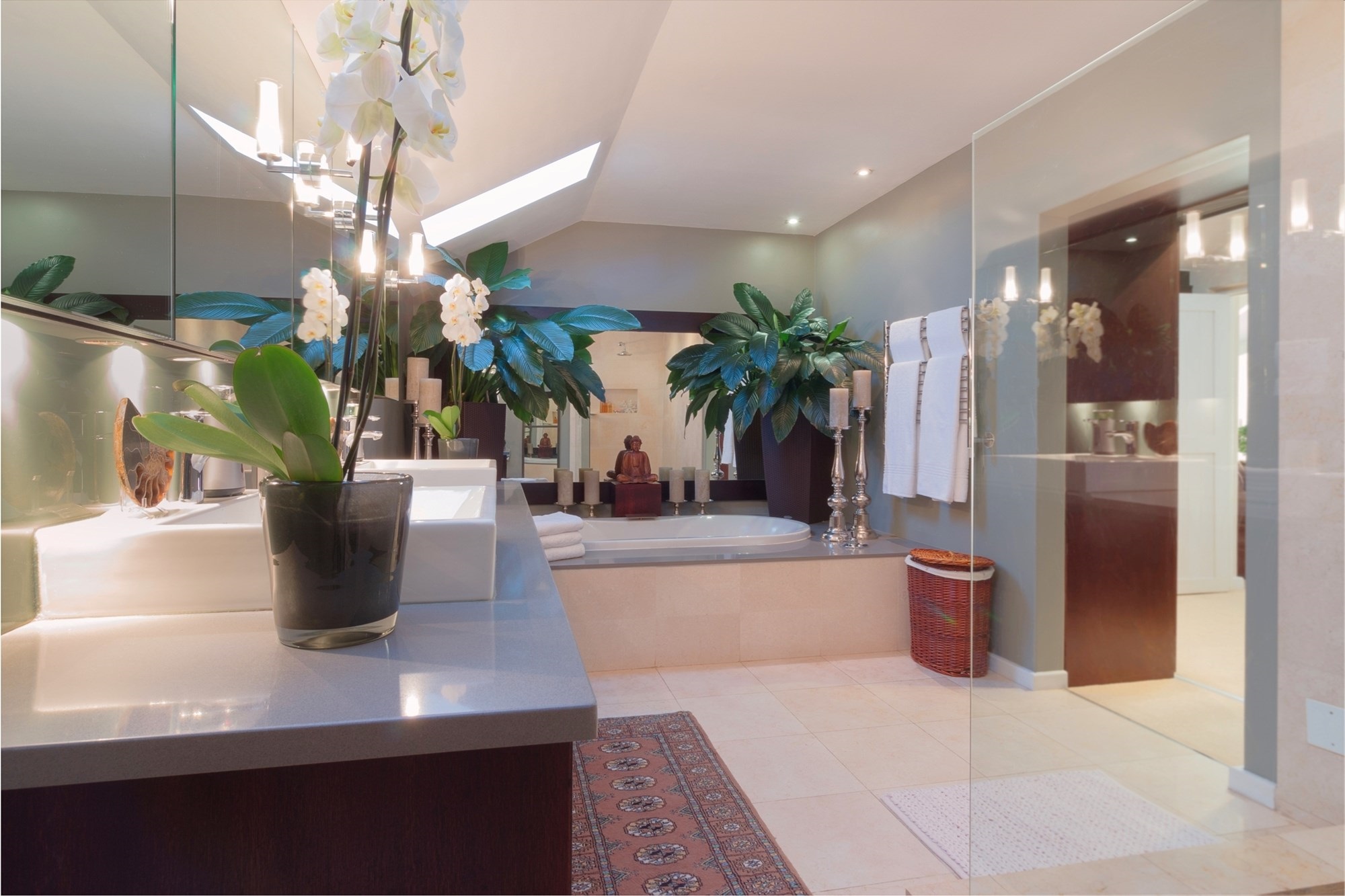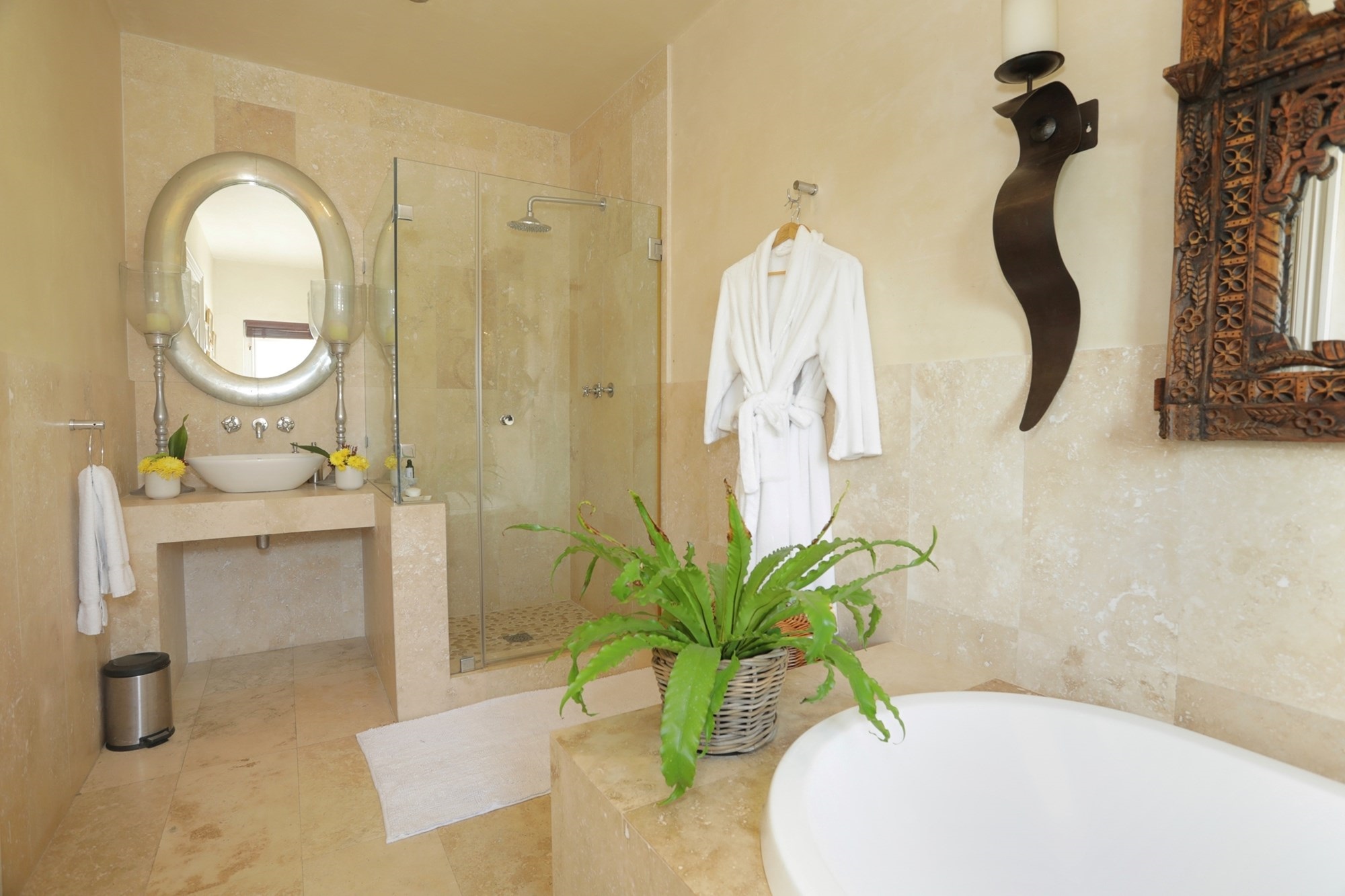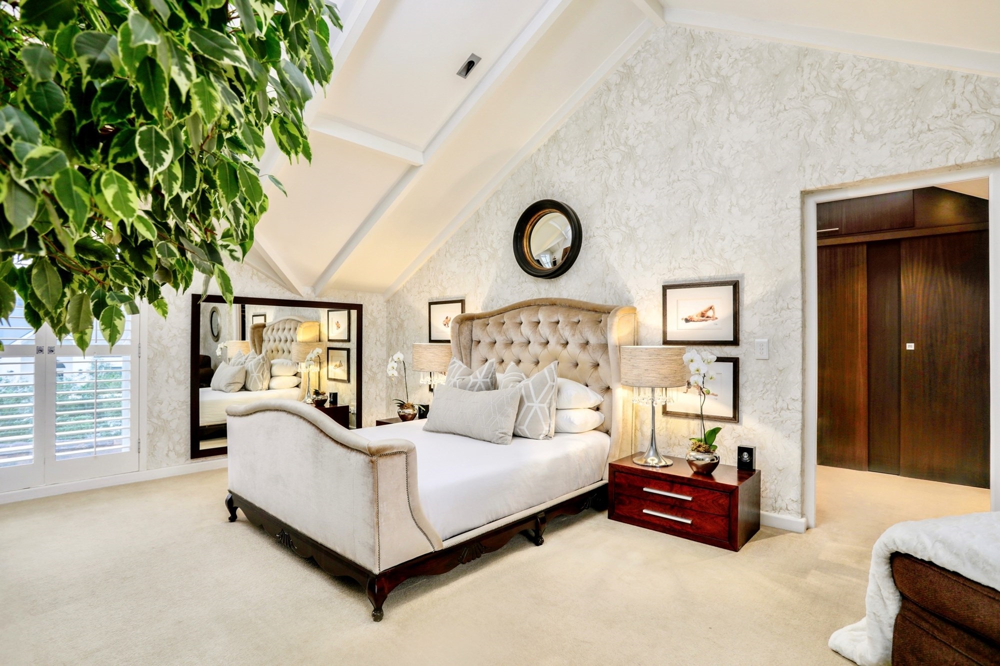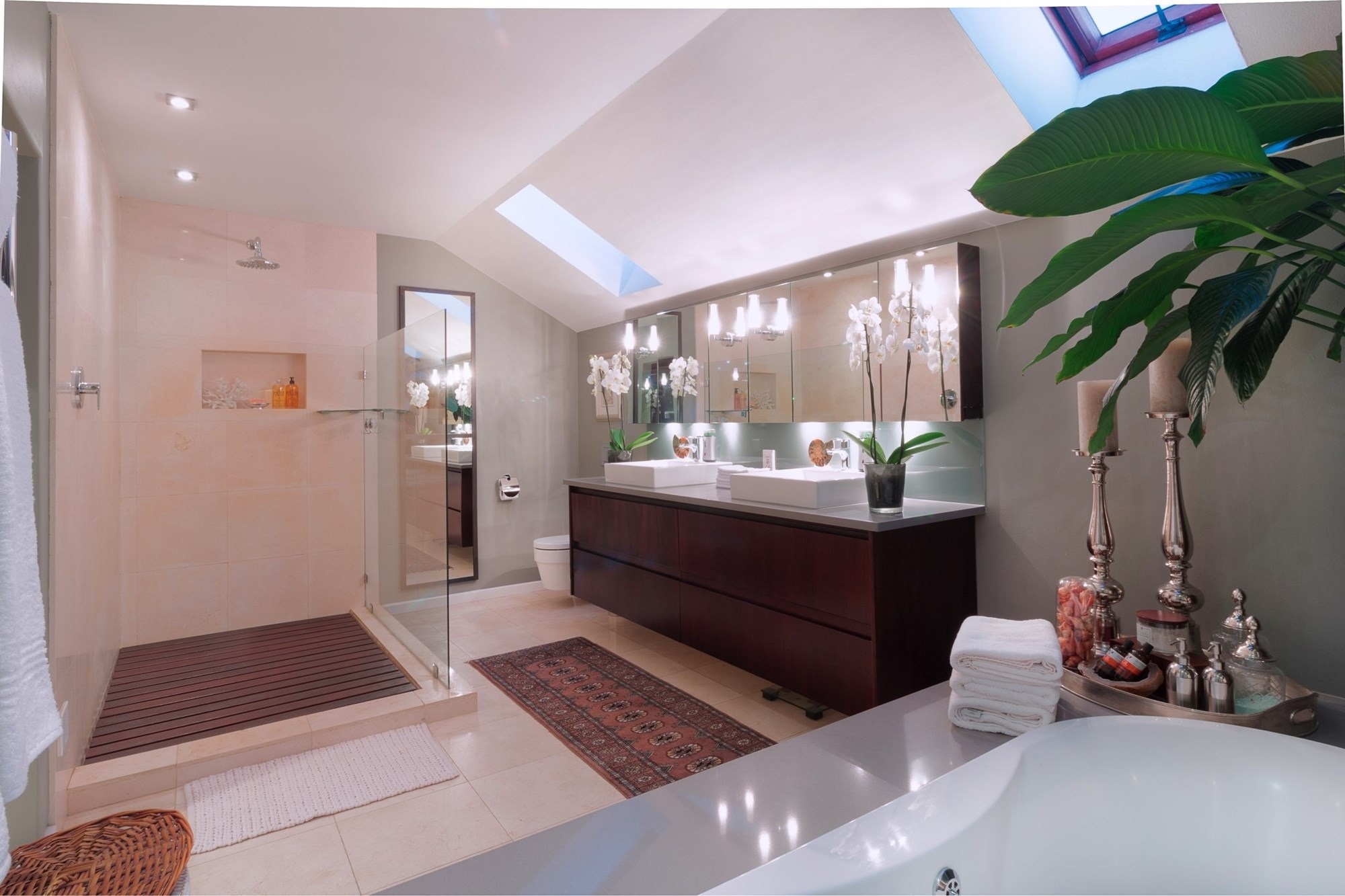 Upstairs, the main suite is a luxurious sanctuary, offering a generous bedroom, a full en-suite bathroom with double vanity, a walk-in dressing room, and a large private balcony with uninterrupted vineyard and mountain views.