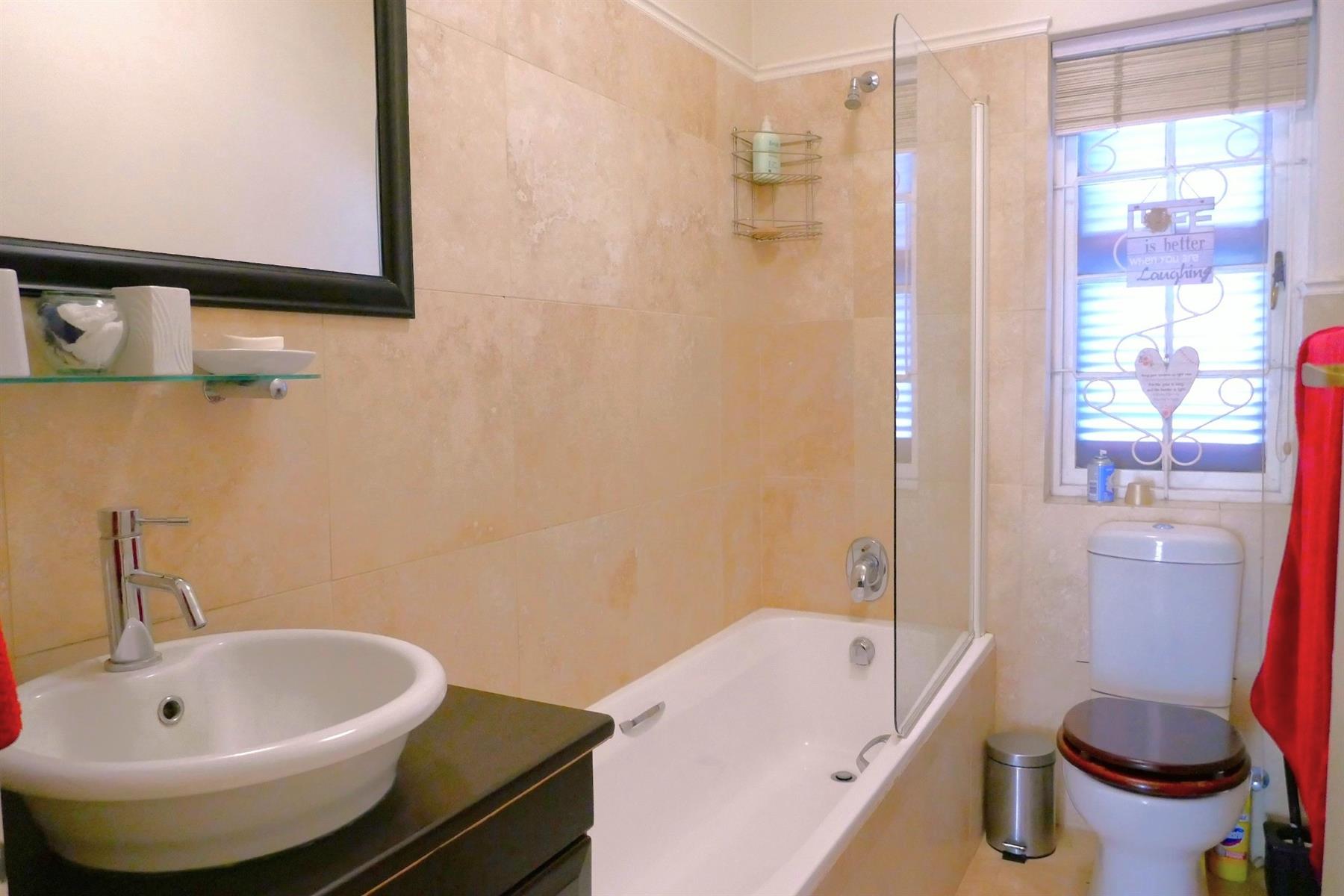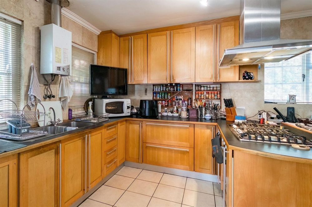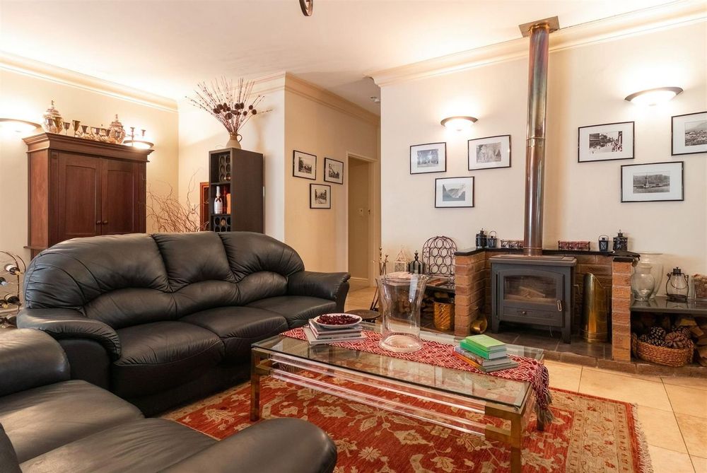 Further highlights include solid wooden built-in cupboards in the kitchen and master bedroom, a wood-burning stove in the lounge, and air-conditioning in all bedrooms and the study. Practical additions such as a double garage with an adjoining workshop, basement storage, and a fully enclosed garden as well as a fitted alarm system ensure both security and convenience.