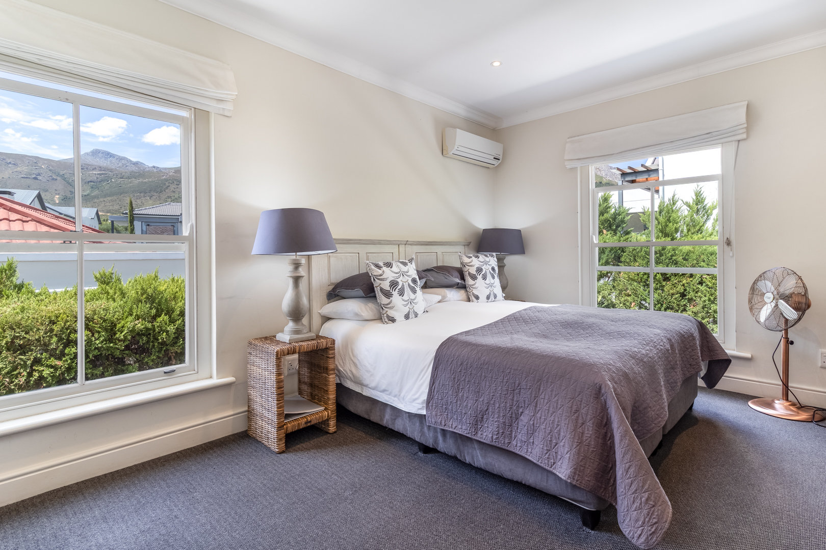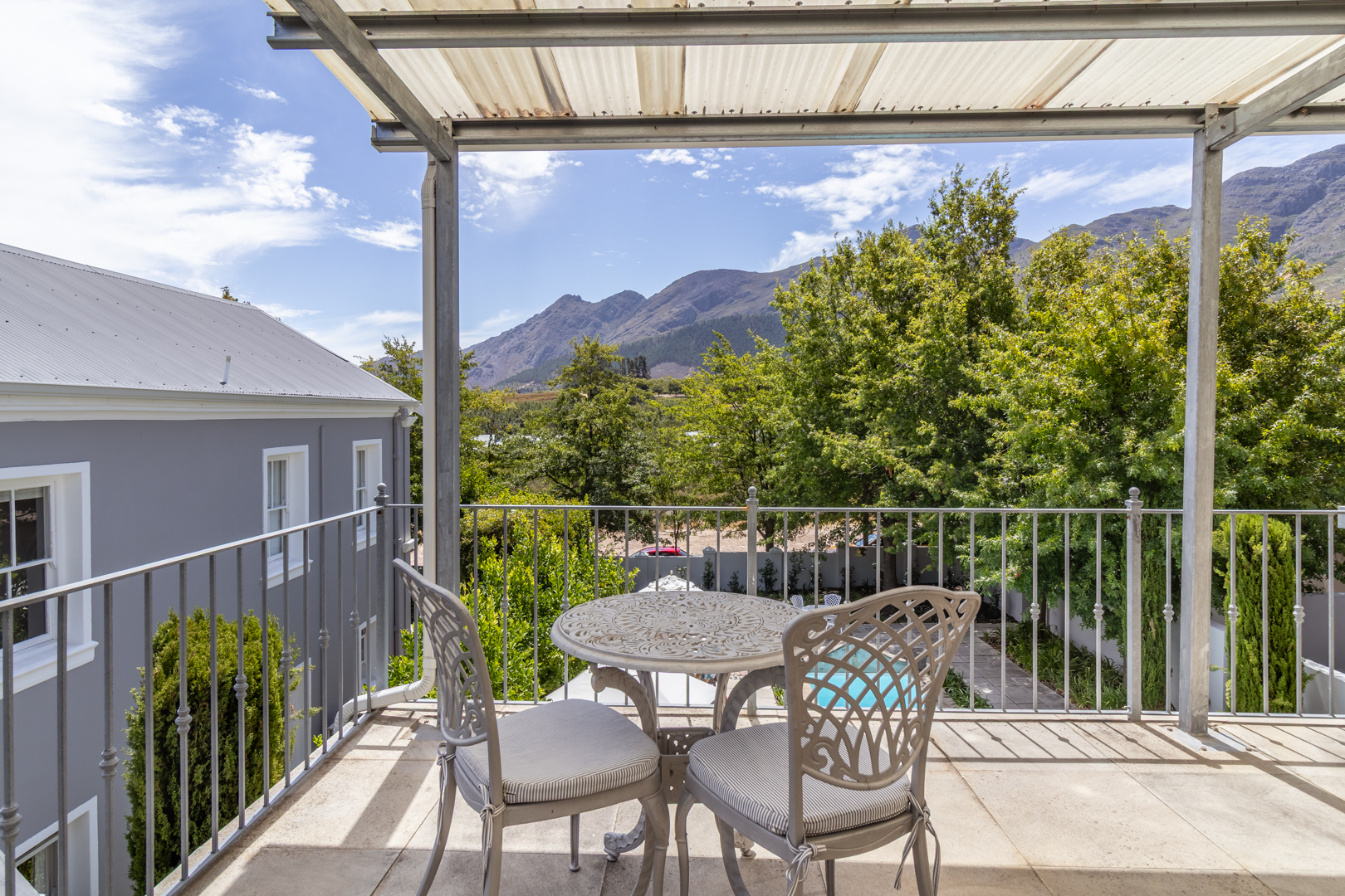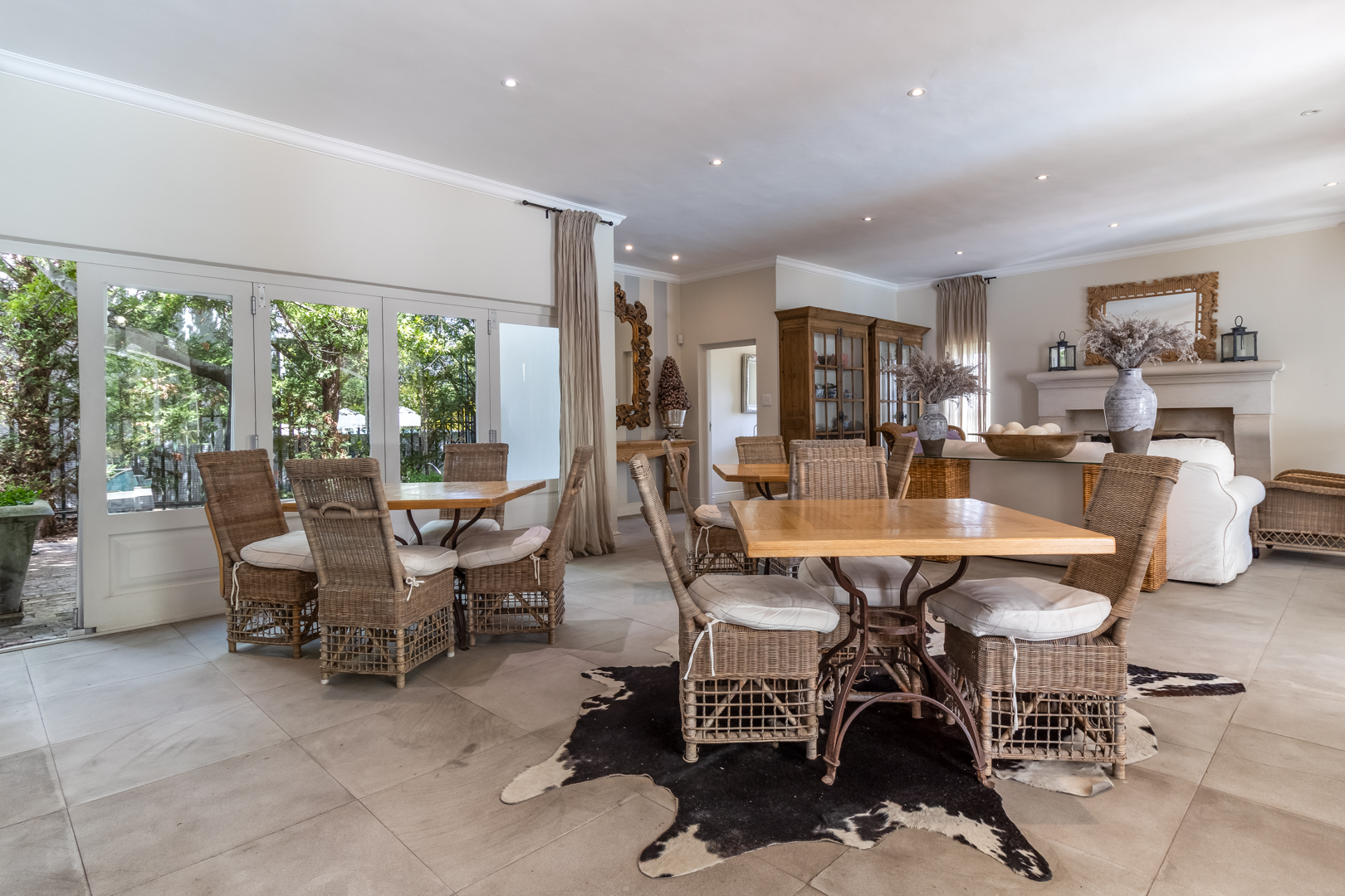 Fully furnished and thoughtfully designed, this elegant residence offers a seamless blend of comfort, style, and functionality. The spacious open-plan living area features a wood-burning fireplace and flows effortlessly into a gourmet kitchen and dining space, perfect for entertaining. A fully equipped scullery ensures added convenience, while the covered patio leads out to a private pool area with breathtaking views of the surrounding mountains. Each of the five en-suite bedrooms is beautifully decorated and includes air conditioning, a smart TV, and a Netflix subscription.