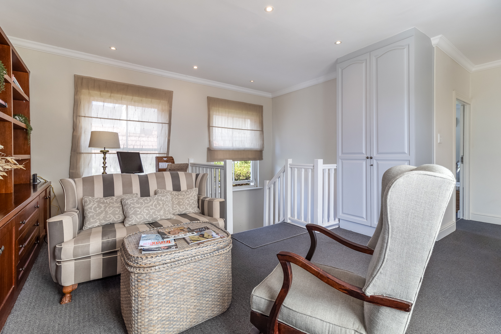 Upstairs, a cozy pyjama lounge offers an inviting second living area, and several bedrooms open onto balconies that showcase the region’s stunning scenery.