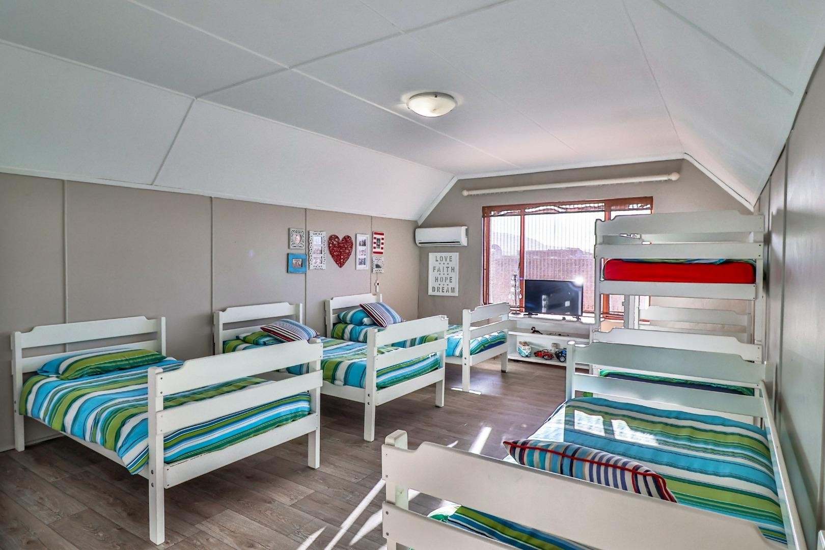 Built across two levels and lying within walking distance of the ocean, we invite you to have a closer look at this Franskraal home. Designed with holidays and entertaining in mind; the ground floor includes a sprawling, sheltered outdoor entertaining area, complete with a jacuzzi, built-in bar and braai which leads into a spacious open plan living and dining space with yet another built-in braai and adjacent modern, fitted kitchen. The first floor boasts two comfortable bedrooms, of which, the master bedroom is en-suite, and a family bathroom.