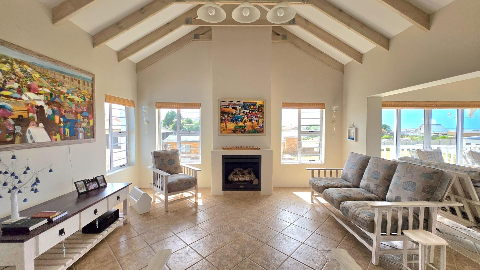 The kitchen offers an open-plan style with a pantry, making meal preparation a delight. The living area features a cozy gas fireplace and a built-in braai area with distant sea views, adding to the charm of this home. Enjoy the outdoors with a spacious balcony just off the kitchen, perfect for morning coffee or evening relaxation. A secondary balcony overlooks the courtyard at the back, complete with an outside shower for those sandy beach days.